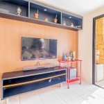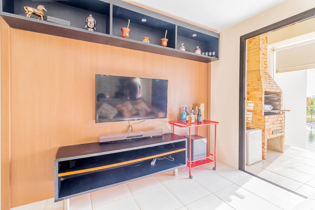 São 2 quartos (1 suíte) climatizados, sala de estar, cozinha completa e varanda gourmet com churrasqueira e vista para o lago!