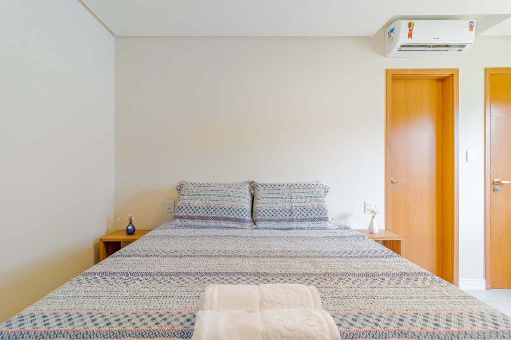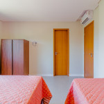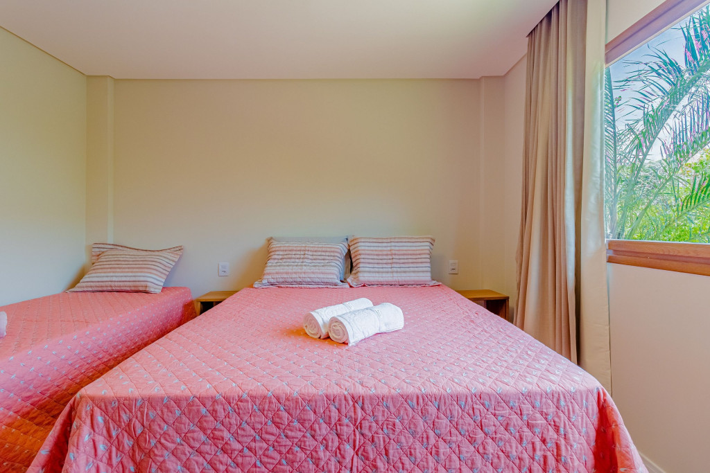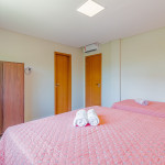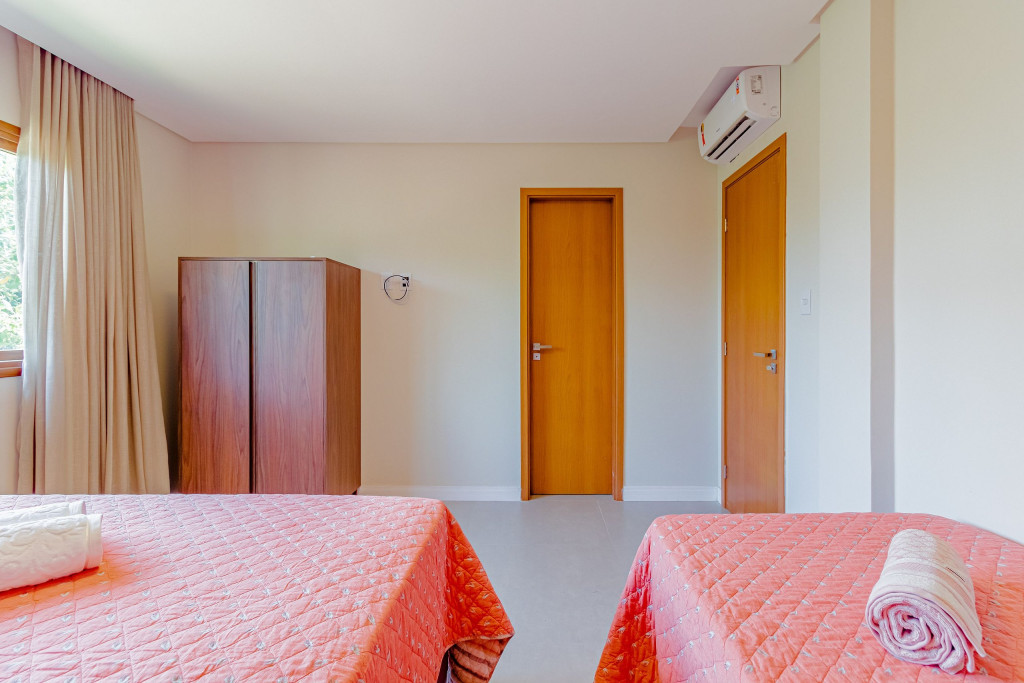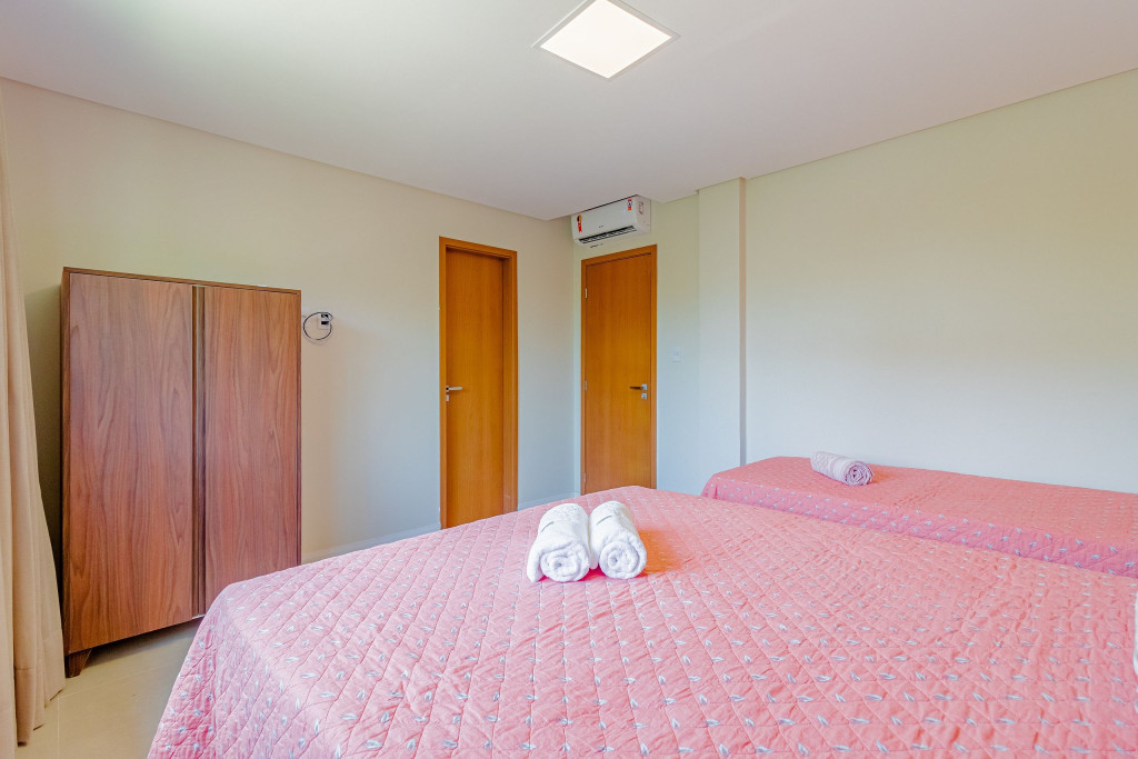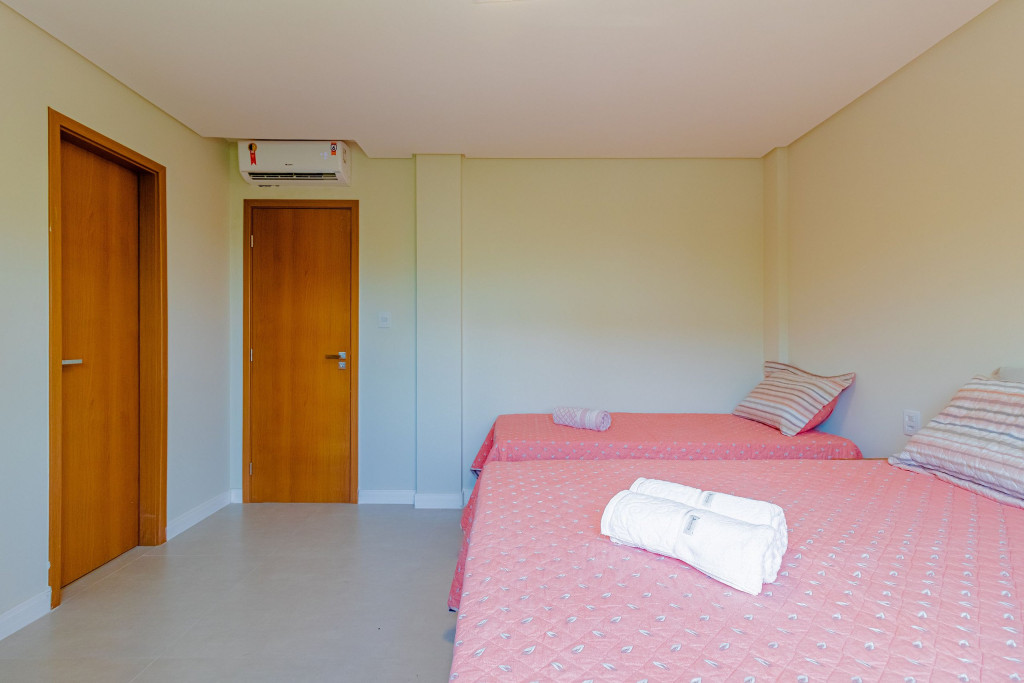 A composição dos quartos é da seguinte forma:Suíte 1 (Térreo): 1 cama queen, 1 bicama, ar condicionado split, armário e cortina blackout;Suíte 2 (Térreo): 1 cama queen, ar condicionado split, armário e cortina blackout;Suíte 3 (Superior): 1 cama queen, 1 bicama, ar condicionado split, armário e cortina blackout;Suíte 4 (Superior): 1 cama super king, ar condicionado split, armário, cortina blackout e Smart Tv;Suíte 5 (Superior): 1 cama queen, ar condicionado split, armário e cortina blackout.
