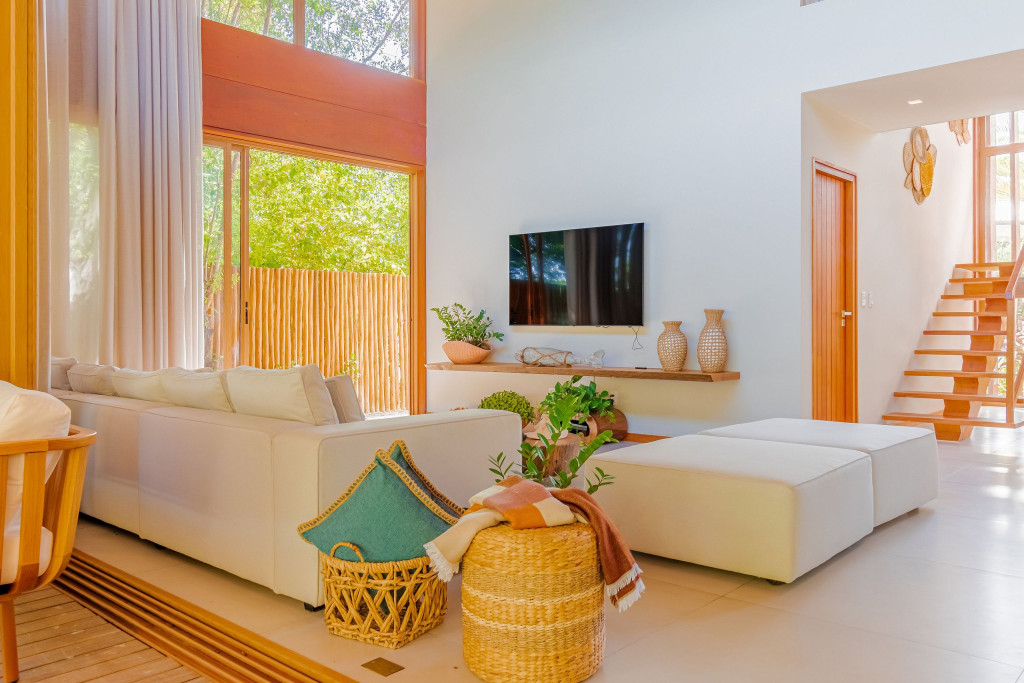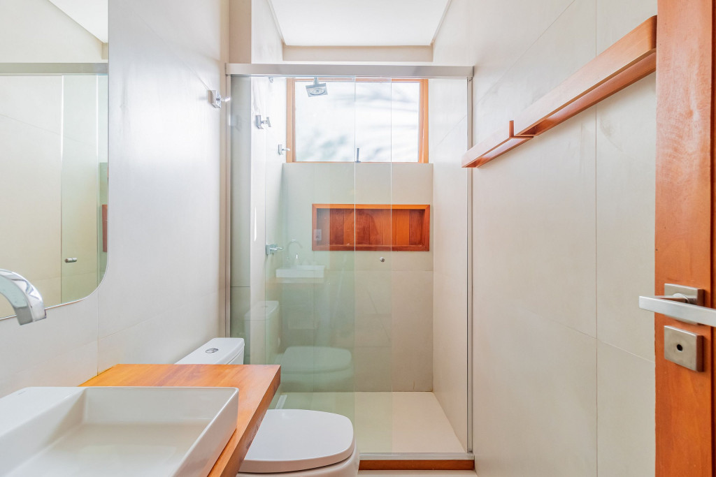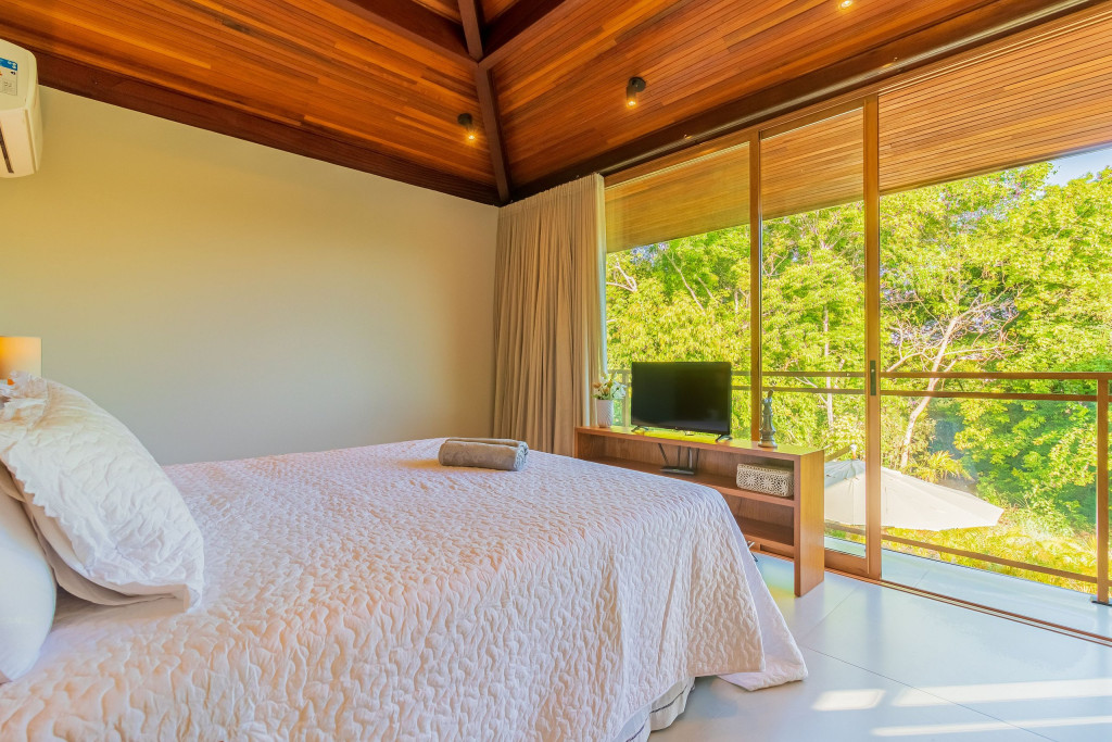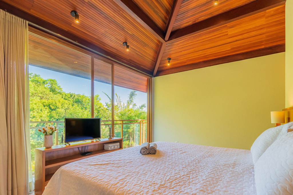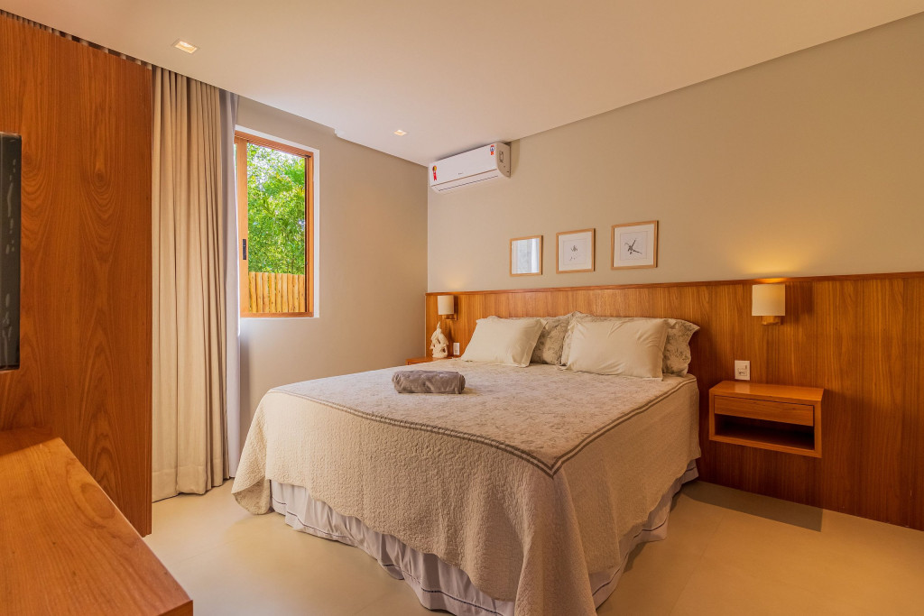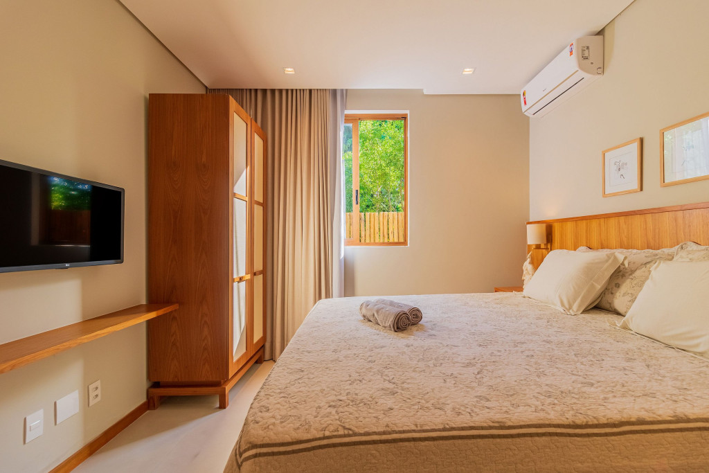 Suíte 1 (Térreo): 1 cama king com 1 auxiliar solteiro, ar condicionado split, cortina blackout, armário e Smart Tv;