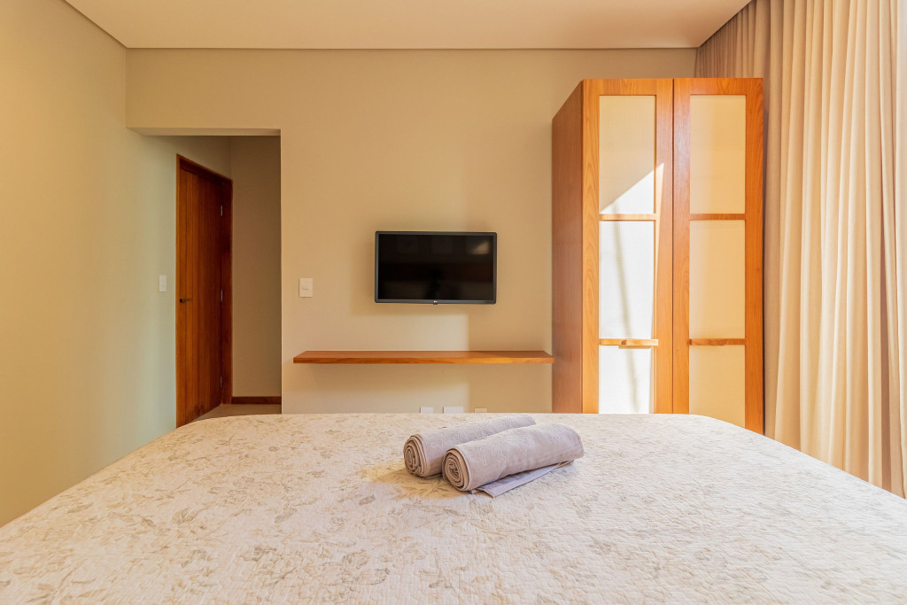 Suíte 2 (Superior): 1 cama queen com 2 auxiliares solteiro, ar condicionado split, cortina blackout e armário;Suíte 3 (Superior): 1 cama king com 2 auxiliares solteiro, ar condicionado split, cortina blackout e armário;Suíte 4 (Superior): 1 cama queen com 1 auxiliar solteiro, ar condicionado split, cortina blackout, armário e Smart Tv;Suíte 5 (Superior): 1 cama king com 2 auxiliares solteiro, ar condicionado split, cortina blackout, armário e Smart Tv.