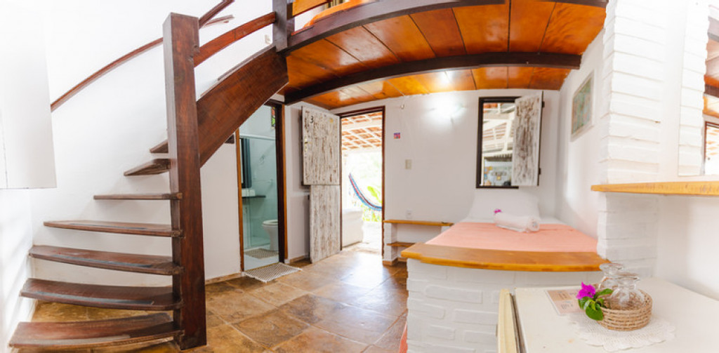 Ideal para casais com um filho ou solteiros, o mesmo dispõe de uma cama de solteiro no primeiro piso e subindo as escadas no mezanino possui uma cama de casal.