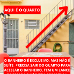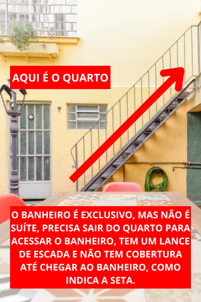 Só para avisar... Tem 1 lance de escada ; ) O banheiro é exclusivo, mas não é suíte, precisa sair do quarto para acessar o banheiro, tem um lance de escada e não tem cobertura até chegar ao banheiro.