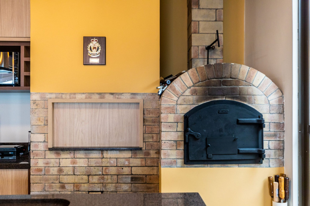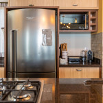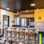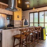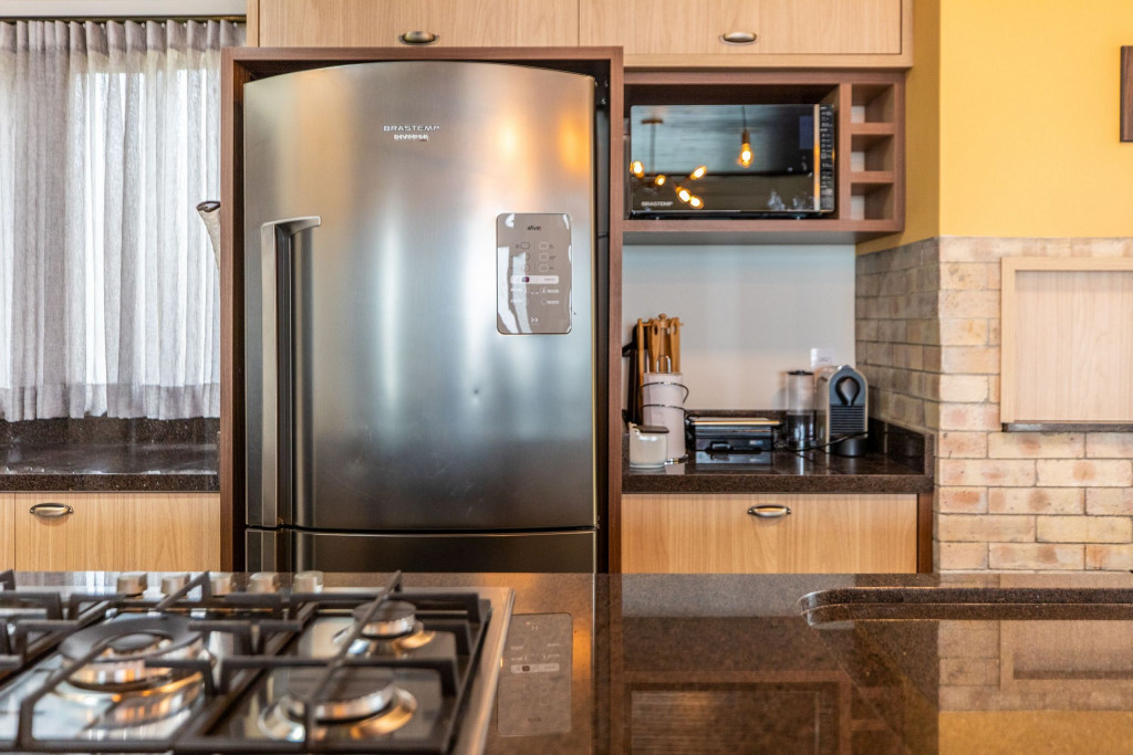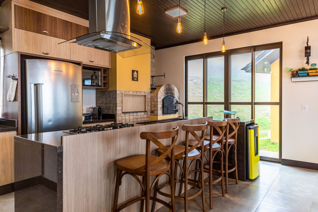 Cozinha completa com cooktop, forno elétrico, micro-ondas, refrigerador, cervejeira, pia com área gourmet, e bancada para refeições.