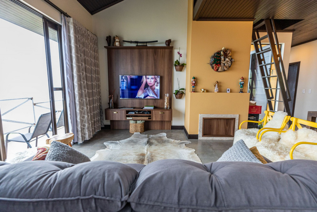 Na Sala de estar temos uma linda lareira, com sofá grande e Smart-TV.