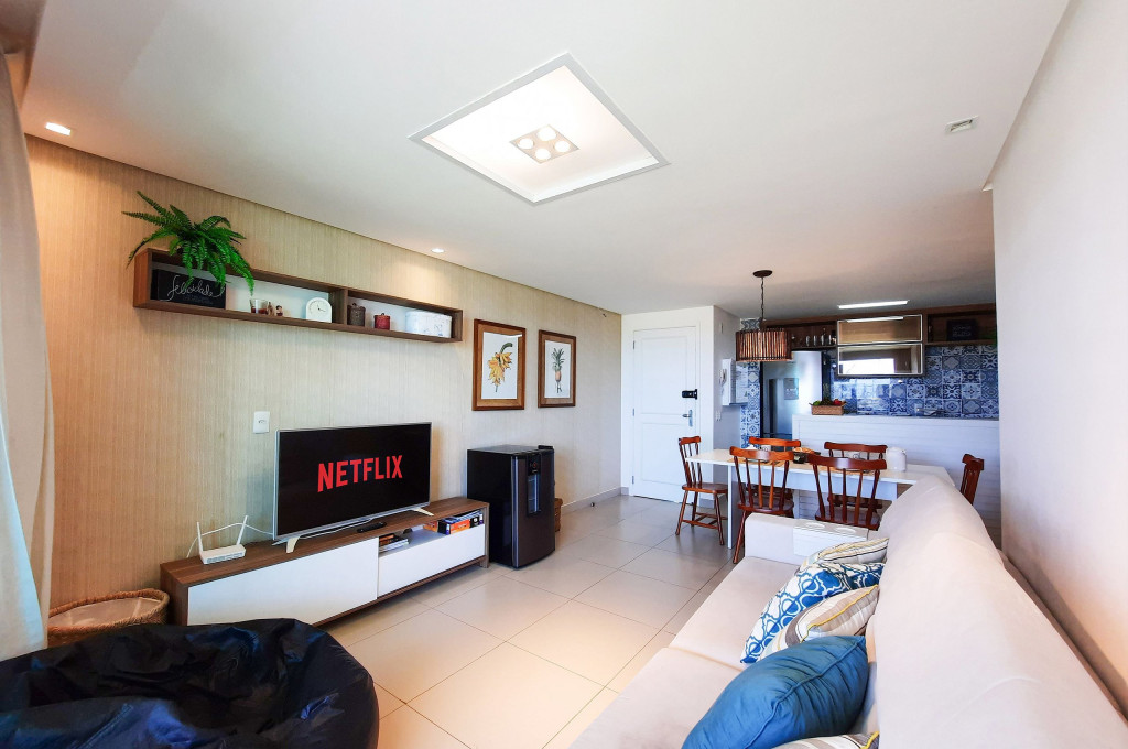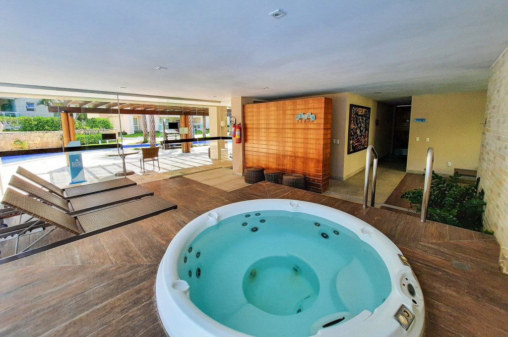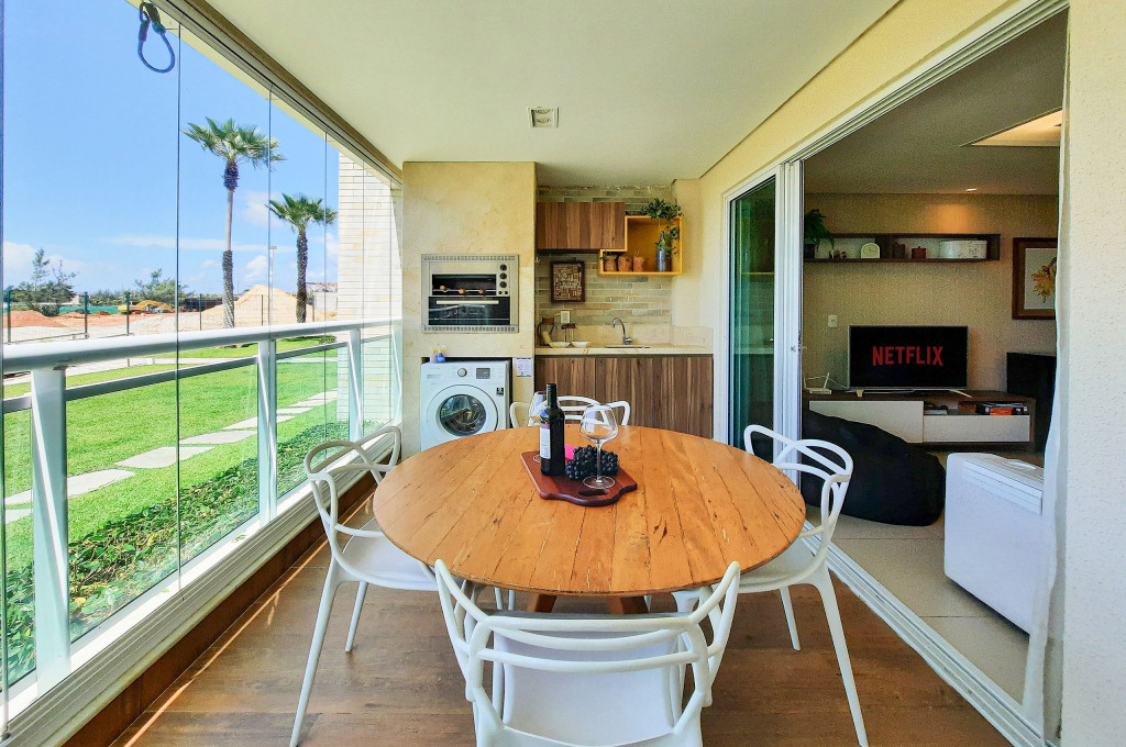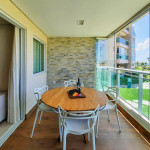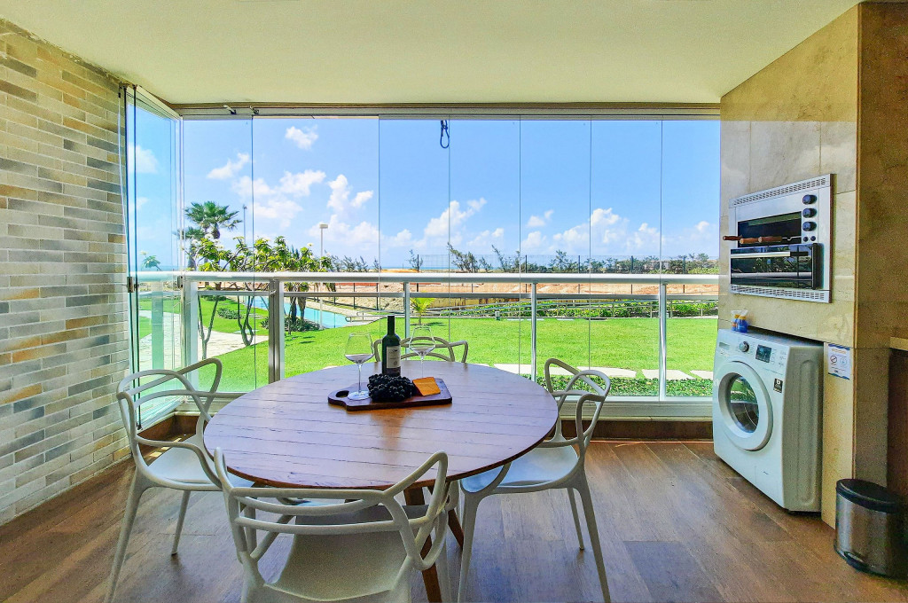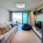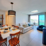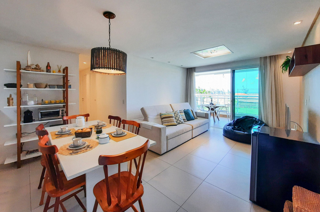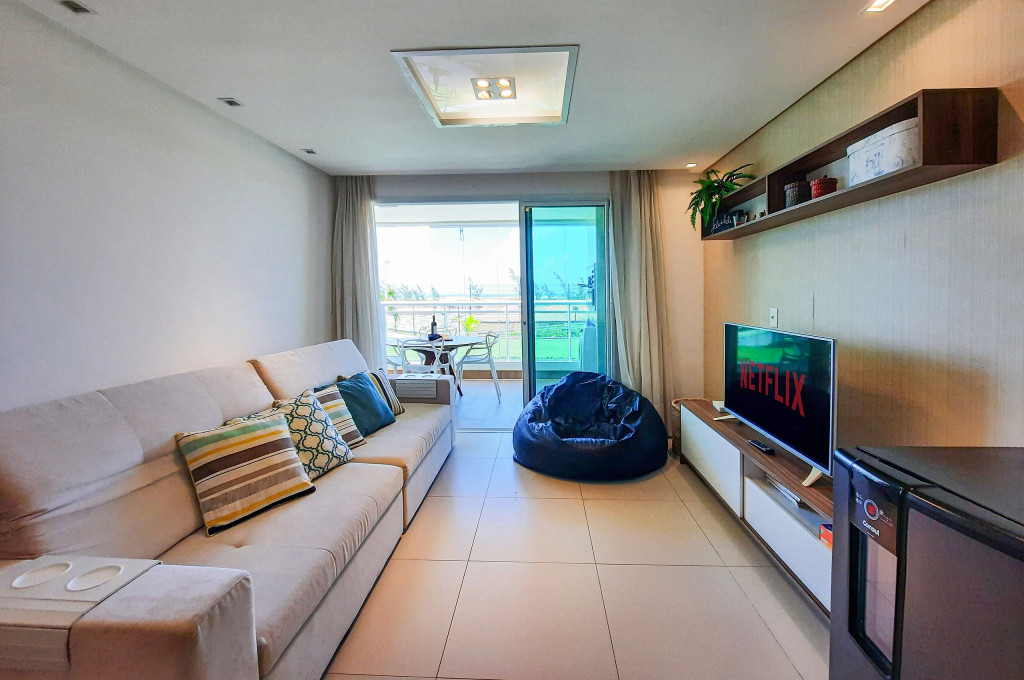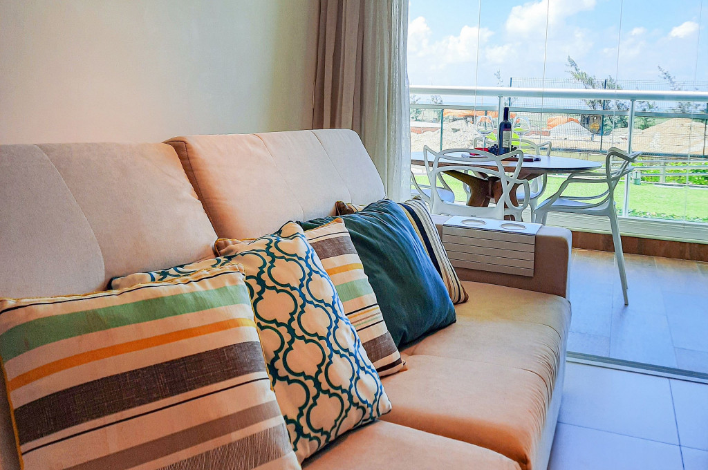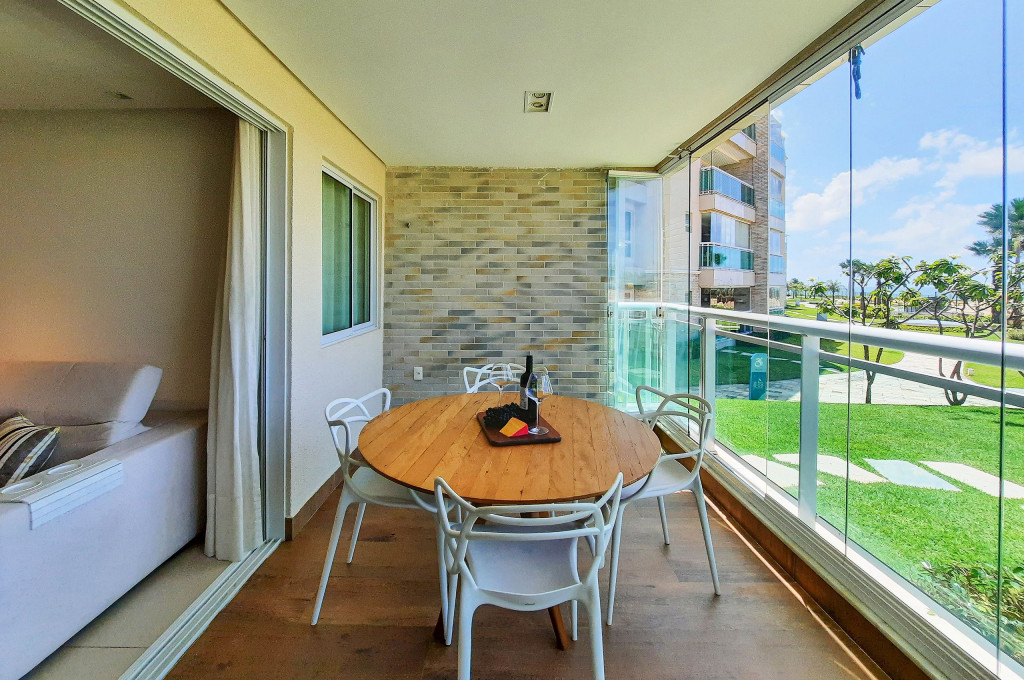 Sofisticado apartamento no Rivera Beach Place, 1 suíte master, 2 quartos e Quarto de Apoio com Banheiro (DCE), com 87 m² de área, localizado no térreo (posição nascente), ao lado da piscina, perfeito para descansar após um dia de praia. Quartos possuem Ar Condicionado e Cortina Blackout. Sala com sofá amplo, TV Tela Grande Smart e Wi-Fi de alta velocidade. A varanda é um charme, possui acesso direto ao jardim, com Churrasqueira Elétrica (Grande), bancada, armários e Máquina de Lava Roupas. A cozinha é super completa, com excelentes elétrodomesticos e utensílios.