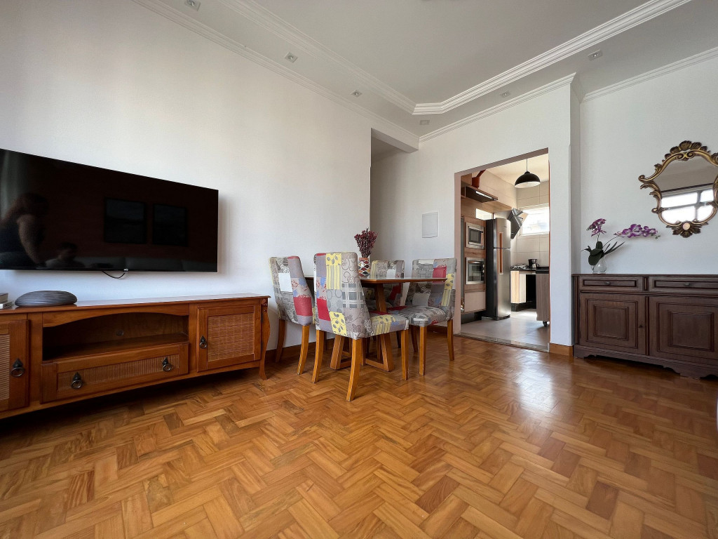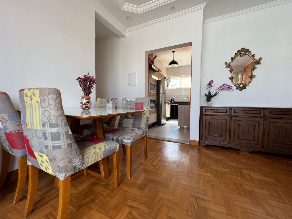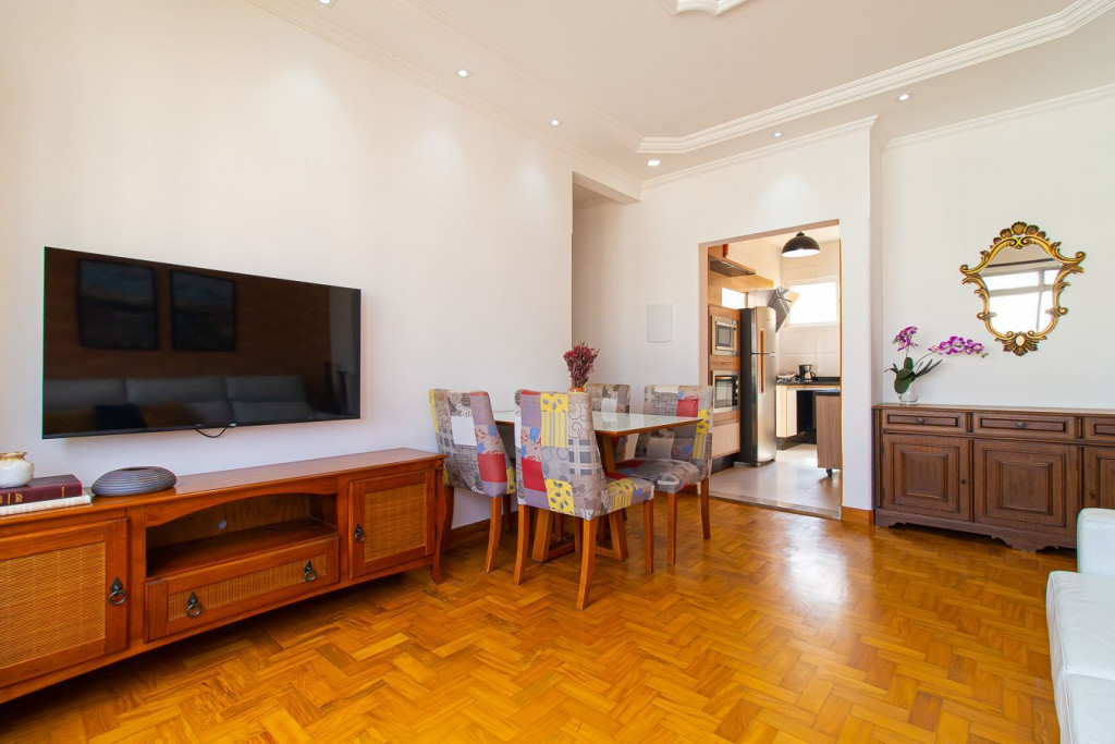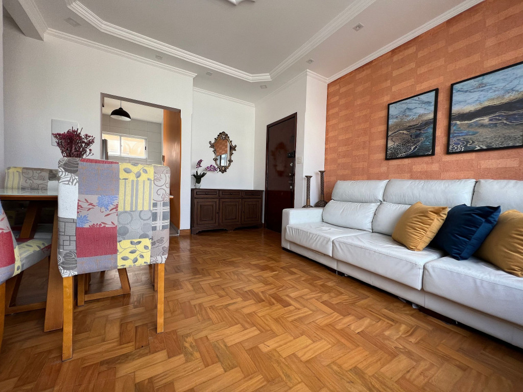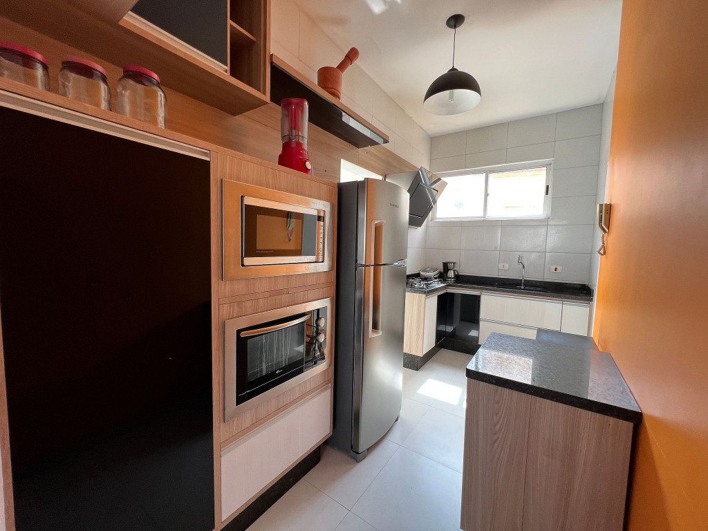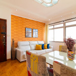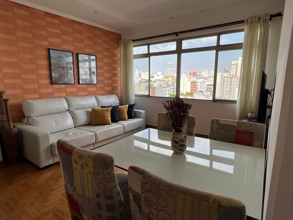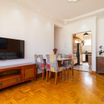Apartamento de dois quartos confortáveis e decoração acolhedora. Conta com uma ampla sala de estar e jantar e uma cozinha completa.