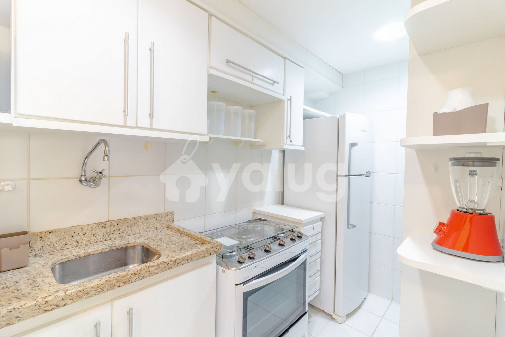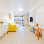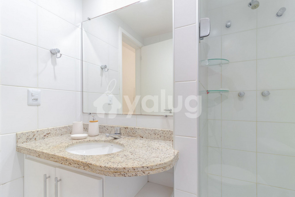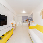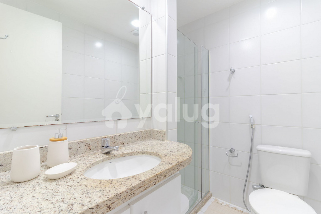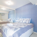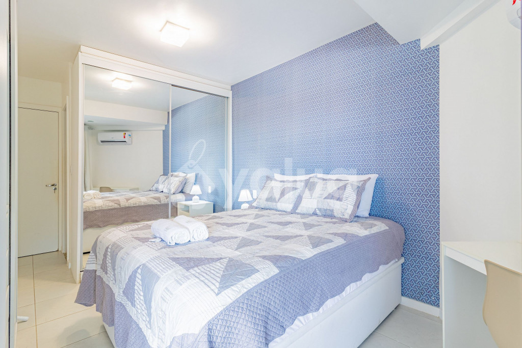 A composição do quarto é da seguinte forma:Suíte 1: 1 cama Queen, ar condicionado tipo Split, Smart Tv, cortina blackout e armário.OBS: Sofá-cama casal na sala.