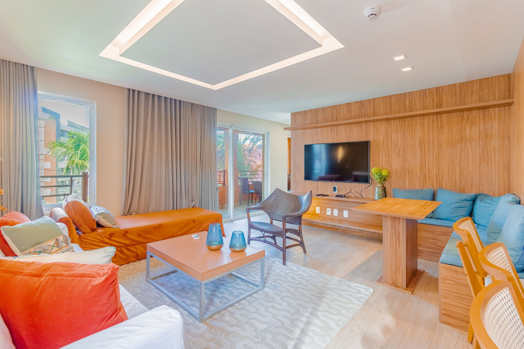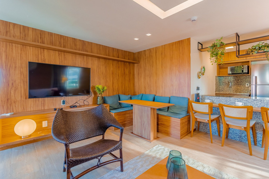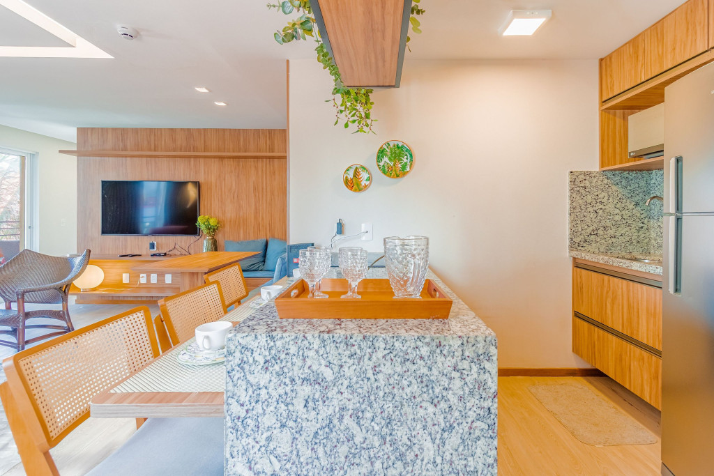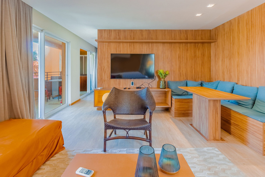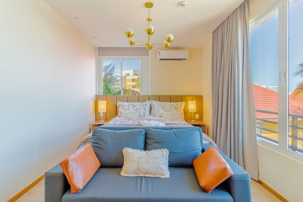 A composição dos quartos é da seguinte forma:Suíte 1: 1 cama queen, 1 sofá-cama, ar condicionado split, armário, frigobar, cortina blackout e Smart Tv (c/ tv a cabo).