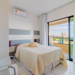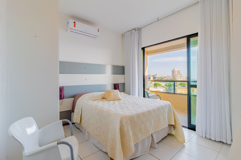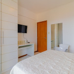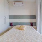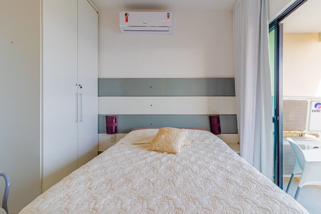 O quarto é composto por 1 cama casal, ar condicionado split, cortina blackout, armário, e Smart TV c/ SKY.