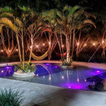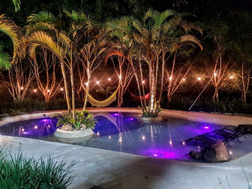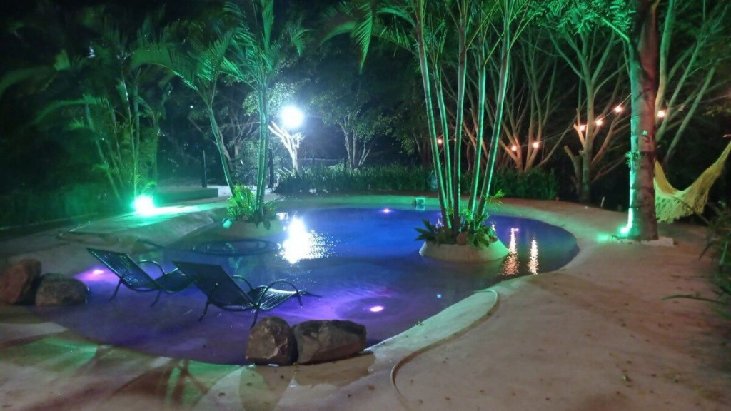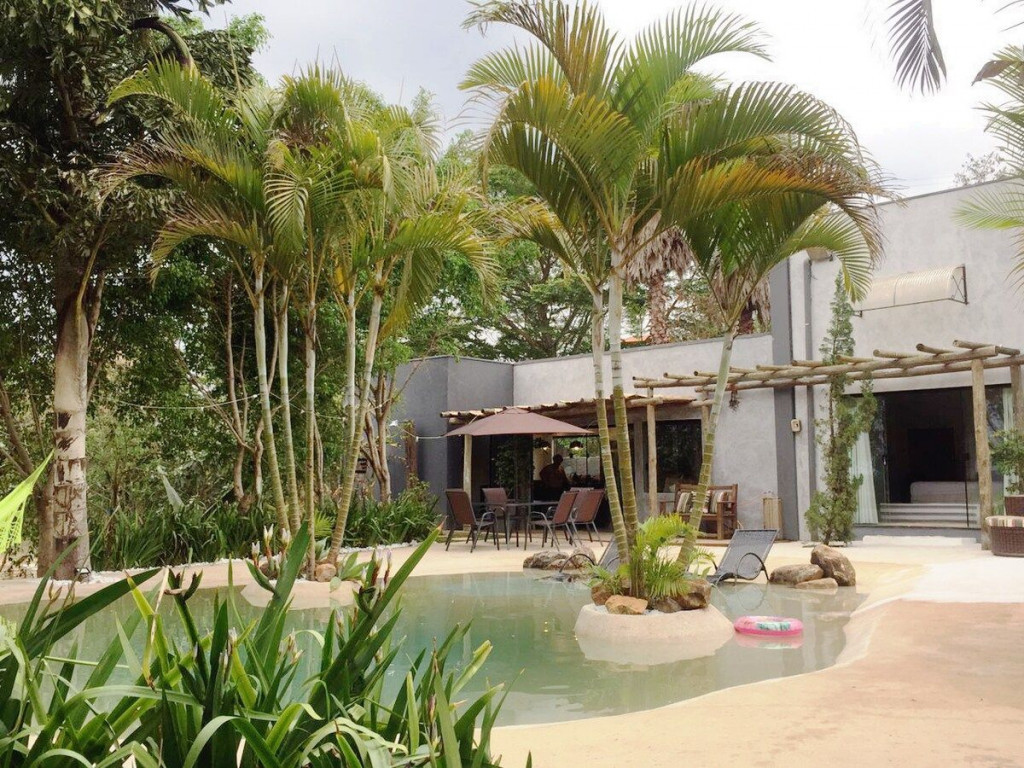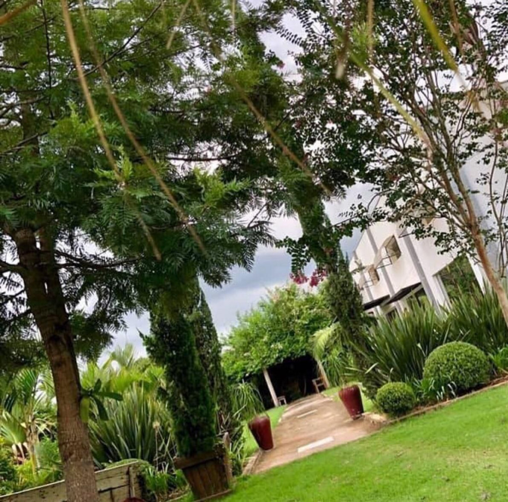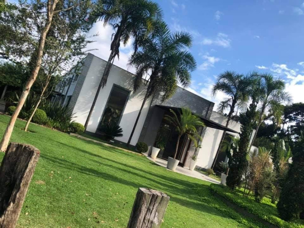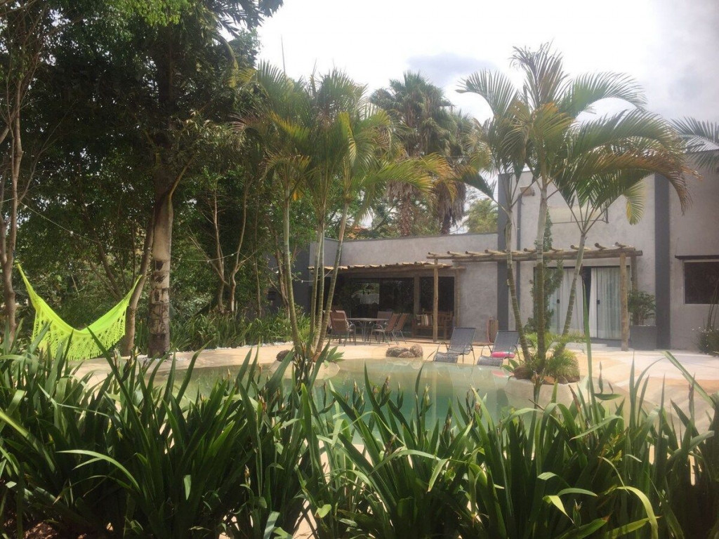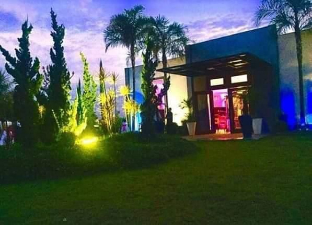 Salão de festas com espaço para cerimônias ao ar livre, integrado a natureza e um belo jardim todo gramado,com 2 piscinas e 1 jacuzzi