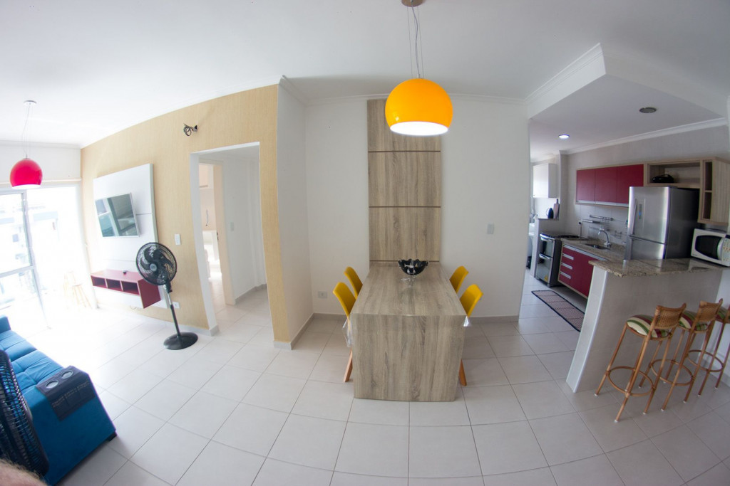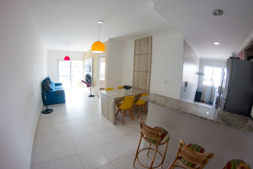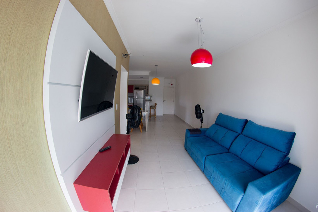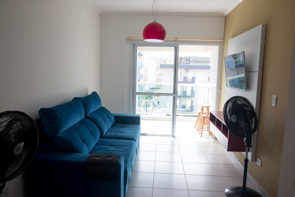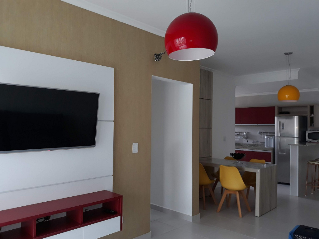 02 dormitórios com ar condicionado02 banheiros (sendo 01 na suíte)Sala com televisor 42’’Churrasqueira na sacadaSacada frente para rua / Vista lateral para praiaComprimento da vaga 9,30mts para os 2 veículos, considere o engate, caso tenha.