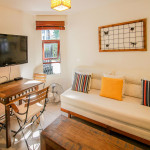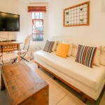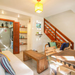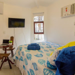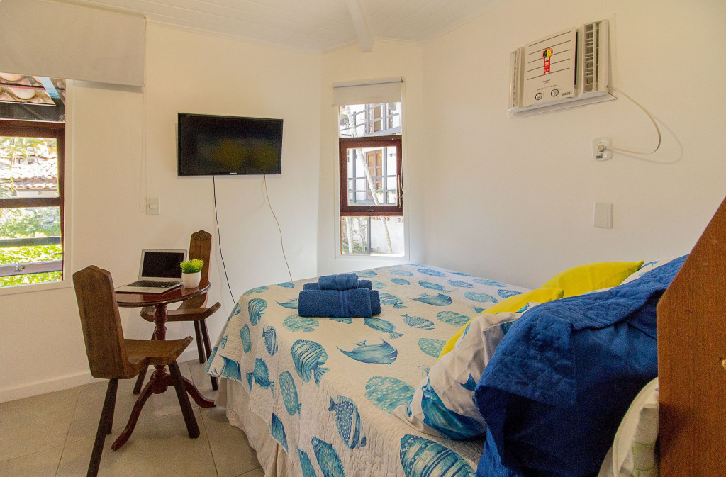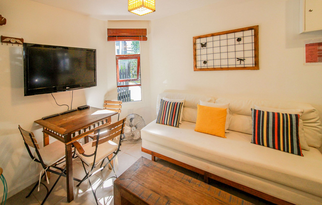Composta de Varanda no primeiro andar, sala aconchegante, cozinha americana completa e compacta, dois quartos com ar condicionado, 2 banheiros, TV LCD a cabo (na sala), WI FI FIBRA 400 MB e pequena churrasqueira particular da casa. TVs LCDs nos quartos com canais abertos.Quarto 1 - 1 cama box de casal tamanho padrão (colchão macio médio) e 1 cama de solteiro (colchão macio médio) suspensa em cima do armário, TV (canais básicos), ventilador de teto e ar condicionado.Quarto 2 - cama beliche de casal (colchão macio médio) feita com madeira de demolição e projetada por arquiteto. Dormem 2 pessoas leves em cima e 2 pessoas embaixo, tem TV (canais básicos) e ar condicionado e pequeno ventilador portátil.Cozinha- compacta, porém, completa , com microondas, sanduicheira, cafeteira, liquidificador e todos os utensílios necessários.Sala - com TV LCD com OI TV (canais a cabo), ventilador, sofá grande e outro sofá pequeno, pequena mesa com três cadeiras. Não oferecemos ar condicionado na sala, somente nos quartos.Banheiros com chuveiro elétrico e box de blindex temperado. Condomínio familiar, arborizado, super bem localizado, com excelentes funcionários. Casa limpa, reformada, tudo funcionando, completa e com infra estrutura. O Condomínio possui 2 piscinas e 1 sauna. As piscinas são do Condomínio, compartilhada com outras pessoas. O estacionamento é dentro do Condomínio e é rotativo. É possível estacionar também em frente ao Condomínio com segurança e de forma gratuita. Não é possível estacionar mais de 1 carro dentro do Condomínio, somente se estiver vazio.