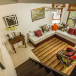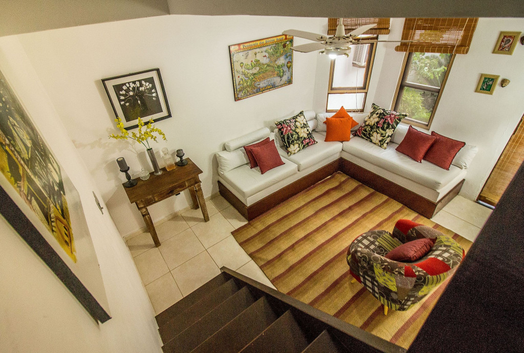 Casa Duplex composta no primeiro andar de varanda, sala aconchegante com sofá, ventilador de teto.