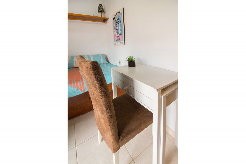 2º Quarto com uma cama de casal (tamanho viúvo - colchão um pouco mais maci), varanda, ventilador de teto e mesa para trabalho/estudo. No segundo andar temos ainda mais um banheiro.