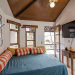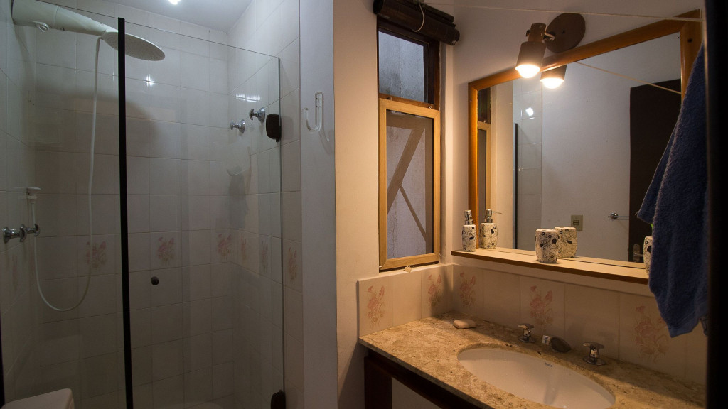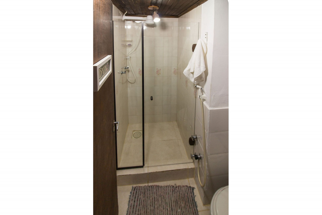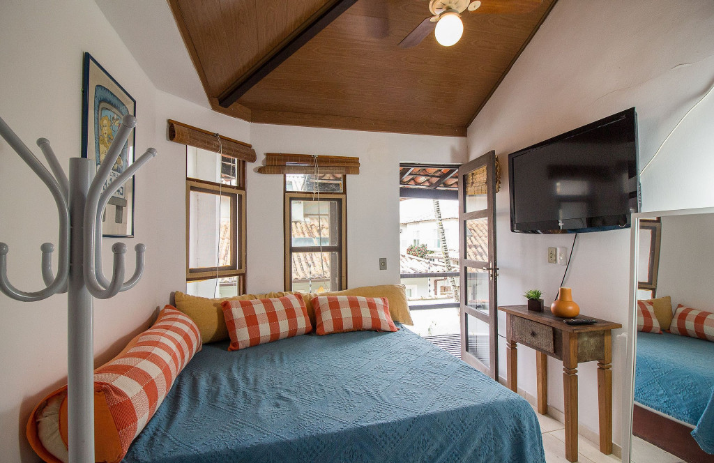 1º Quarto com cama de casal tamanho King (colchão mais rígido), armário, varanda, ventilador de teto e TV LCD (canais básicos).