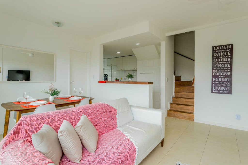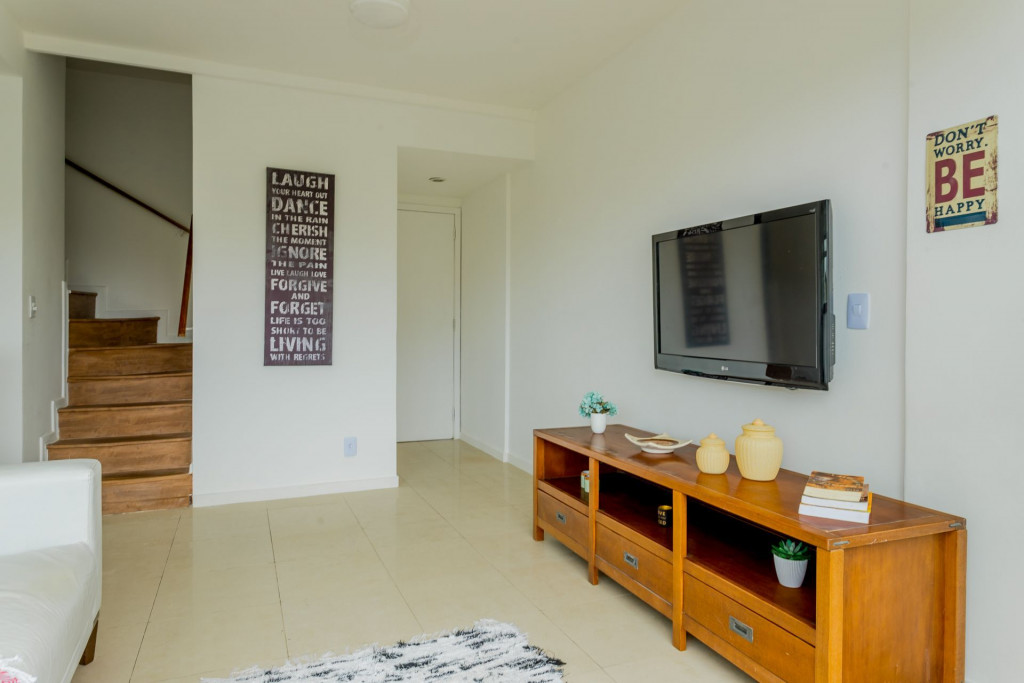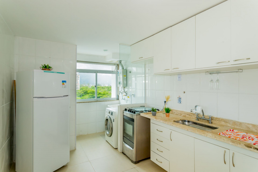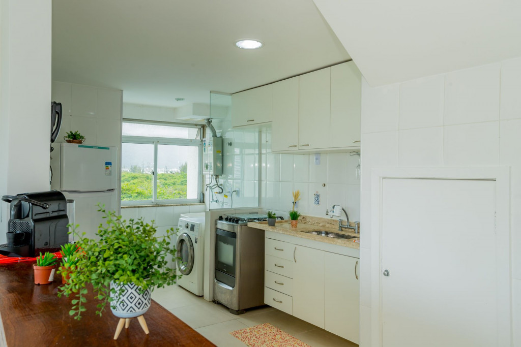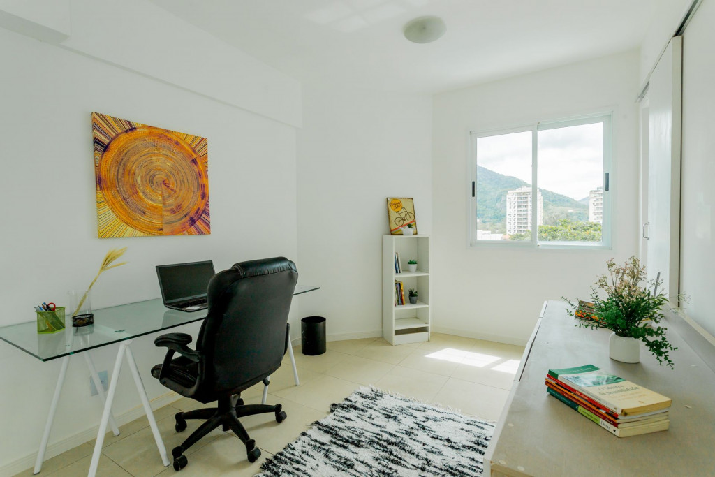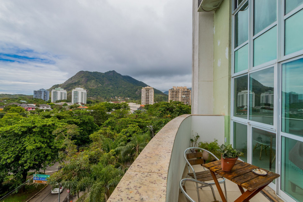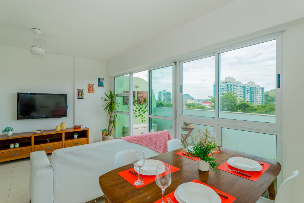 Apartamento Duplex com decoração clean e aconchegante, com uma vista incrível da varanda para o verde da montanha recheada de arvores nativas.O primeiro andar é composto por uma arejada sala com TV SMART, mesa de jantar para 4 pessoas, cozinha completa integrada à sala e um pequeno lavabo. A sala dá acesso à varanda com vista livre para verde. No mesmo andar tem um escritório montado para o seu home office com boa internet, mesa de trabalho, cadeira apropriada e estantes para livros. Dentro do escritório ainda tem um pequeno banheiro com chuveiro. Ou seja, perfeito!A cozinha é completa com geladeira, fogão, panelas, utensílios, eletrodomésticos, como liquidificador, sanduicheira, cafeteira, louças em geral, talheres, tudo para receber bem os hospedes que gostam de preparar saborosas refeições e se reunir com amigos.Área de serviço com máquina de lavar roupa e tanque.O segundo andar é composto por 3 quartos.- 1º Quarto é uma suíte com cama de solteiro, amplo armário, black out nas cortinas, ventilador de teto. Banheiro com chuveiro e box blindex.- 2º Quarto tem cama de casal confortável, amplo armário, black out nas cortinas, ventilador de teto.- 3º Quarto tem cama de casal confortável, amplo armário, persiana translúcida e ventilador de teto.- No corredor que leva aos quartos tem mais um banheiro com chuveiro e box blindex.Destaques: o apartamento possui 4 banheiros. Dois banheiros completos e dois lavabos. Todos os quartos tem janelas de vidro que vão do chão ao teto, o que deixa os ambientes iluminados e bastante arejados.Somos pet friendly. Aceitamos somente 1 pet por reserva, de pequeno porte (até 10 kg) e cobramos uma taxa única pelo pet.O apartamento é perfeito para hospedar famílias, grupos de amigos, pessoas que vem a trabalho ou negócios e que querem desfrutar dos encantos do Rio de Janeiro e do Bairro Recreio e Barra da Tijuca. Ele é de frente para uma vista verde e livre que acalma e traz paz para a sua estadia. Prédio seguro, familiar, totalmente residencial, com portaria 24 horas funcionando.
