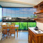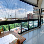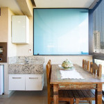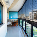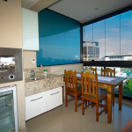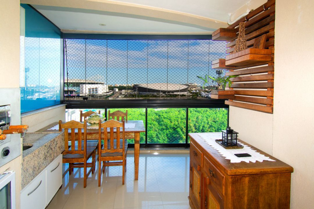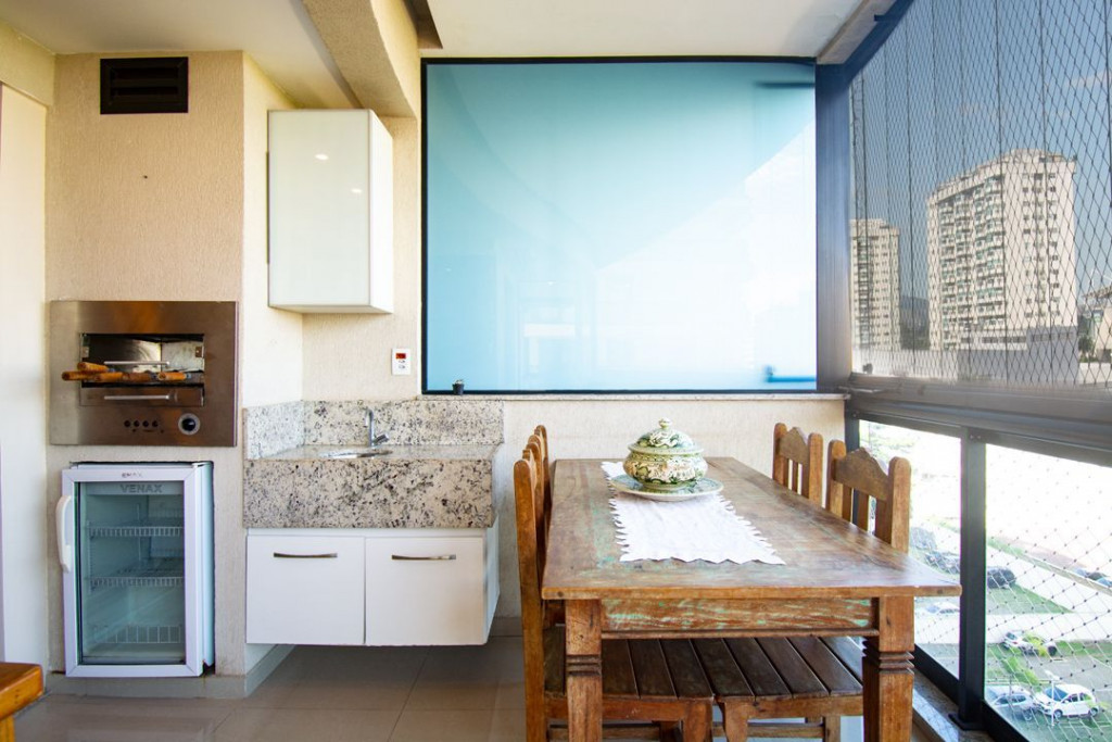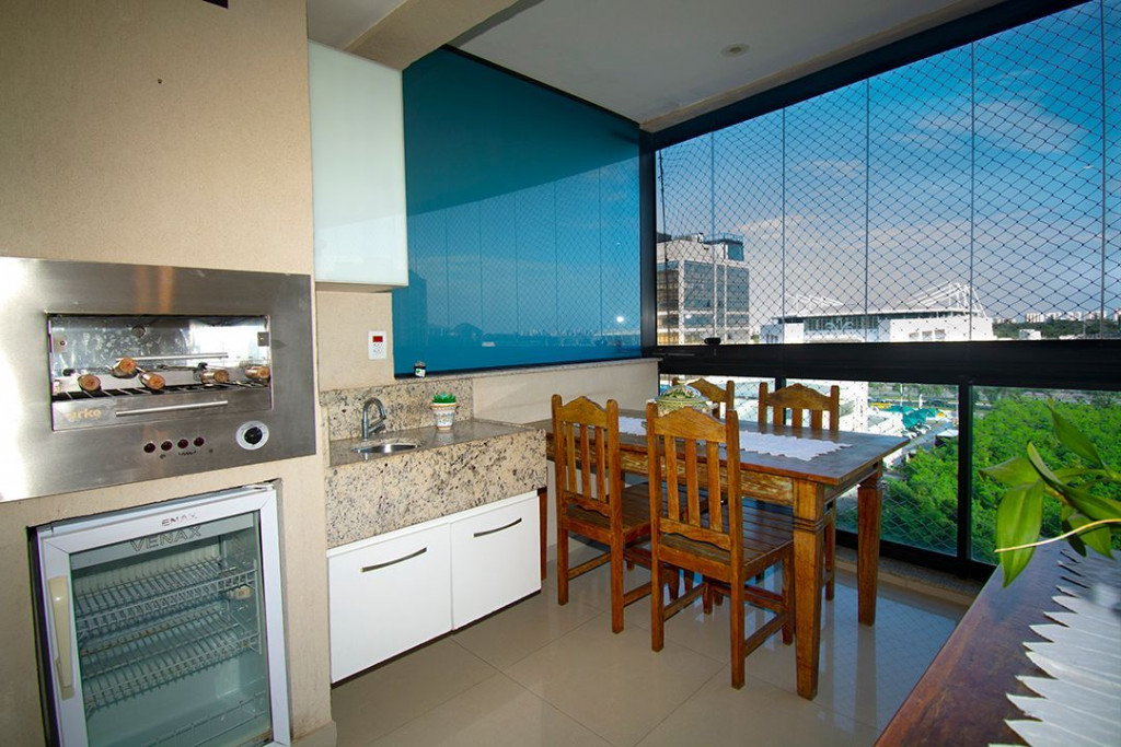 Varanda Gourmet: Ampla, com cortina de vidro, mesa de refeições/trabalho/estudo para 5 pessoas ou para uso do computador pessoal do hóspede. Churrasqueira elétrica, frigobar.