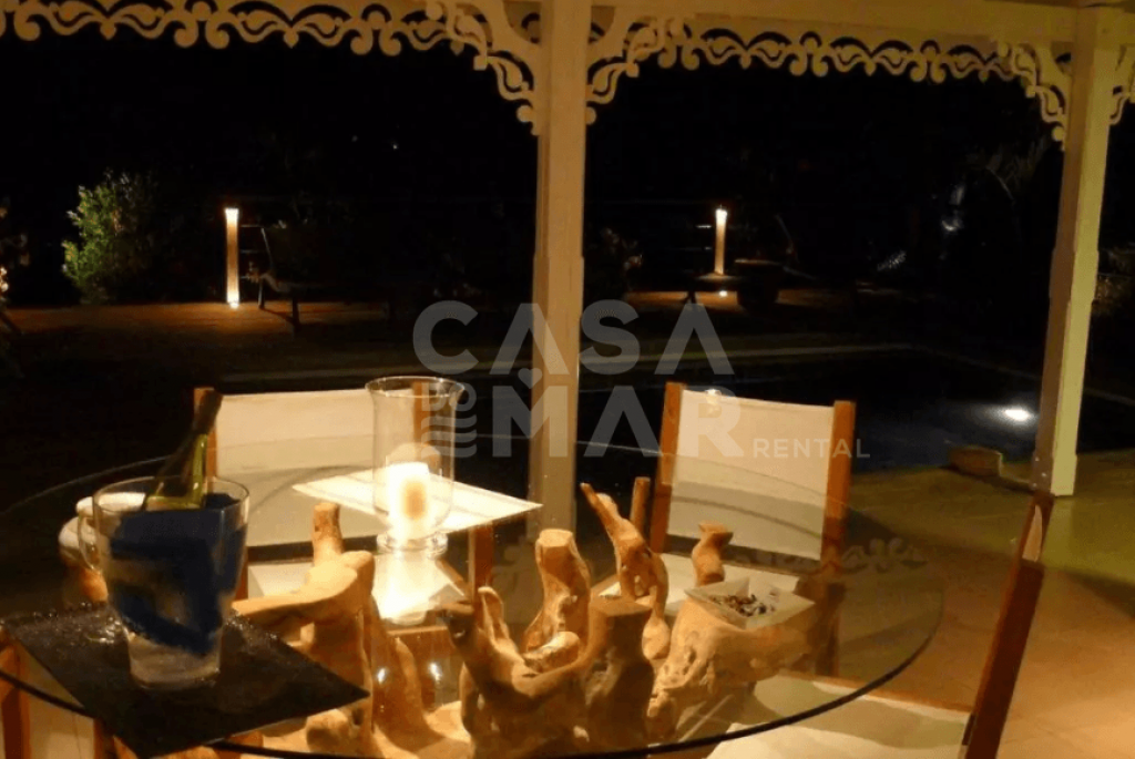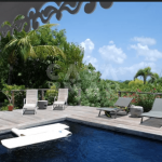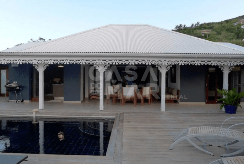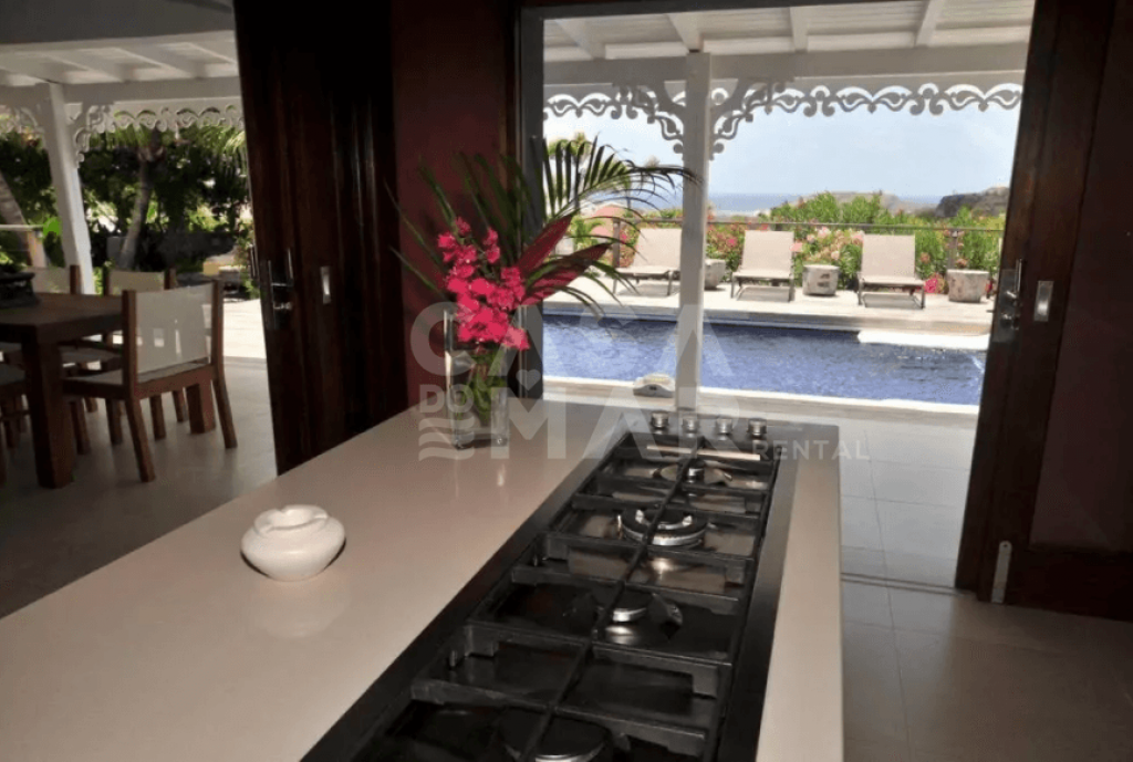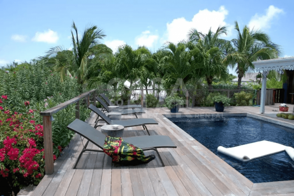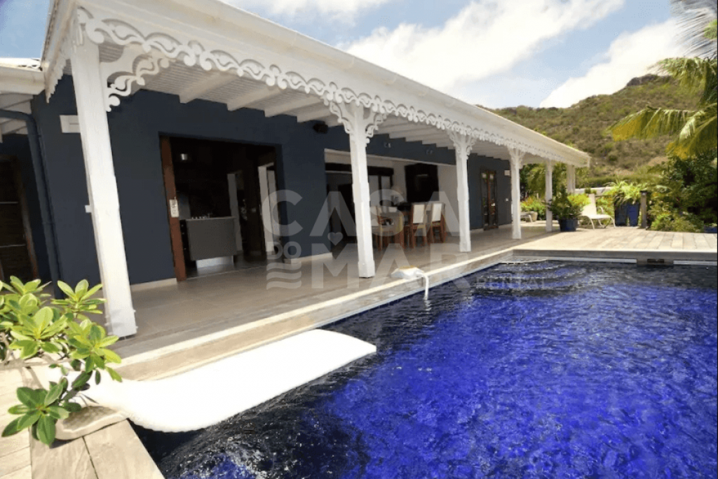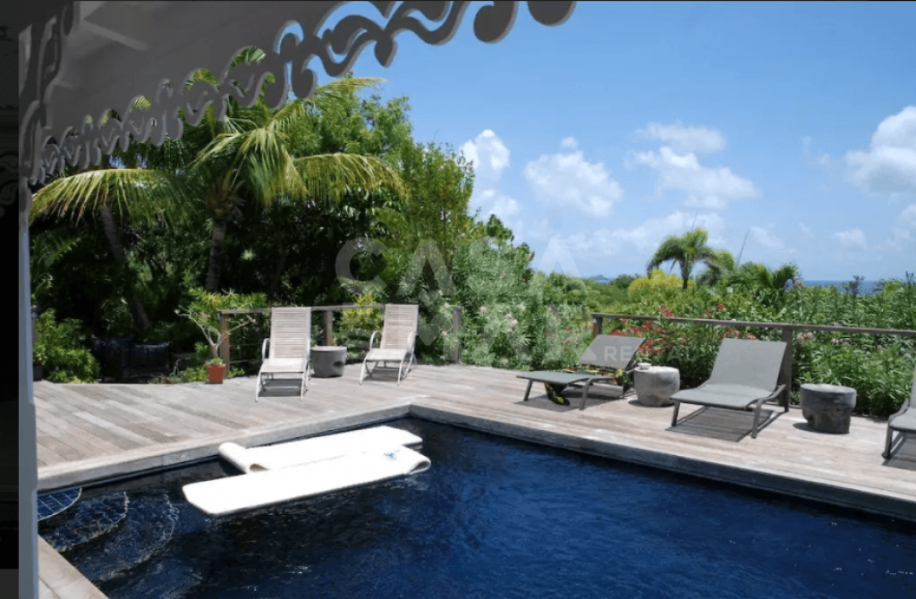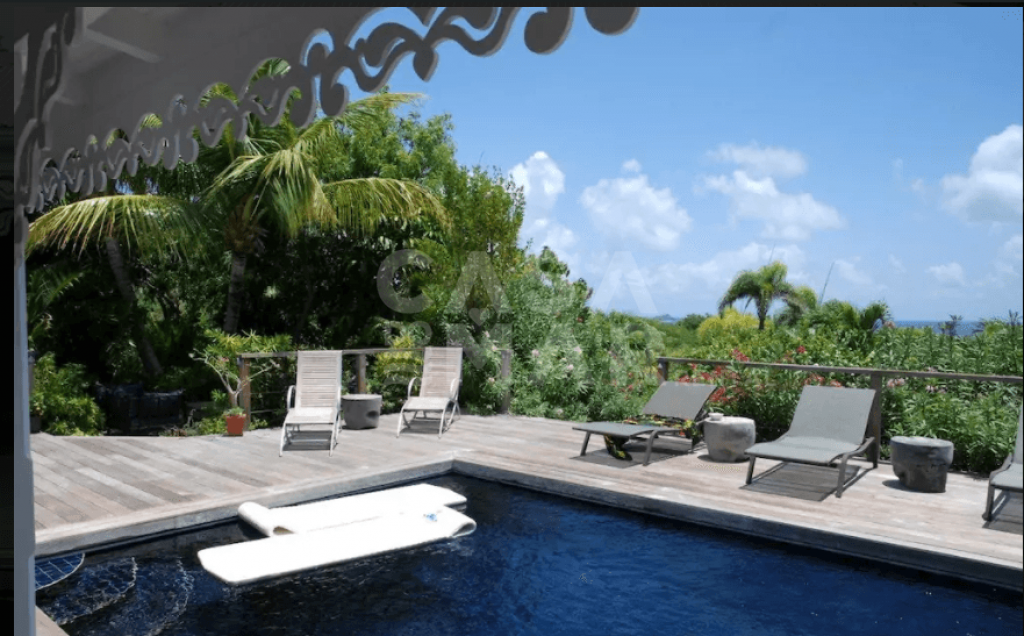 Totalmente renovada. 3 quartos e 3 banheiros (6 pessoas) em meio a um lindo jardim tropical com mais de 2.200m2 e vista para Grand e Petit Cul de Sac. Áreas sociais interna e externa. com um grande deck e piscina. Ar condicionado, clara e muito ventilada, muito bem decorada, portas de vidro voltadas para terraço, com vista para a piscina e para o mar de um lado e para jardim interno de outro. TV com conexão a satélite norte Americano, Internet sem fio (Wi-Fi), ligação para iPod, DVD & CD. Varanda aberta com mesa de jantar para 6 pessoas, Wi-Fi, ventilador no teto, plantas e caixas de alto-falantes.
