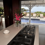 Cozinha gourmet totalmente equipada com vista para varanda e piscina. Geladeira e freezer, micro-ondas, fogão, forno, torradeira, máquina de café expresso e normal, máquina de lavar pratos e churrasqueira a gás.