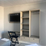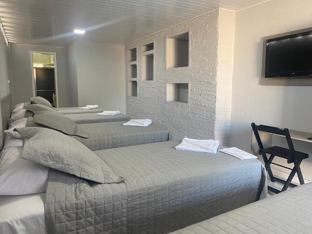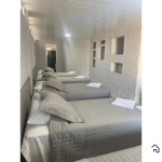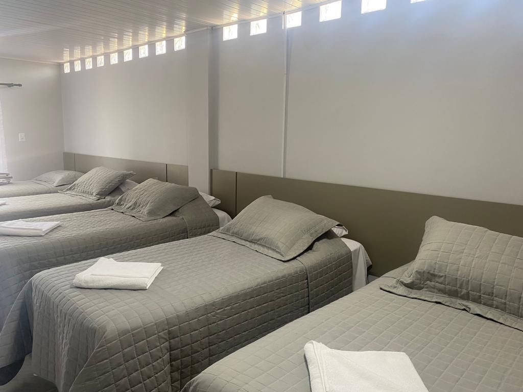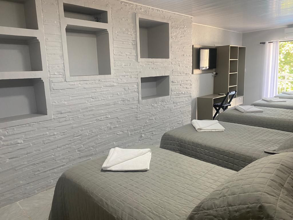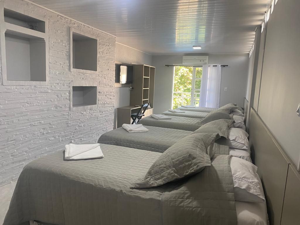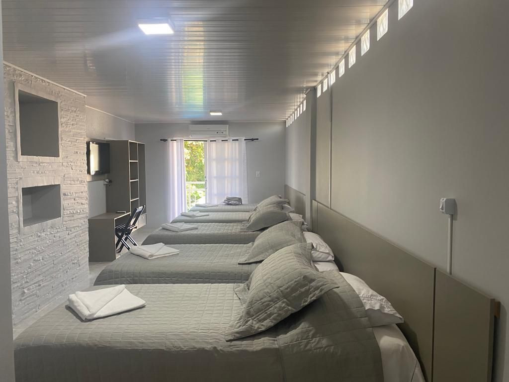 O quarto contém 05 camas de solteiro sendo 02 com camas auxiliares. Assim comportando até 07 pessoas. Chuveiro elétrico e uma mesa para trabalho e/ou estudos. Todos os quarto contém enxoval 150 fios que proporcional conforto e qualidade.
