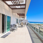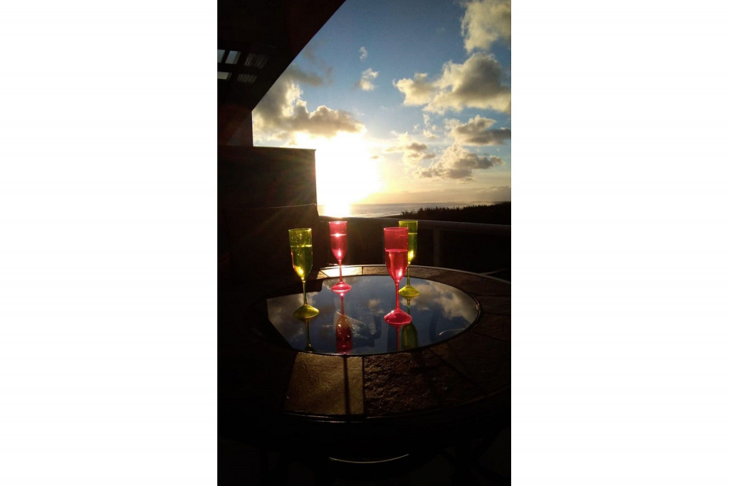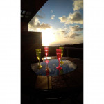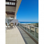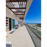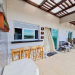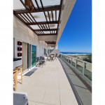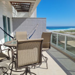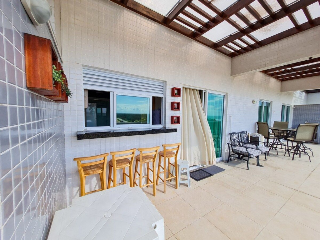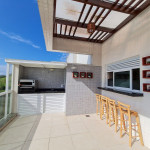 AMBIENTE 4 - VARANDA GOURMET Nosso espaçoso terraso na cobertura com vista mar conta com churrasqueira, acessórios de churrasqueira, pia, bancada com cadeiras altas, mesa de quatro lugares com cadeiras alta e mais duas cadeiras baixas, além de uma rede para descansar.