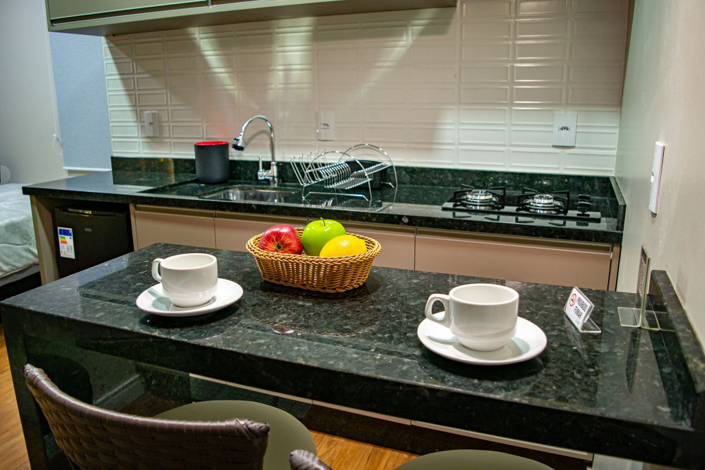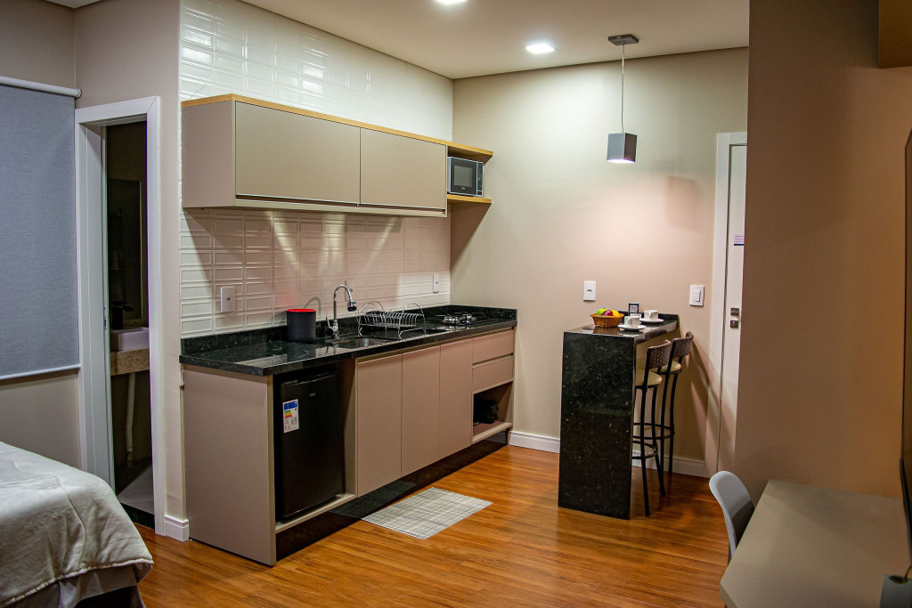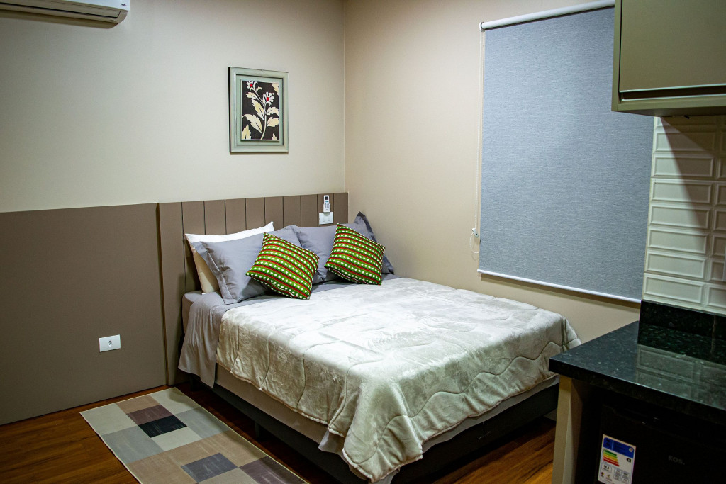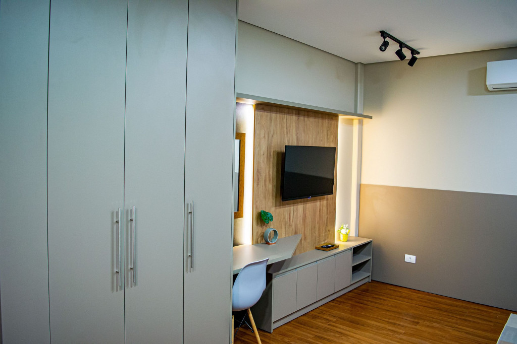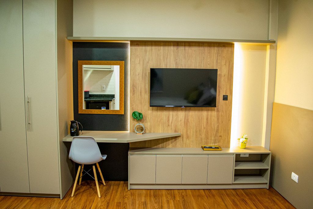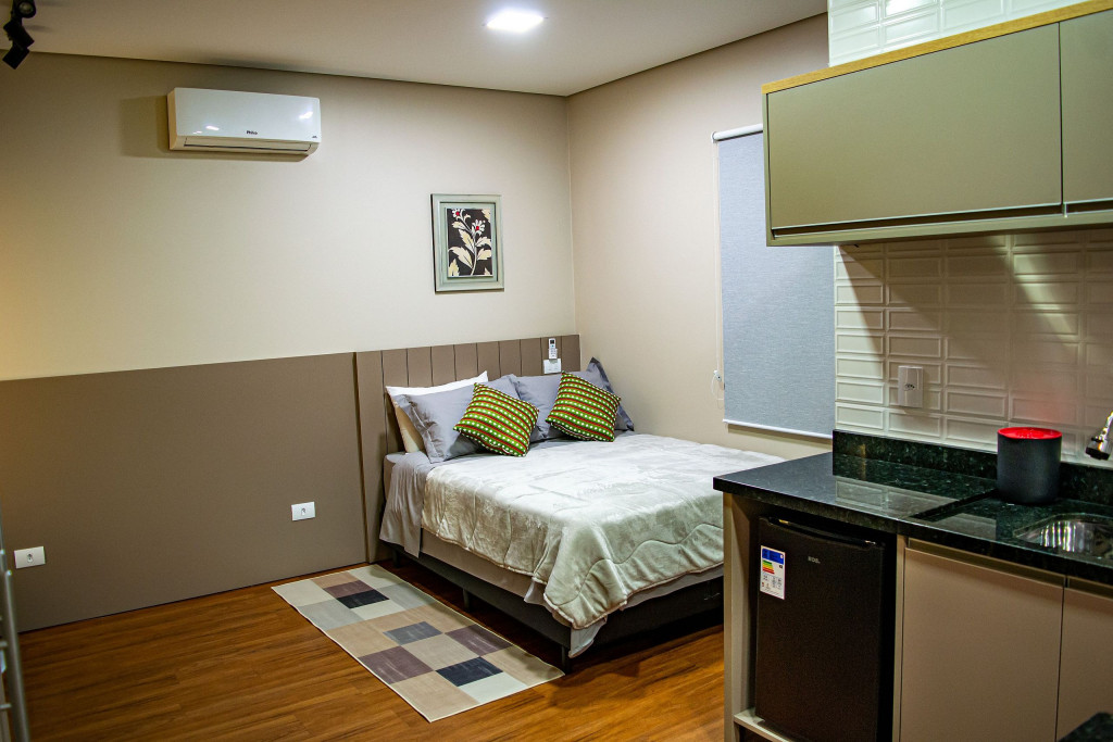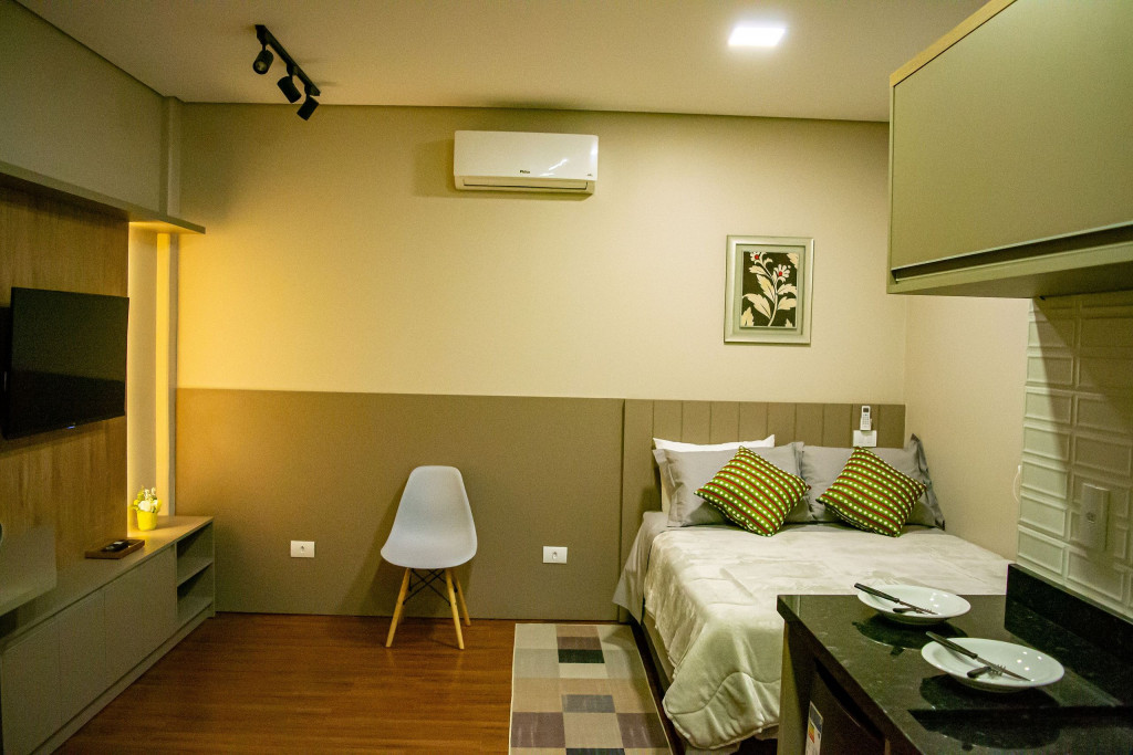 Seus apartamentos contam com cozinha equipada, Smart tv, cama confortável, ar-condicionado que refrigeram todo o espaço, central de trabalho/estudos, enxoval de cama e banho.
