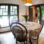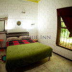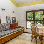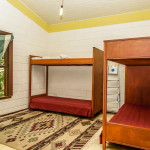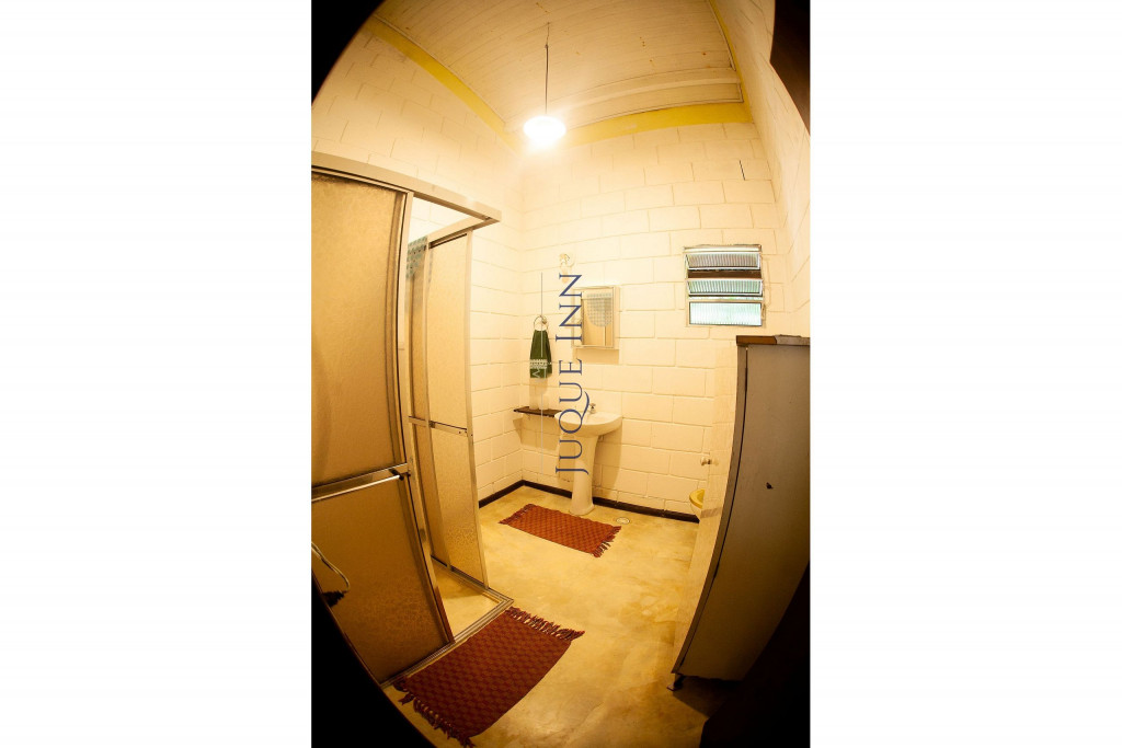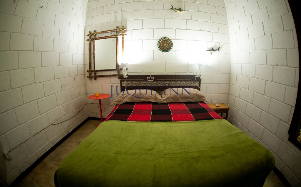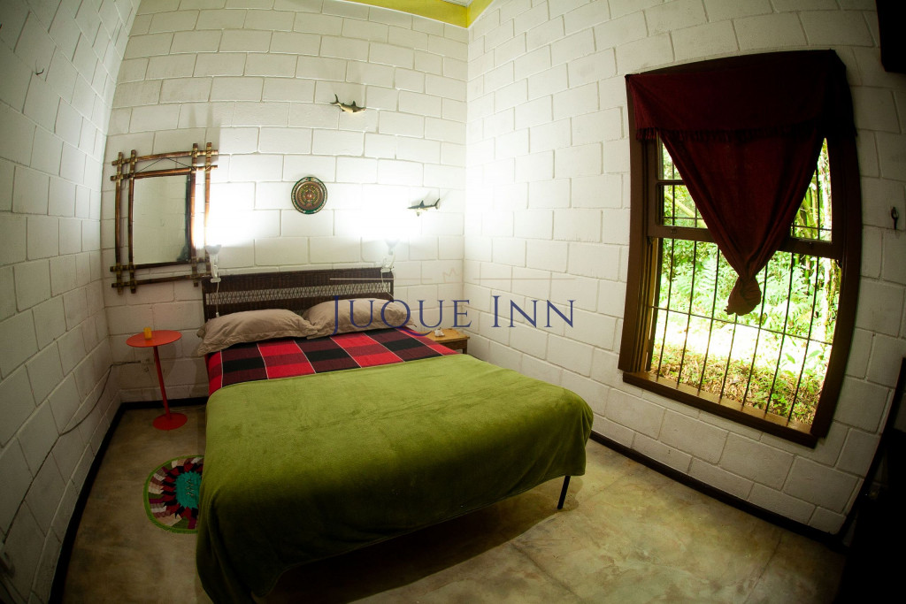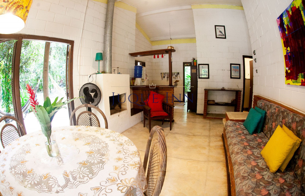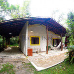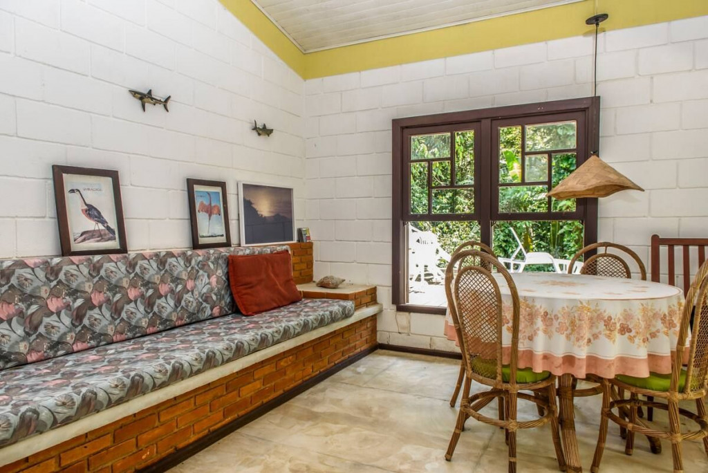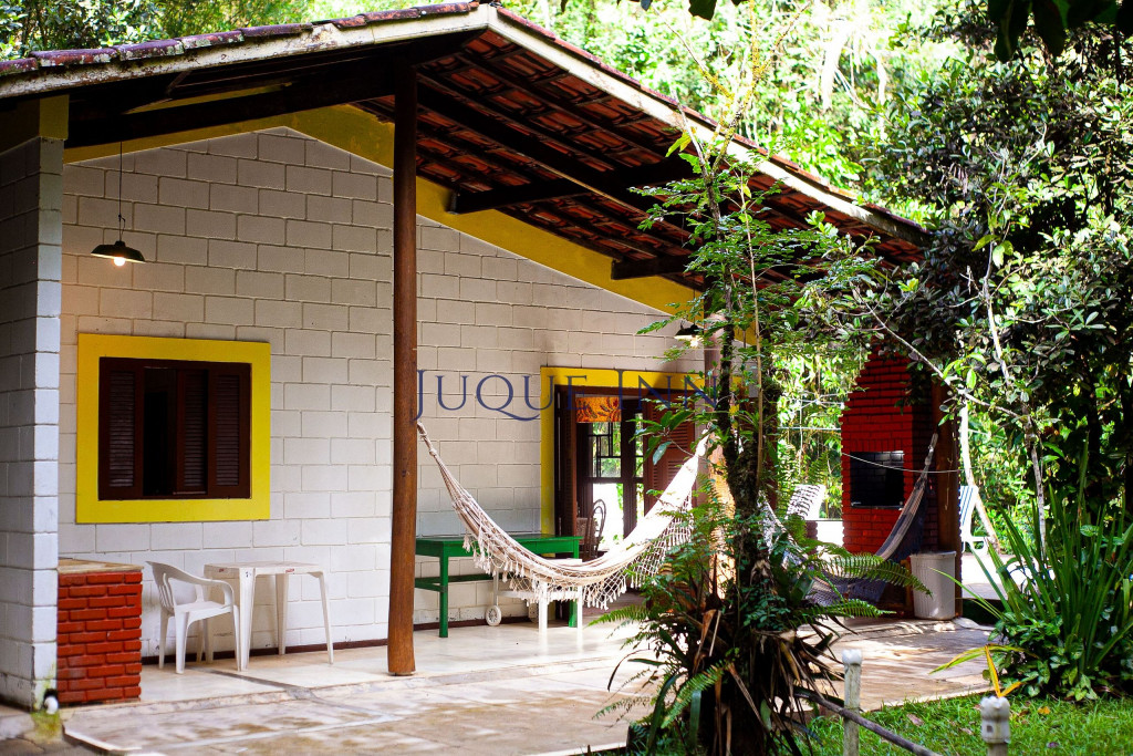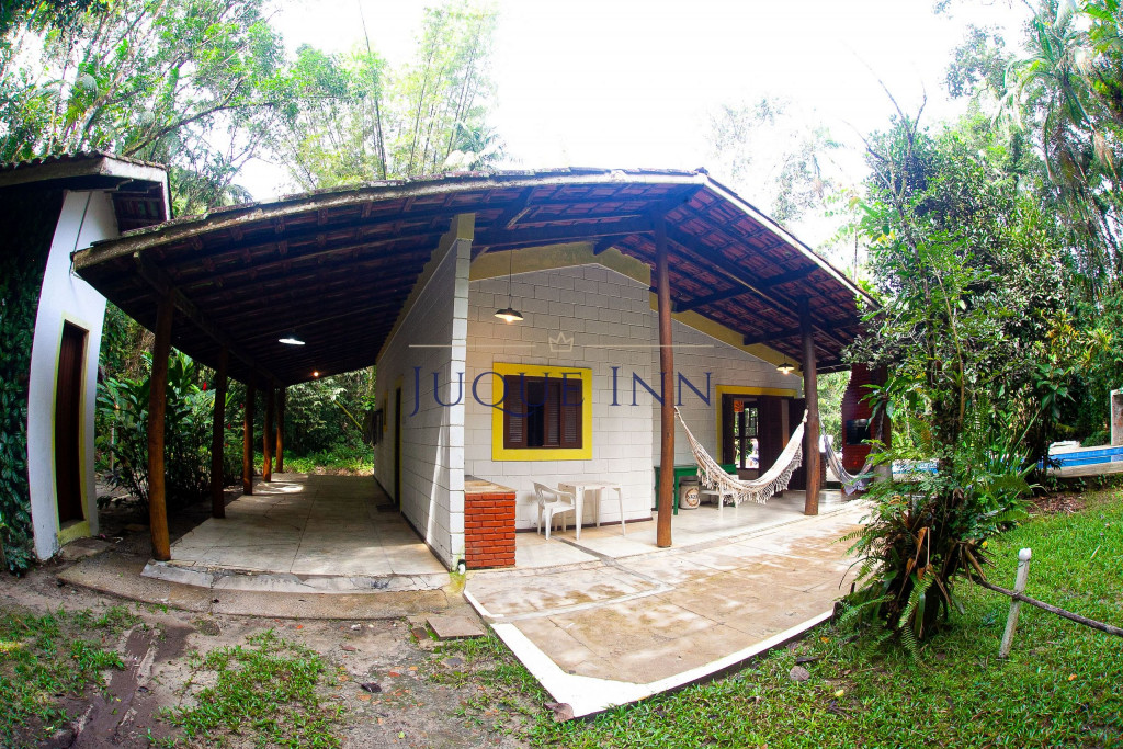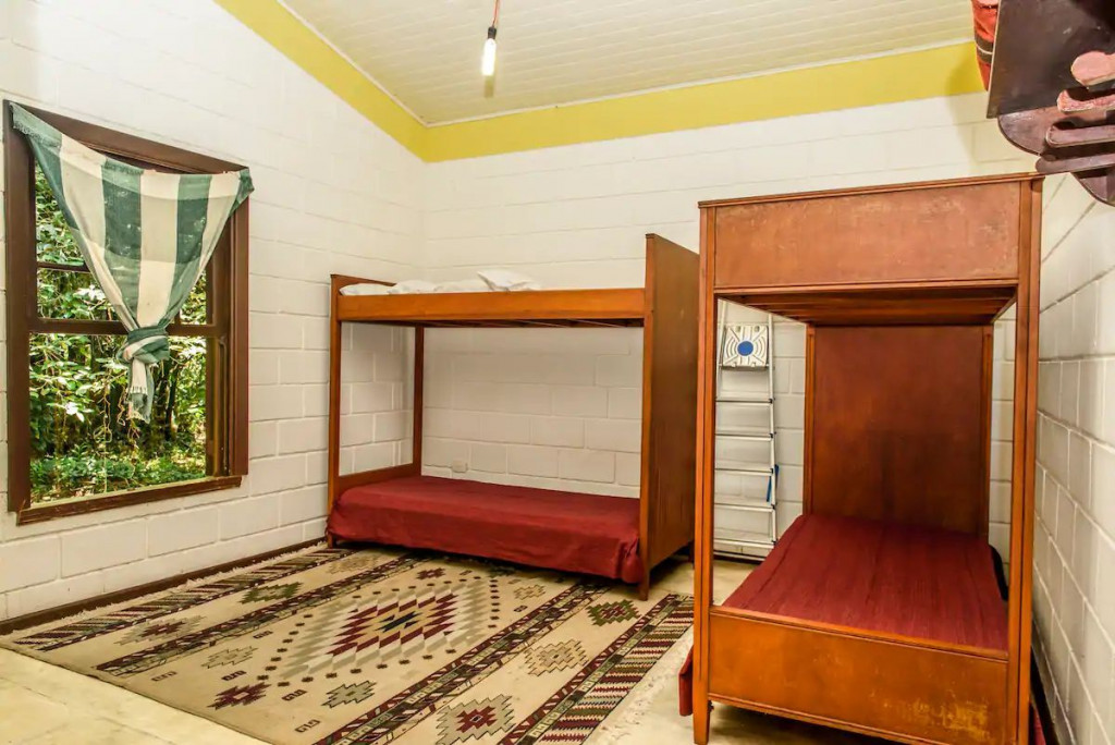 A casa possui dois quartos, sendo um com uma cama de casal e outro com dois beliches de solteiro. Existe um grande banheiro entre a sala e os quartos e um outro banheiro externo.