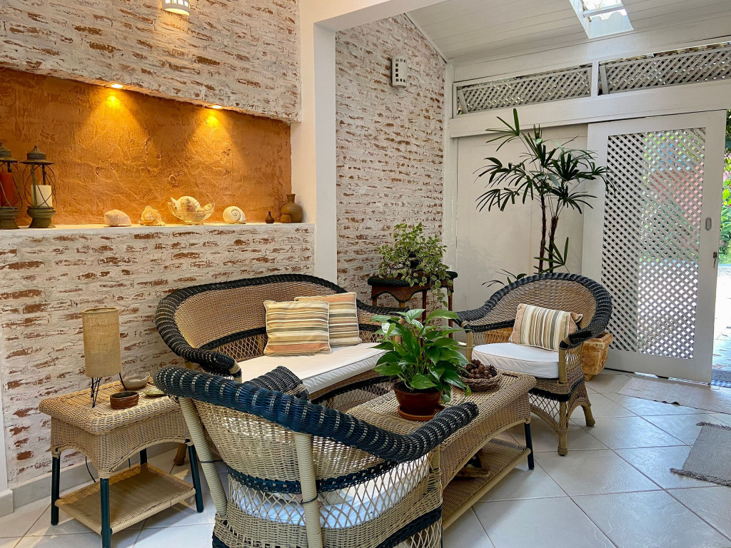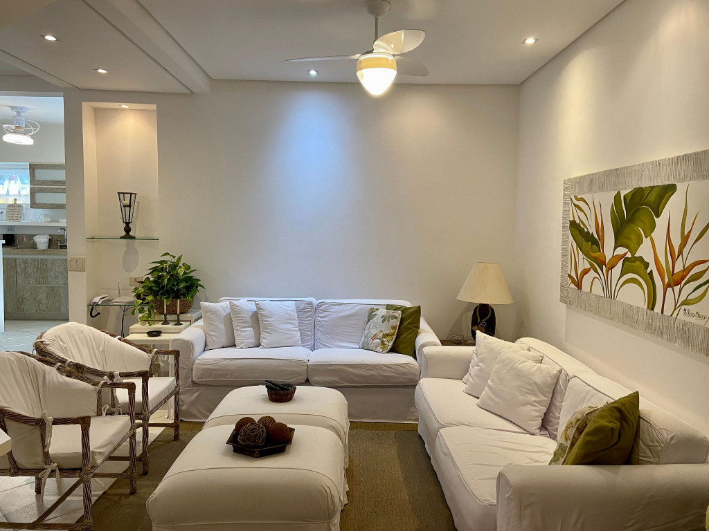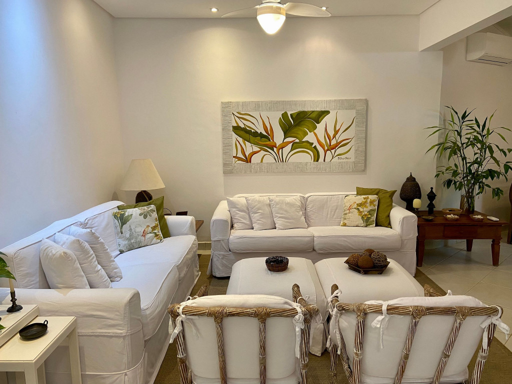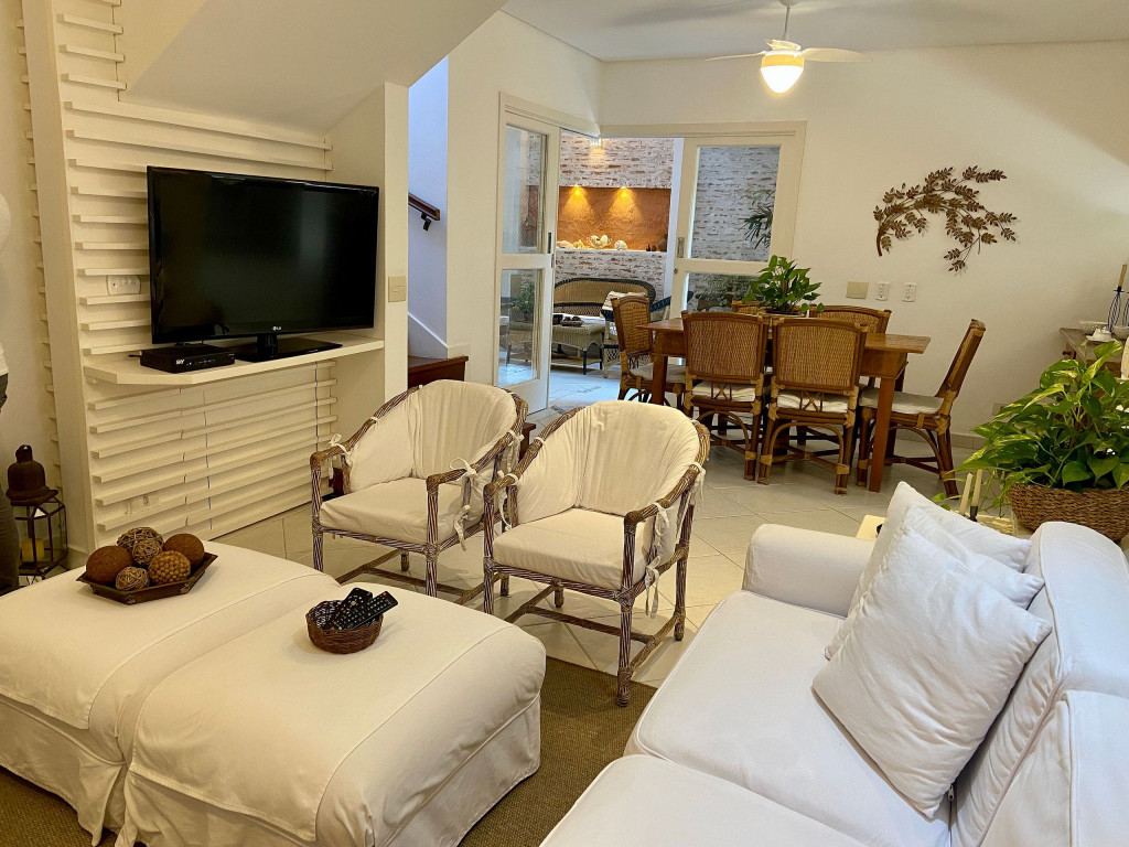 Casa muito bem decorada e equipada, com 4 suítes sendo uma térrea e três no pavimento superior. Fica no canto direito de Juquehy, ao lado do restaurante Badauê. O condomínio oferece quadra de tênis, uma piscina com deck e vista para o mar. O grande diferencial é o apoio de praia, localizado em uma área pé na areia privativa do condomínio, com cadeiras, tendas, parquinho para crianças, churrasqueira e banheiros.A distância da casa até a areia é de 100 metros.