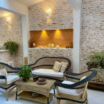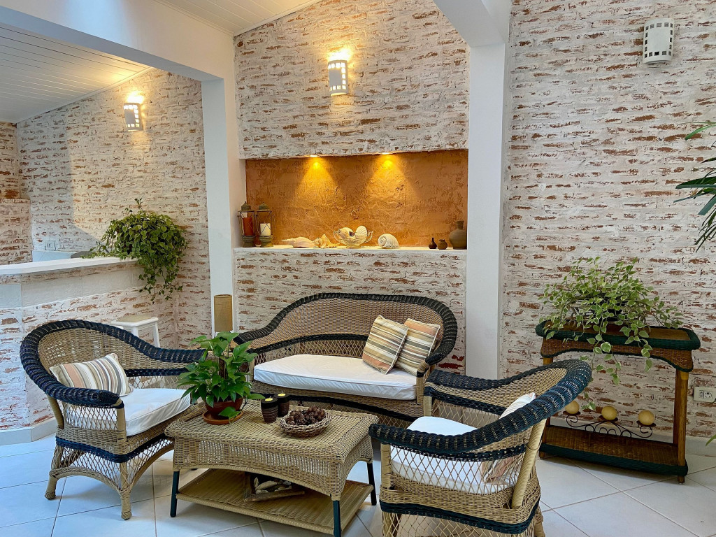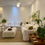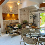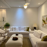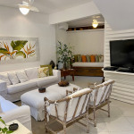 - Área de Estar: Três poltronas e uma mesa de centro - Churrasqueira: bancada com duas banquetas e uma mesa de vidro com 4 lugares, Suítes: todas com ar condicionado, criados mudos, araras para cabides, e/ou armários.