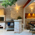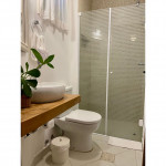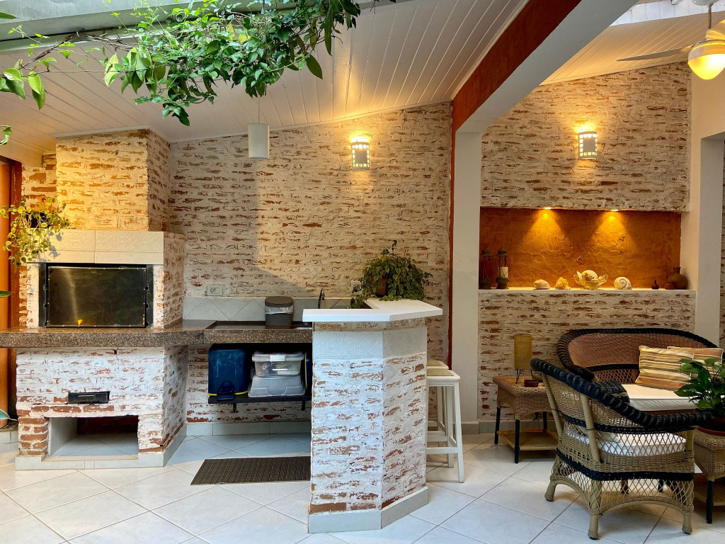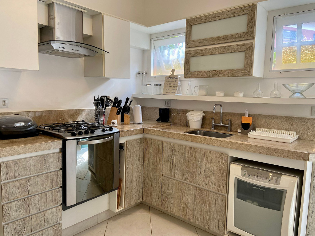 Cozinha: fogão, geladeira side by side, microondas, máquina de lavar louças, cafeteira nespresso, máquina de lavar e secar roupas. A casa possui louças, talheres e utensílios para atender até 7 pessoas hospedadas.