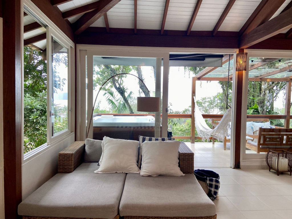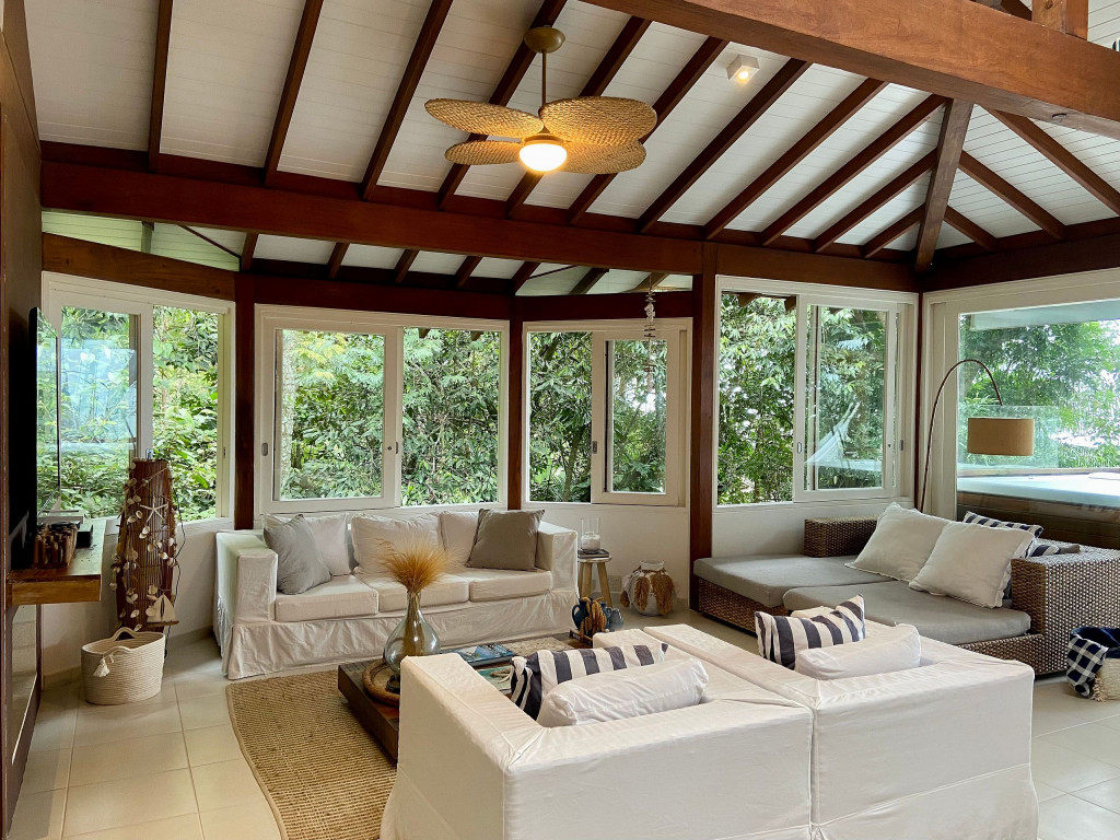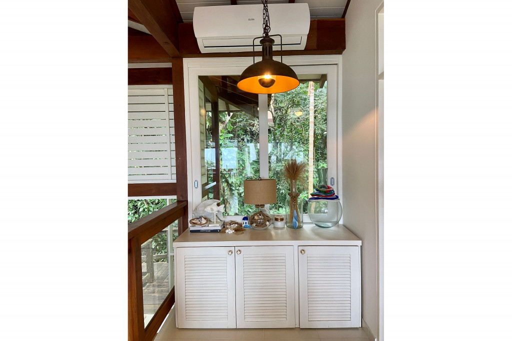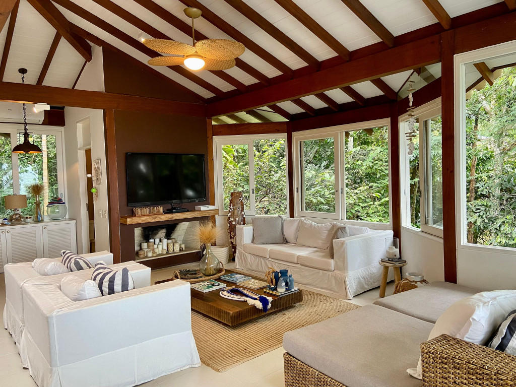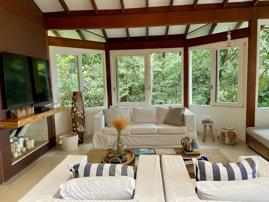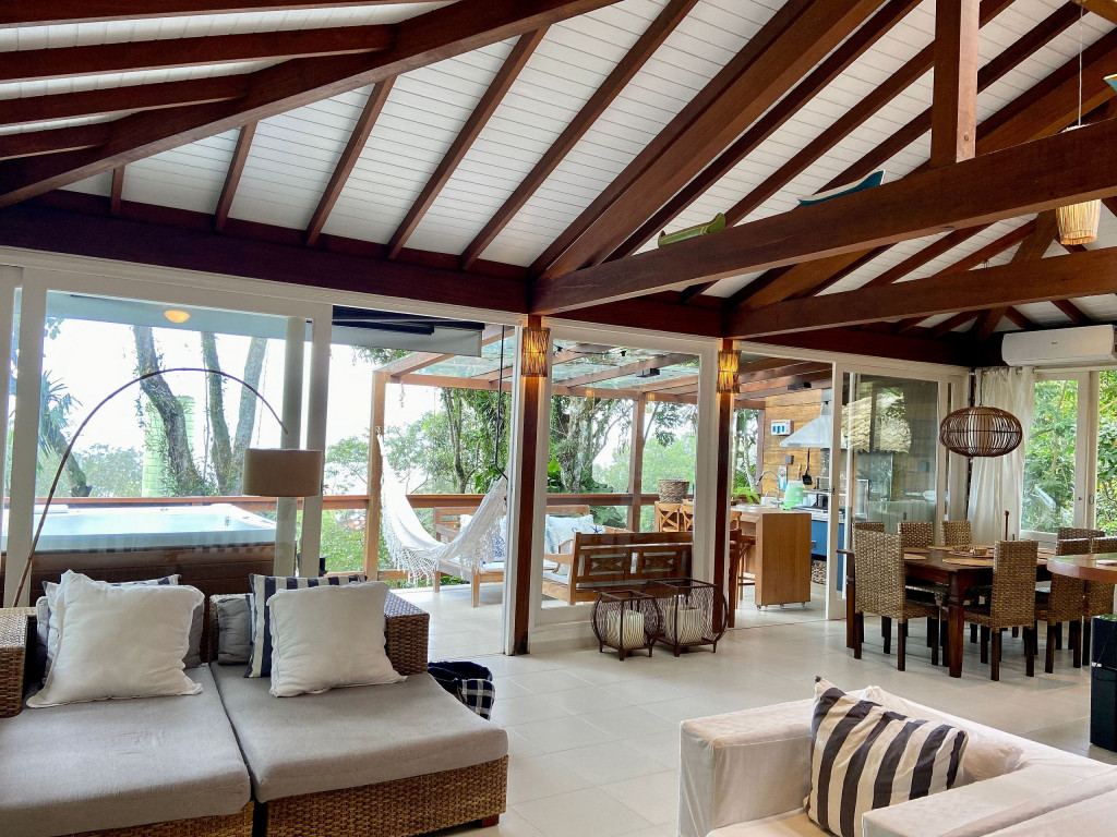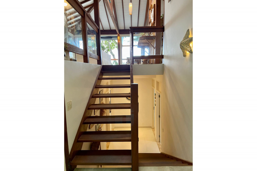 A casa fica a apenas 150 metros da praia, no condomínio Reserva das Embaúbas, um marco na arquitetura de Juquehy. São 9 casas construídas em um sistema de plano inclinado, com um bondinho que se conecta à casas através de passarelas. Toda a concepção do projeto leva em consideração a preservação da fauna e flora local.A casa possui as 4 suítes no pavimento inferior e o térreo é composto por uma sala integrada a cozinha e varanda, com uma vista de tirar o fôlego.