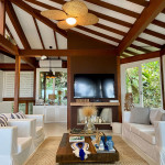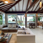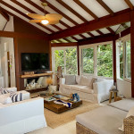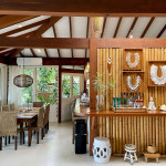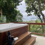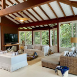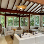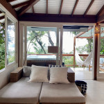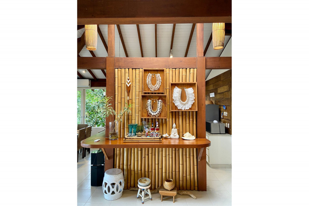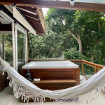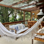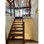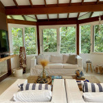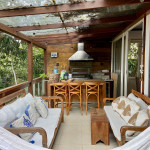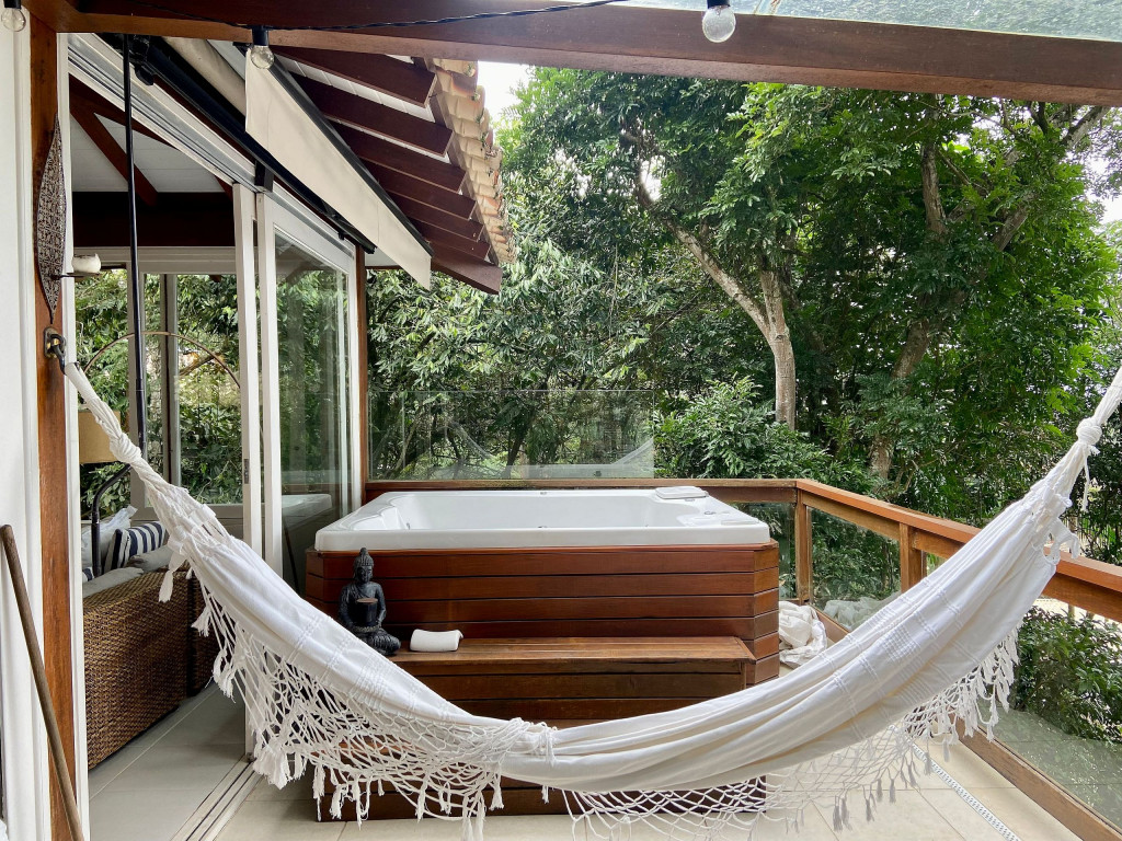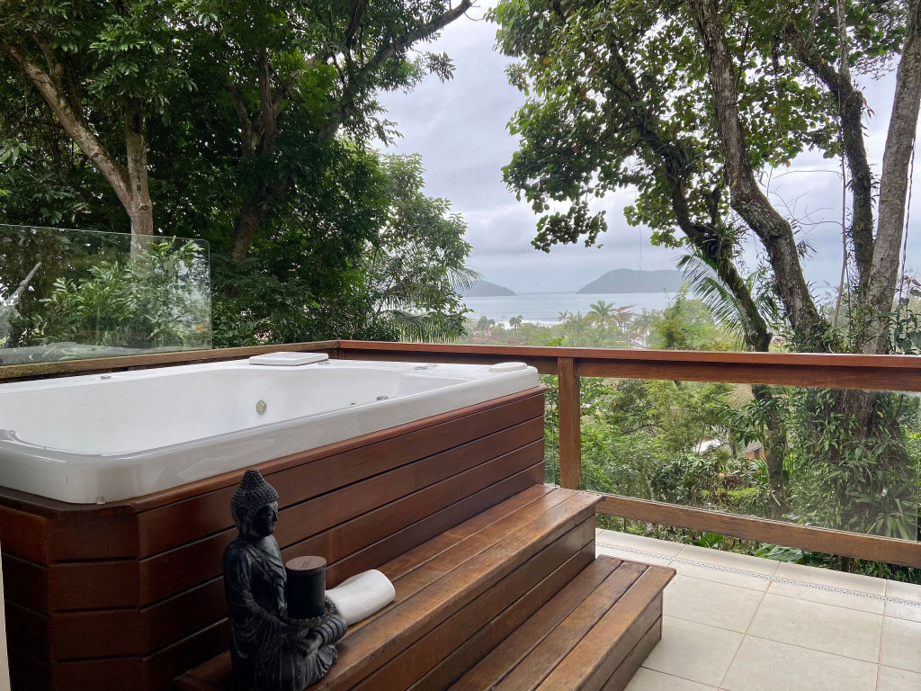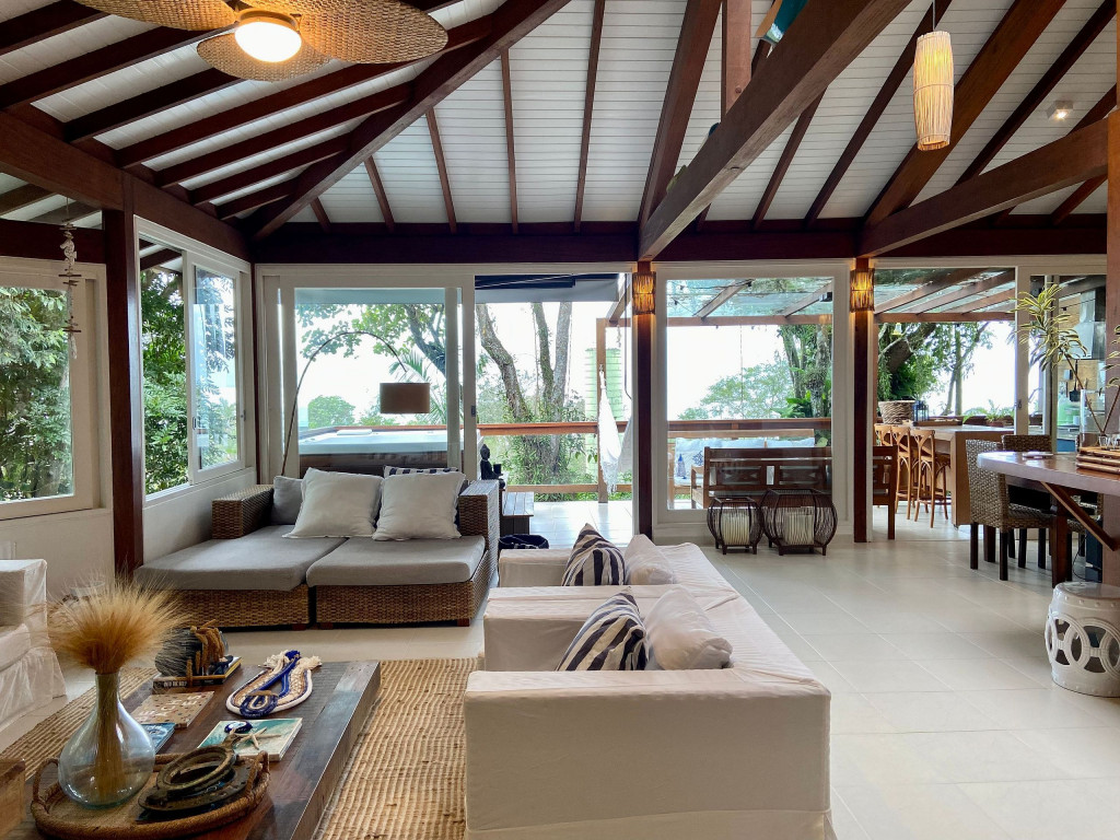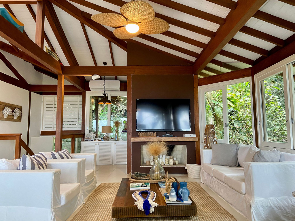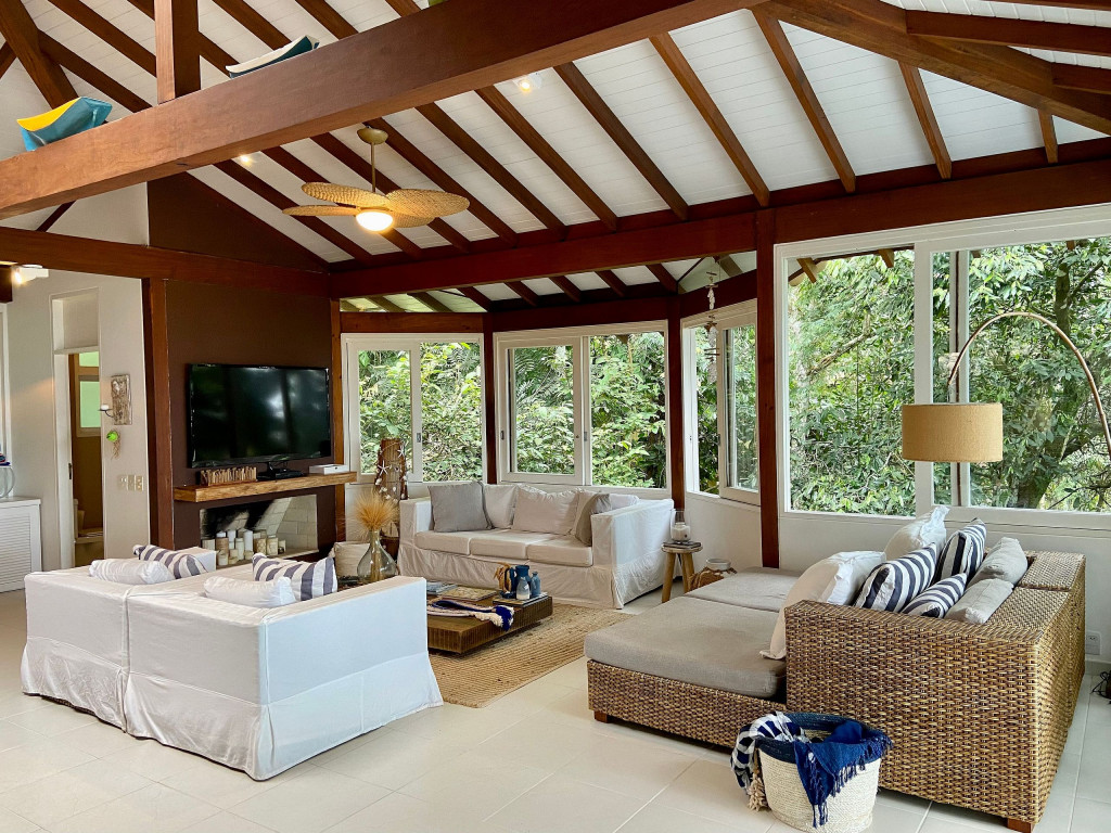 A casa fica a apenas 150 metros da praia, no condomínio Reserva das Embaúbas, um marco na arquitetura de Juquehy. São 9 casas construídas em um sistema de plano inclinado, com um bondinho que se conecta à casas através de passarelas. Toda a concepção do projeto leva em consideração a preservação da fauna e flora local.A casa possui as 4 suítes no pavimento inferior e o térreo é composto por uma sala integrada a cozinha e varanda, com uma vista de tirar o fôlego.