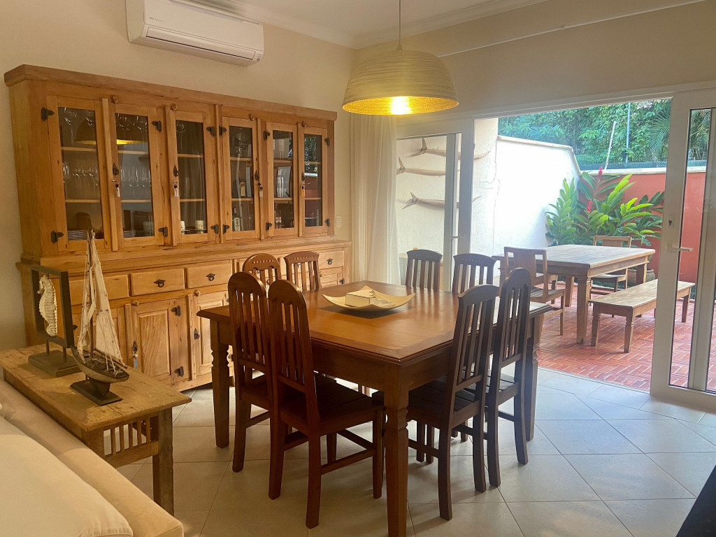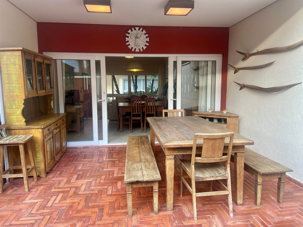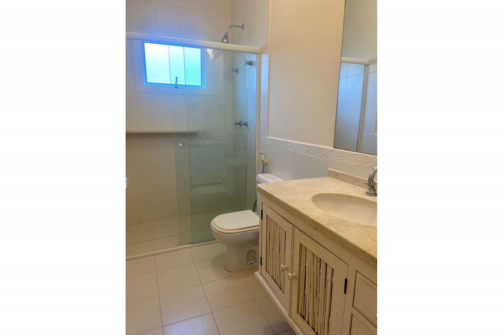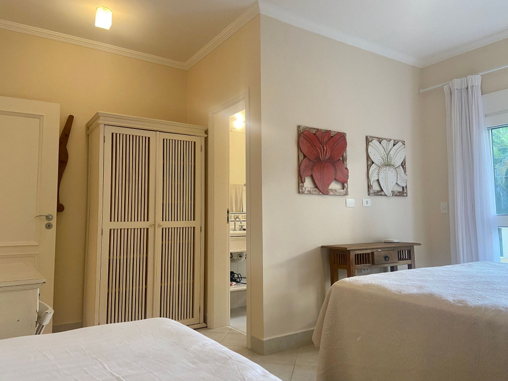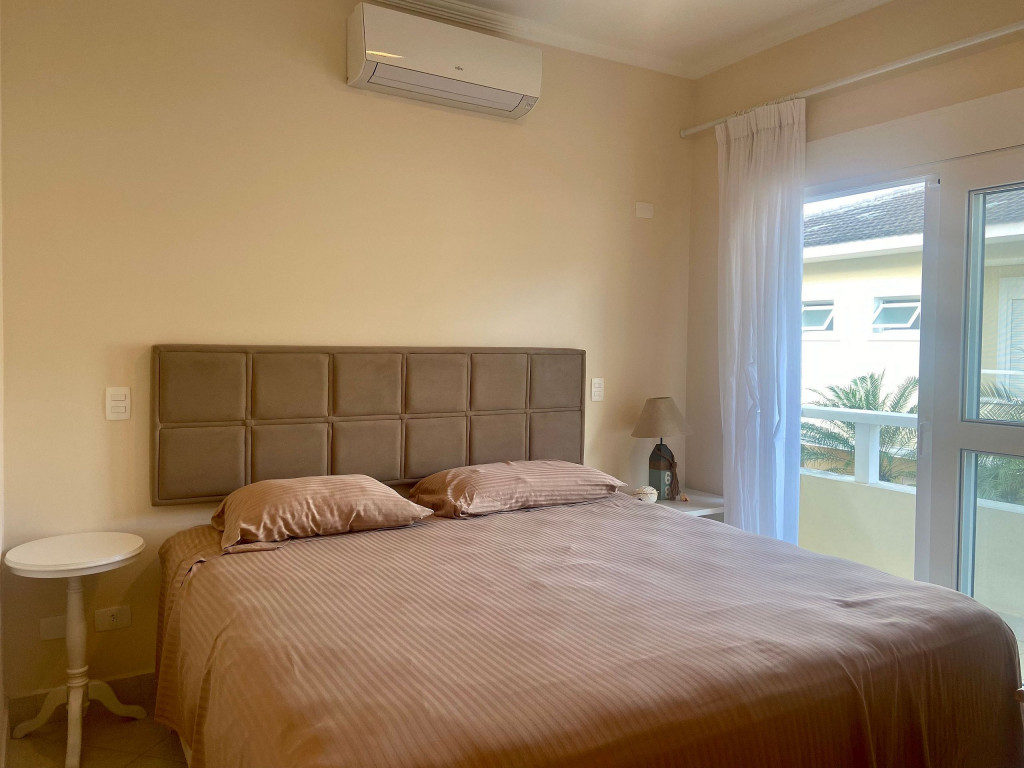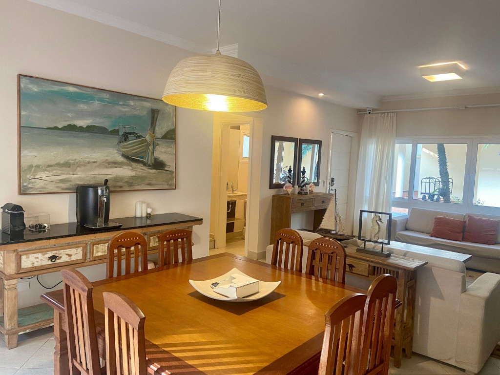 Casa de condomínio com 4 suítes e uma charmosa varanda gourmet. A casa é finamente decorada e muito bem equipada com eletrodomésticos, utensílios e equipamentos. A casa oferece roupas de cama, mesa e banho.O condomínio possui piscina e disponibiliza apoio de praia, com cadeiras e guarda sol.