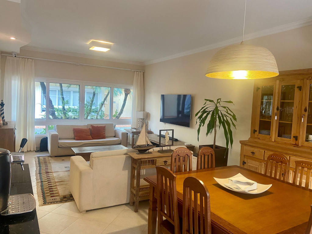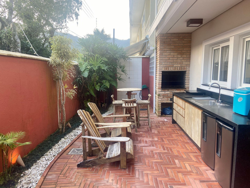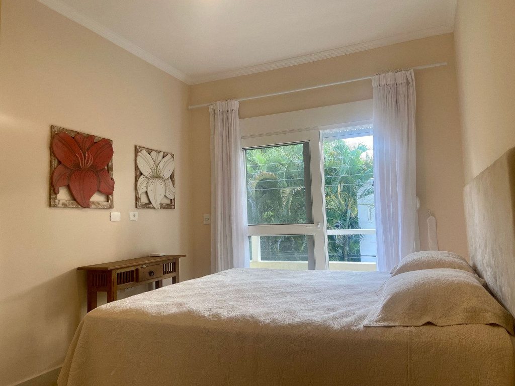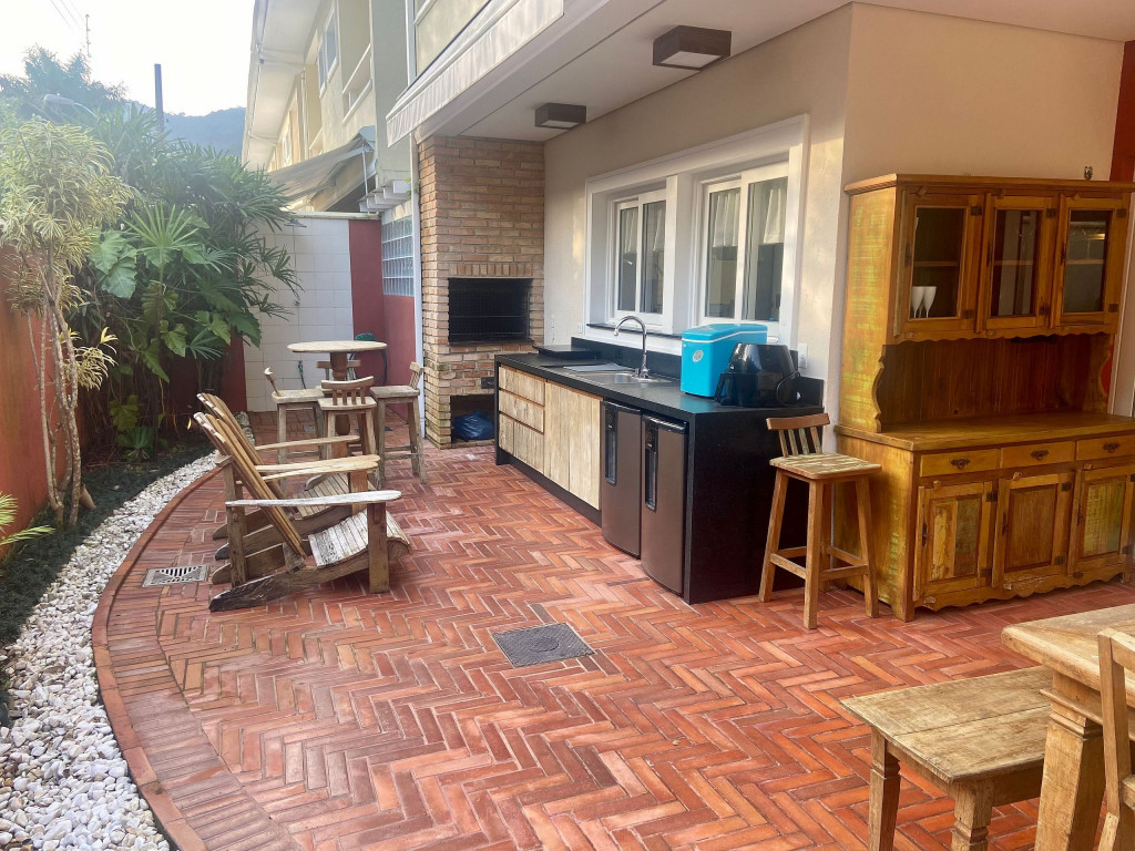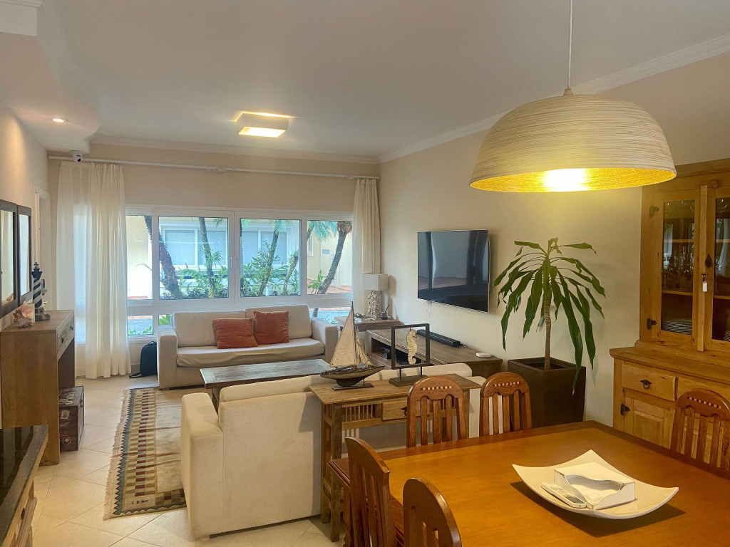 Casa de condomínio com 4 suítes e uma charmosa varanda gourmet. A casa é finamente decorada e muito bem equipada com eletrodomésticos, utensílios e equipamentos. A casa oferece roupas de cama, mesa e banho.O condomínio possui piscina e disponibiliza apoio de praia, com cadeiras e guarda sol.