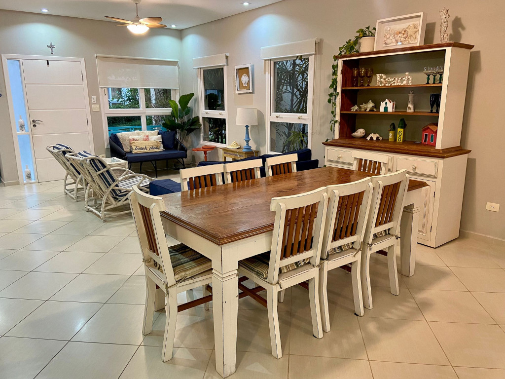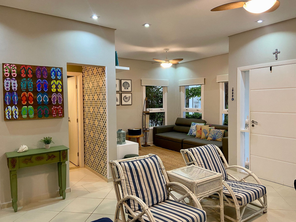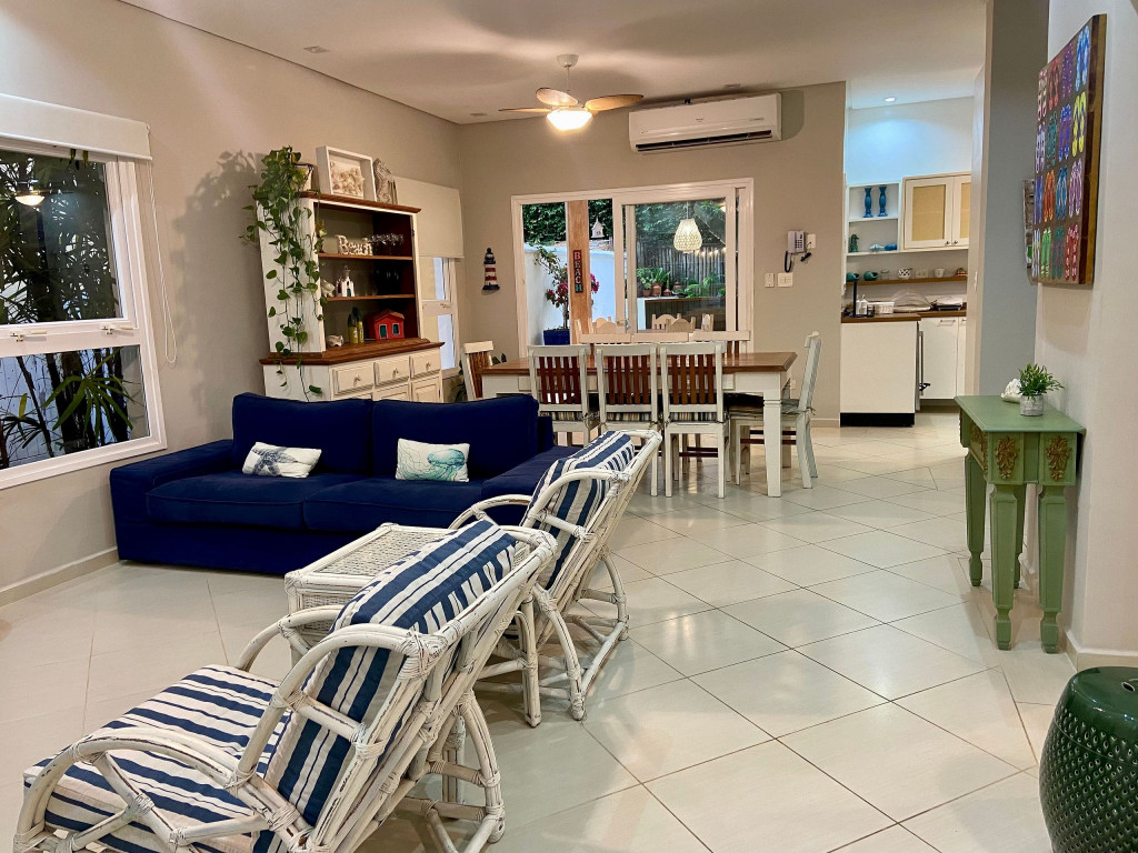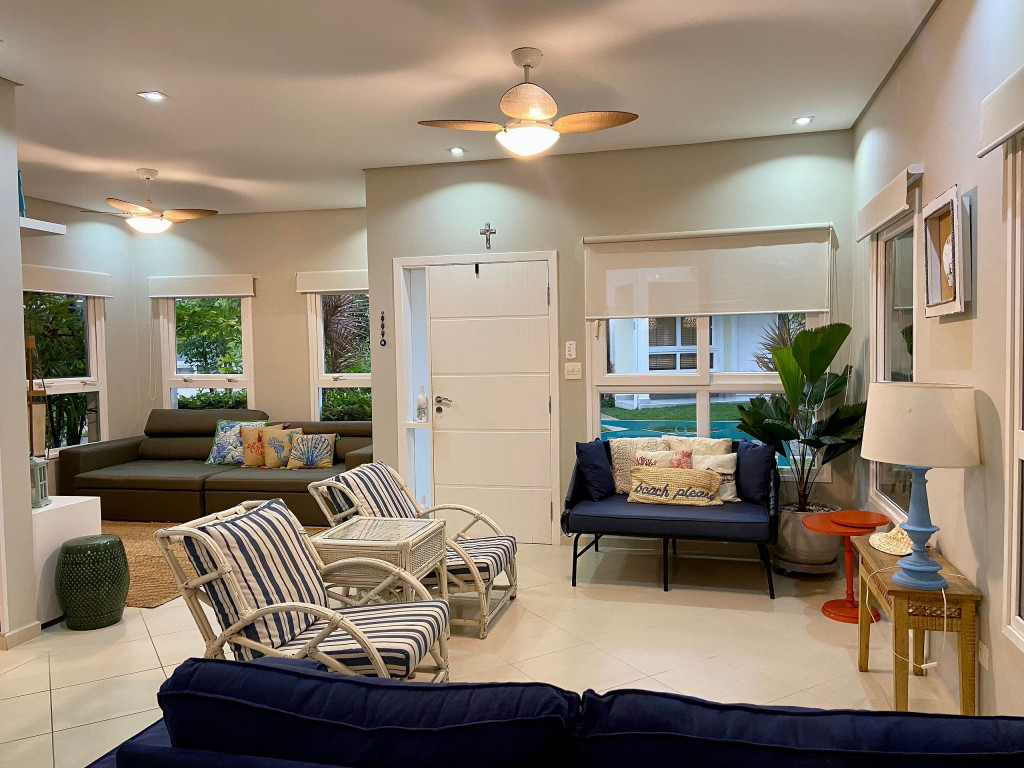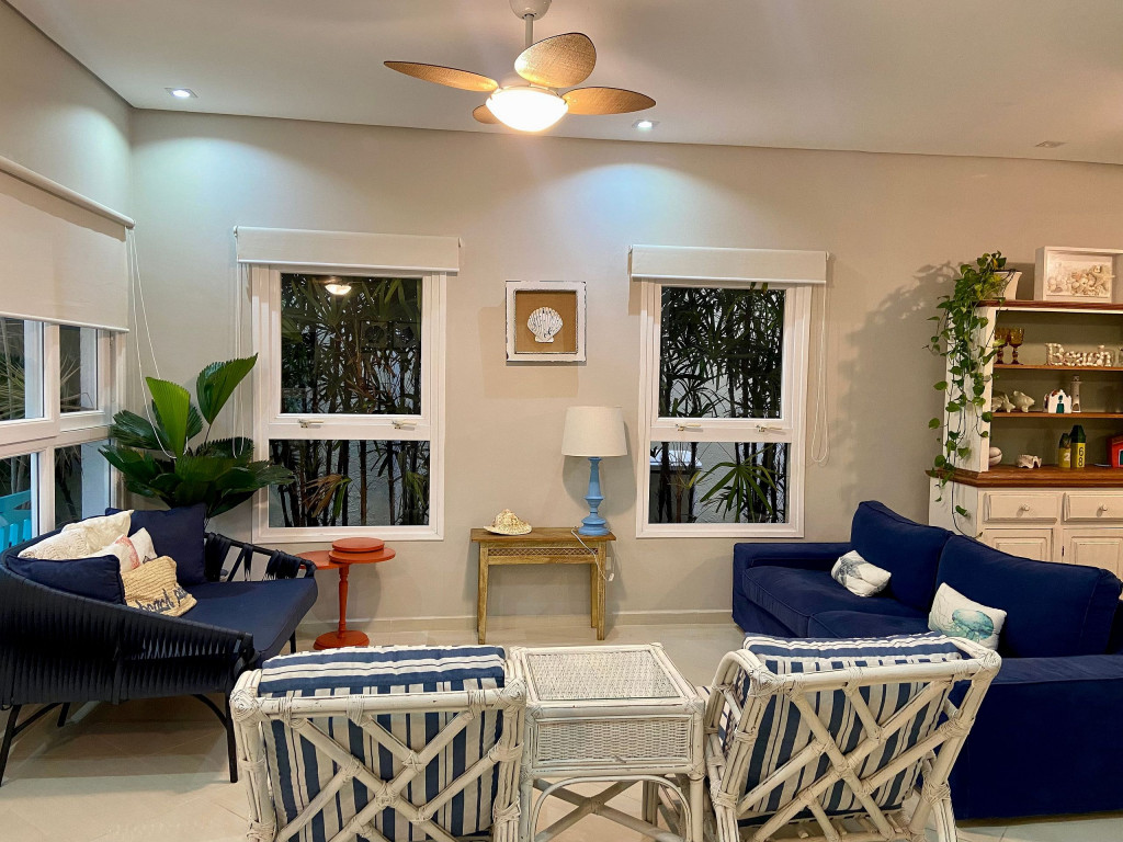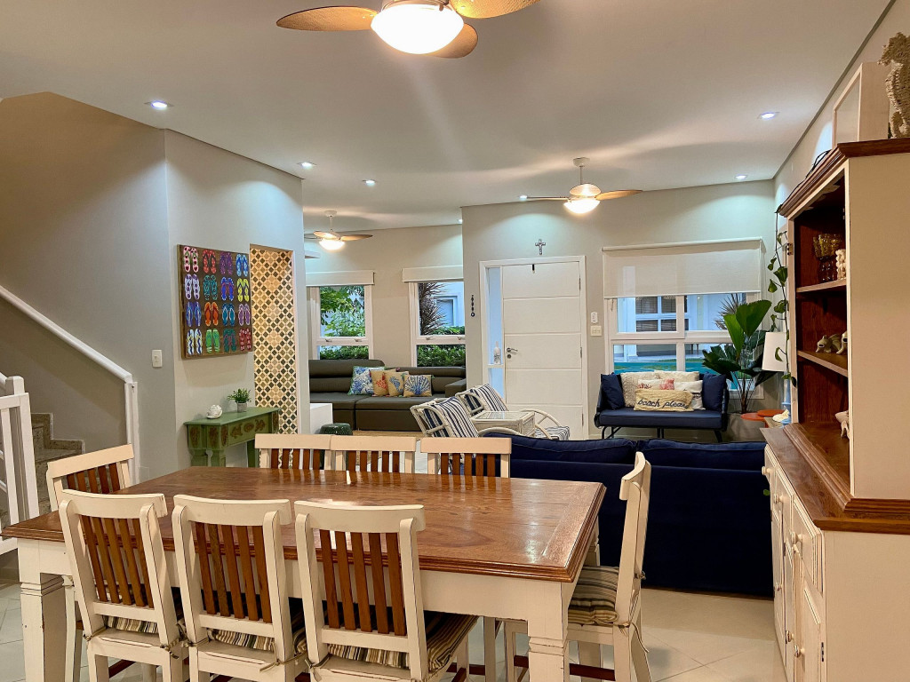 Casa de condomínio com piscina privativa a 50m da praia no canto esquerdo de Juquehy. O condomínio oferece apoio de praia com tenda e cadeiras montadas na praia.Nó térreo a casa possui uma sala de estar, TV e jantar integradas, dando acesso para a área externa com piscina, ducha e churrasqueira, criando um grande espaço de convívio familiar.