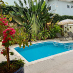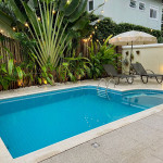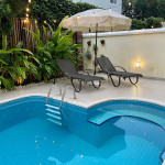 Piscina, banco com 4 saídas de Jacuzzi e iluminação 2 espreguiçadeiras e um guarda-sol (ombrelone) Banheiro (piscina) com chuveiro elétrico