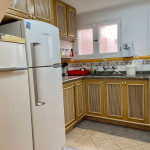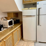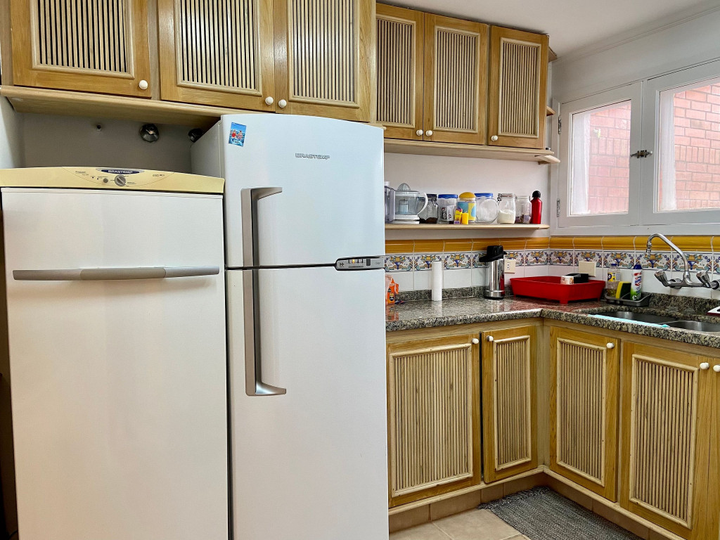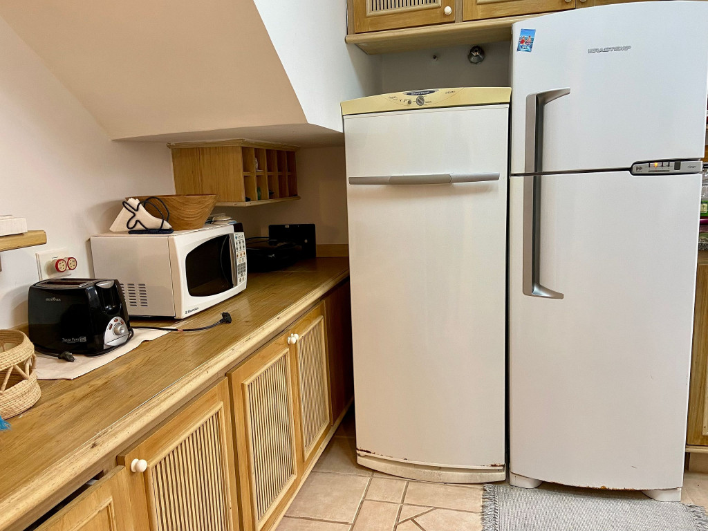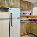 Cozinha equipada com geladeira, forno, microondas, louças e utensílios.