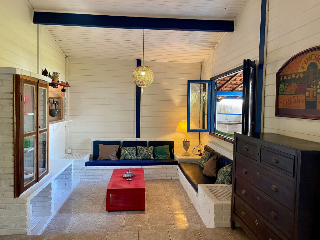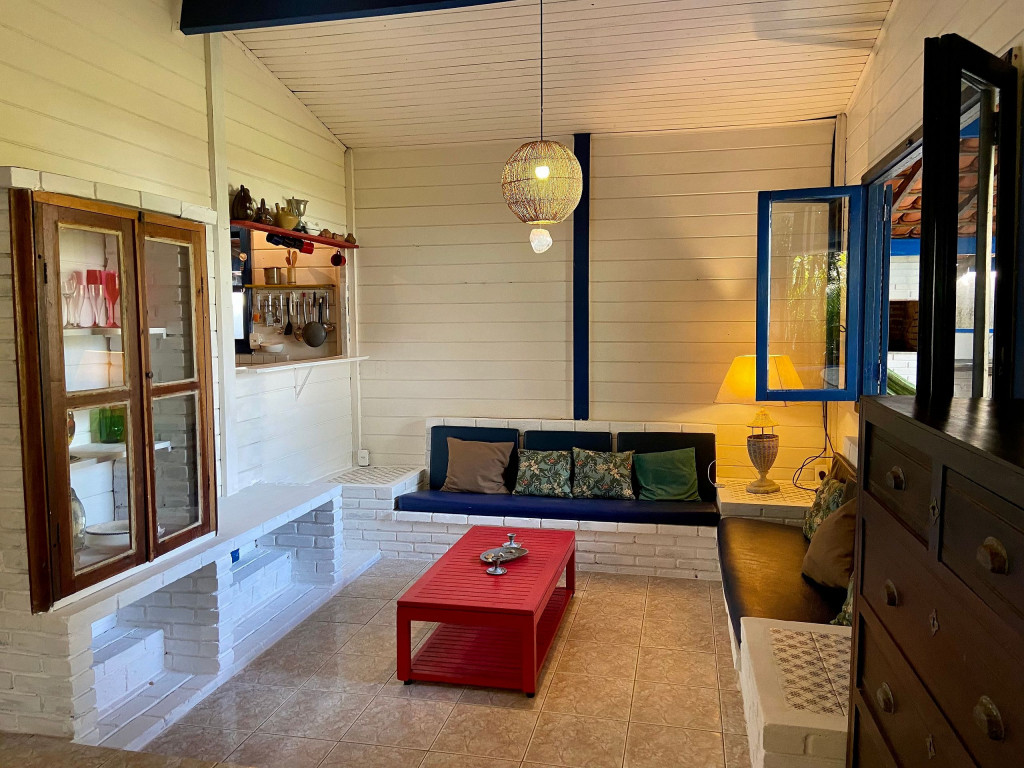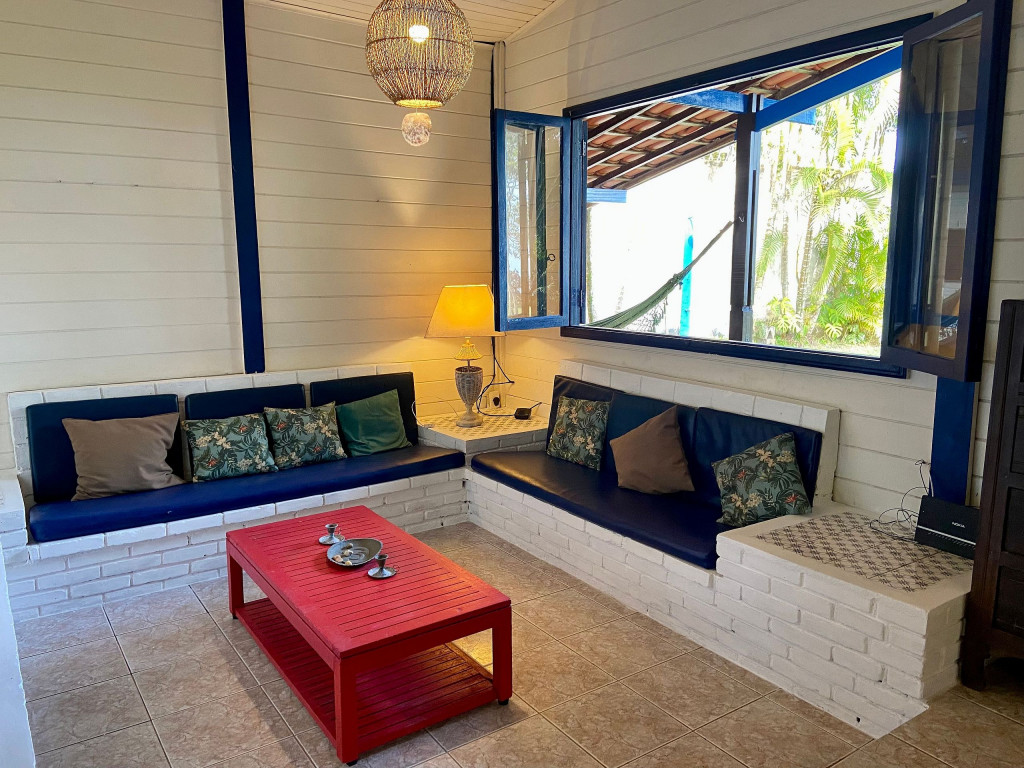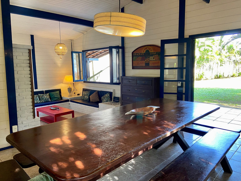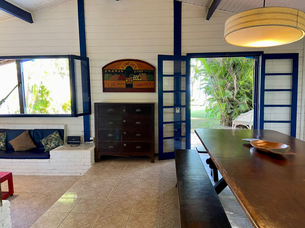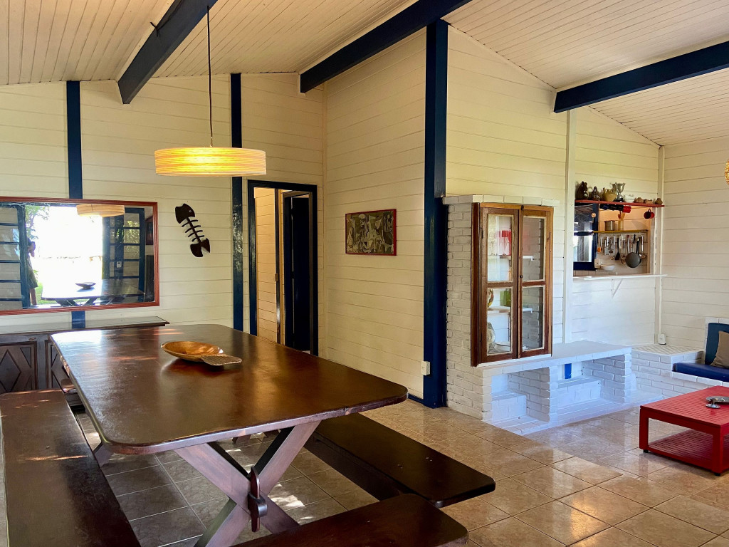 A casa possui quatro quartos, sendo duas suítes (uma com entrada independente). Sala com dois ambientes, com acesso à à uma ampla varanda de frente para o gramado que acaba nas areias de Juquehy. Possui churrasqueira no quintal.