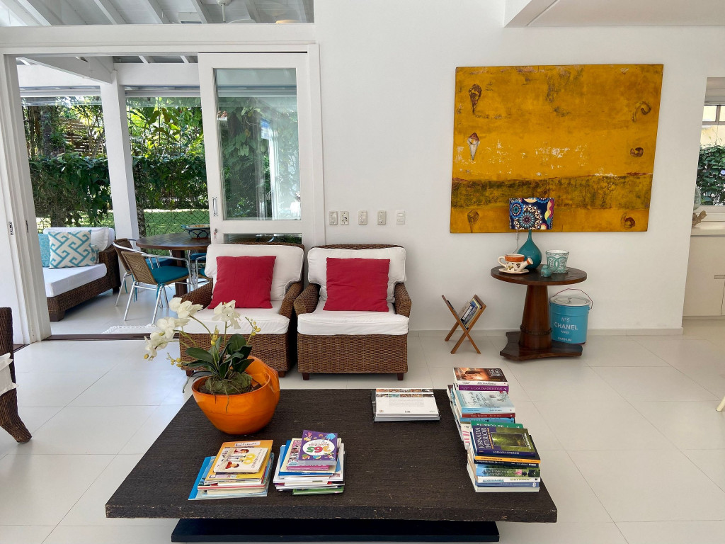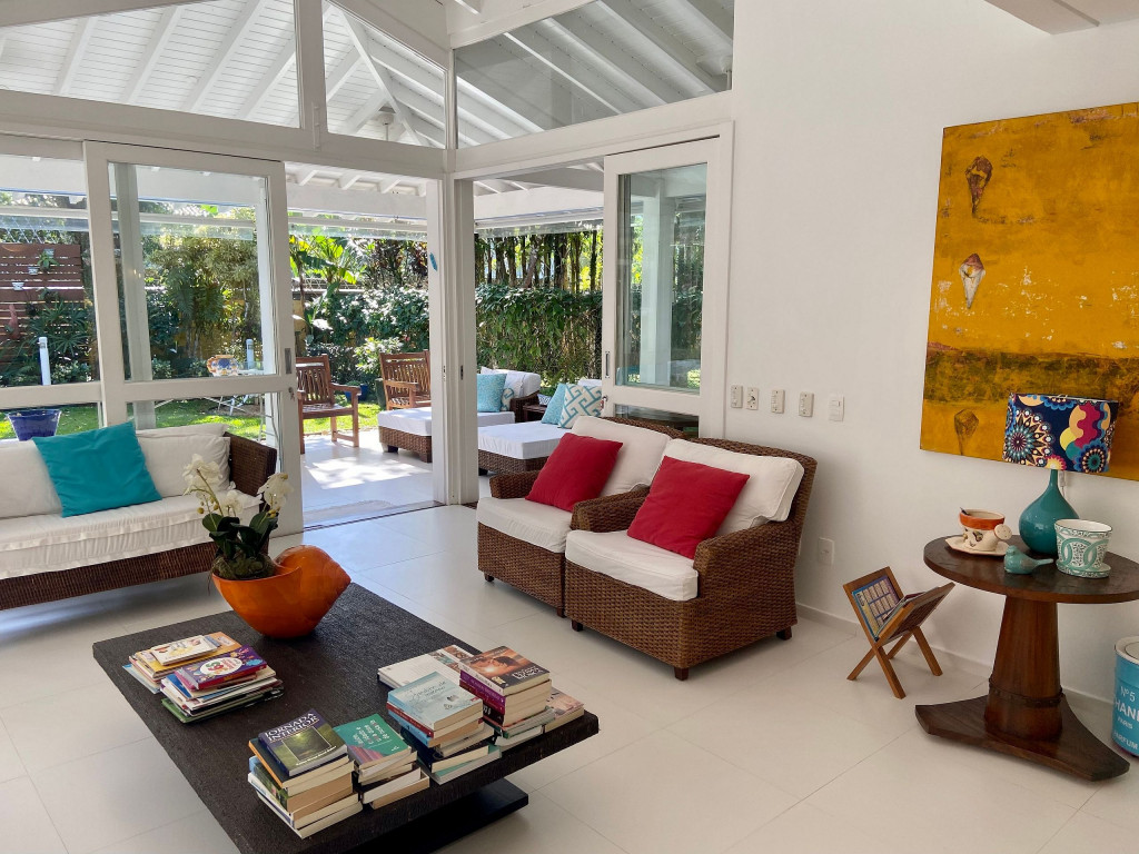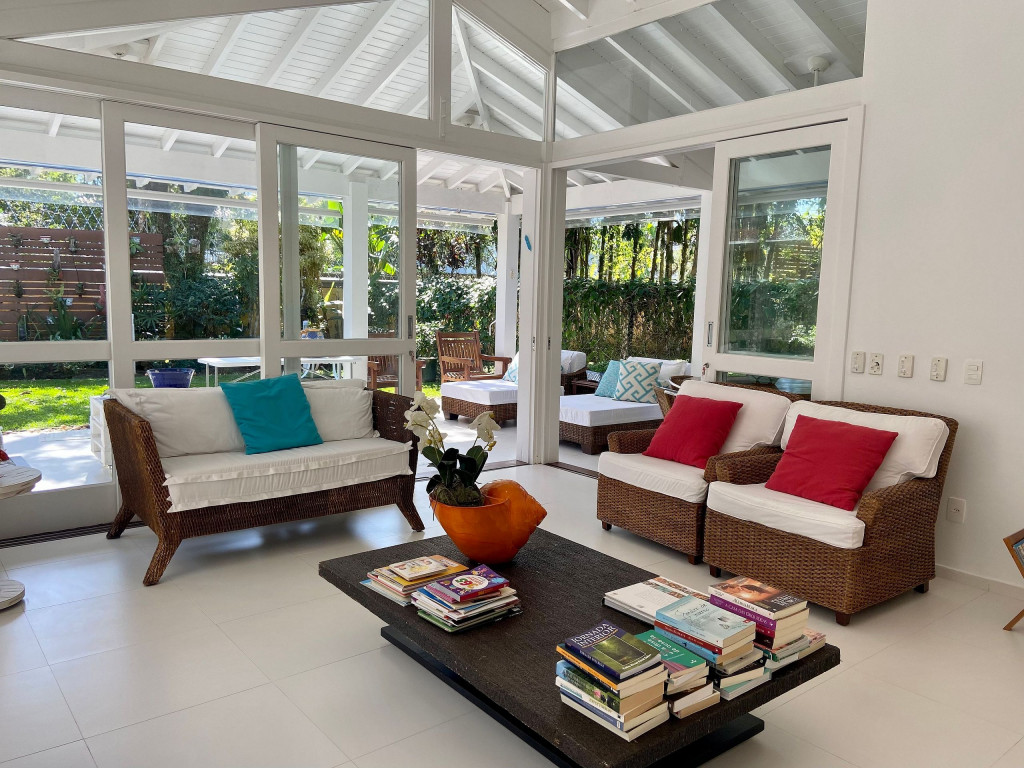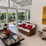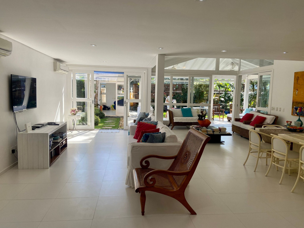 A generosidade de uma casa de 6 suítes, com um belo jardim integrado à sala e varanda, num condomínio a 50m da praia em Juquehy.