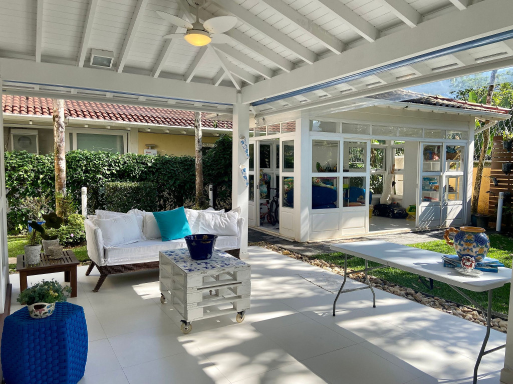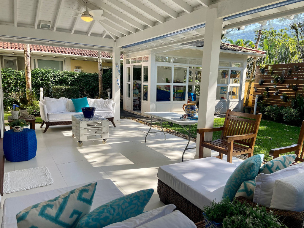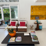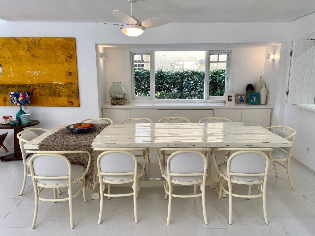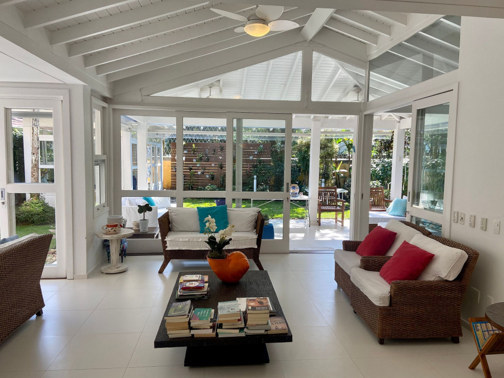 A generosidade de uma casa de 6 suítes, com um belo jardim integrado à sala e varanda, num condomínio a 50m da praia em Juquehy.