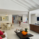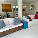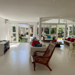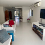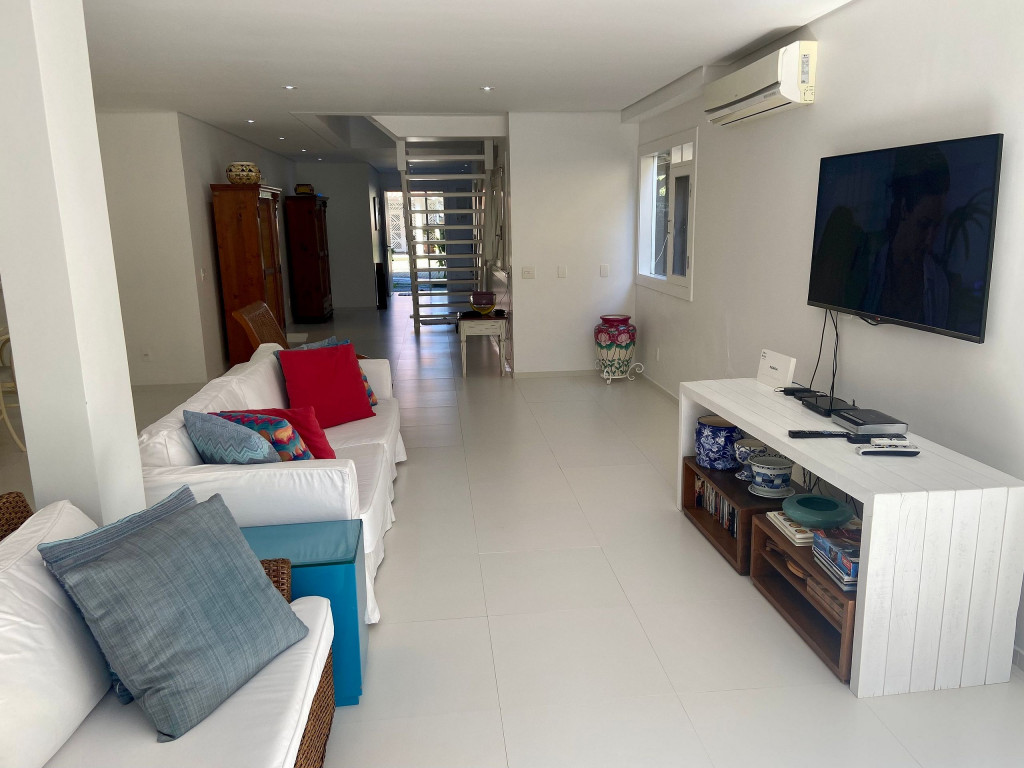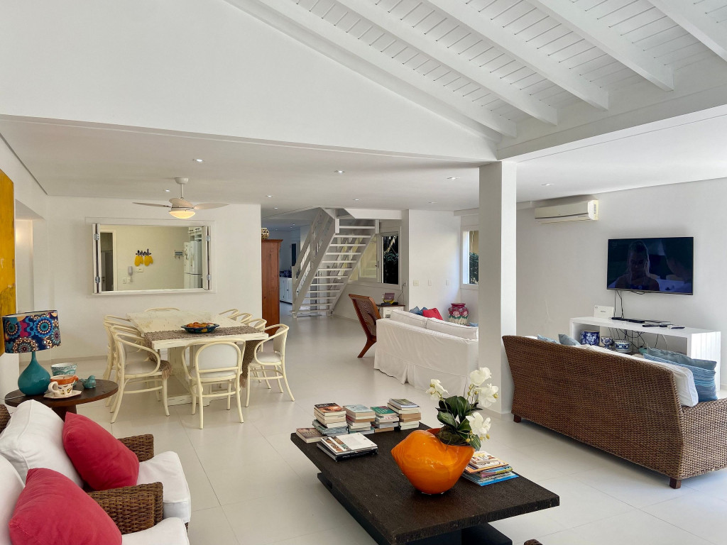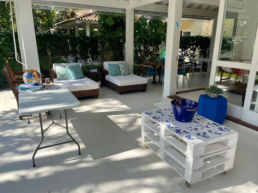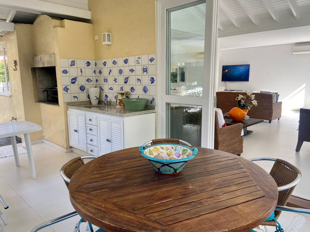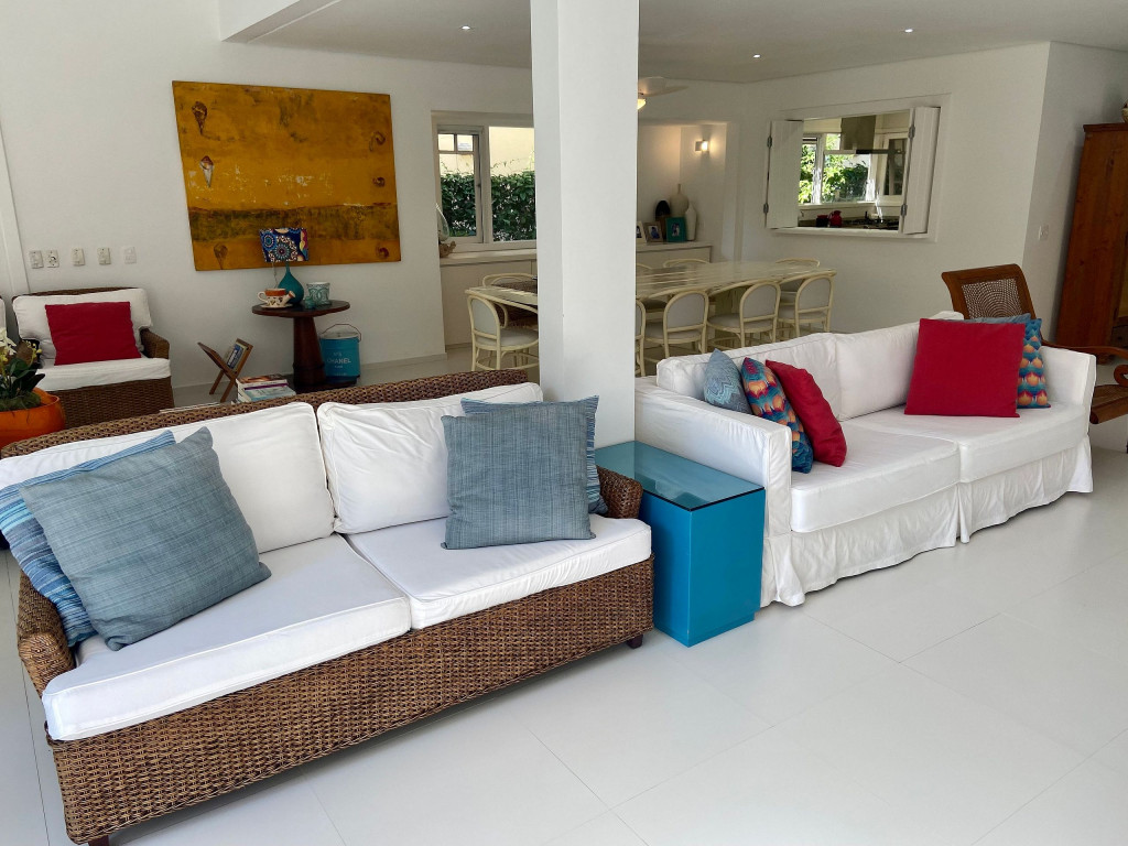 Casa grande e charmosa, localizada em condomínio na Av. Mãe Bernarda a 50m da Praia. A casa é muito bem decorada e equipada, com 6 suítes e um belo jardim integrado à sala e à varanda.