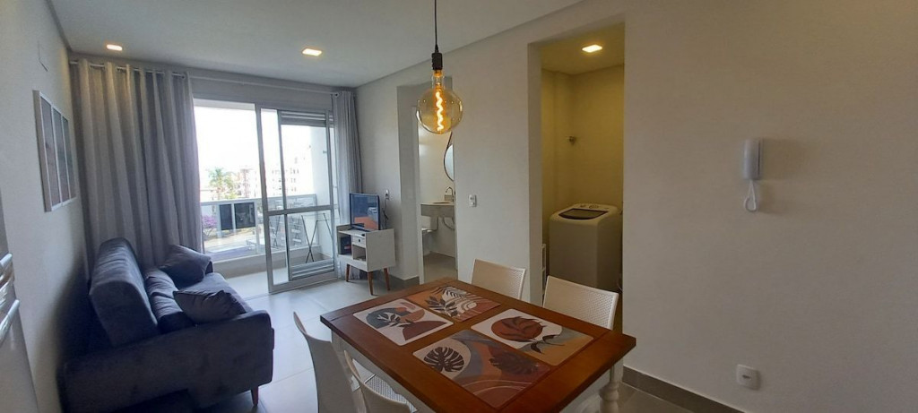 O apartamento é bem distribuído, tem 01 dormitório com cama box casal com ar condicionado e um armário com espelho para você guardar seus pertences. A sala tem um sofá-cama de casal, uma ótima sacada com uma bela vista para a avenida e o mar no horizonte, uma smart tv 32" e wi-fi de 250Mb. A cozinha integrada conta com fogão, geladeira, microondas, cafeteira, sanduicheira e jarra elétrica, além de outros utensílios básicos. Ah, não poderia faltar uma churrasqueira e uma grelha! Você não precisa retirar seu carro da garagem coberta incluída gratuitamente na hospedagem. Para sua comodidade, o apartamento oferece duas cadeiras de praia e um guarda-sol para você disfrutar a praia. O prédio é novo e tem elevador, não poderia ser melhor!