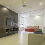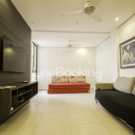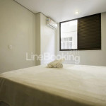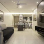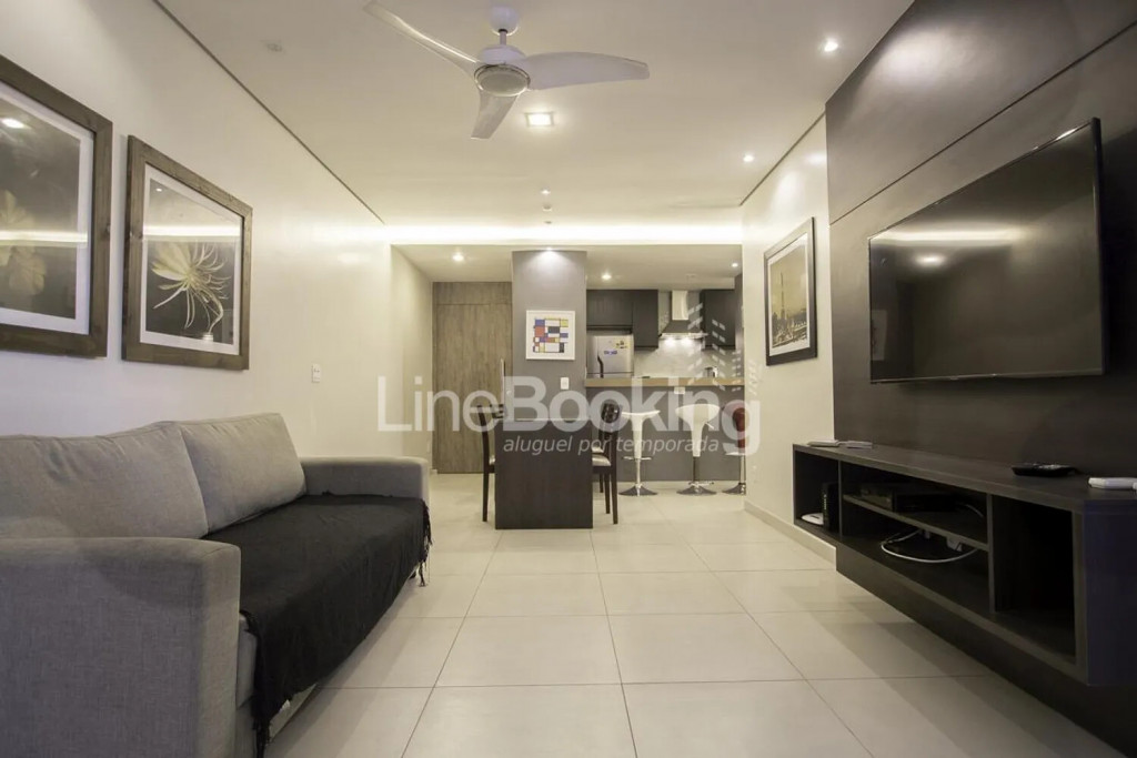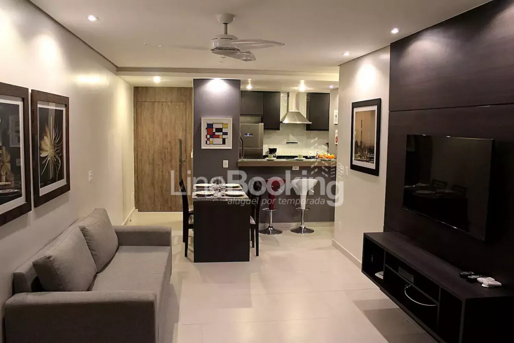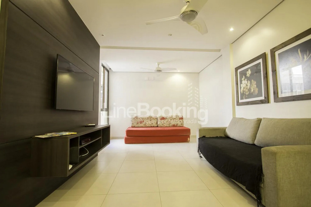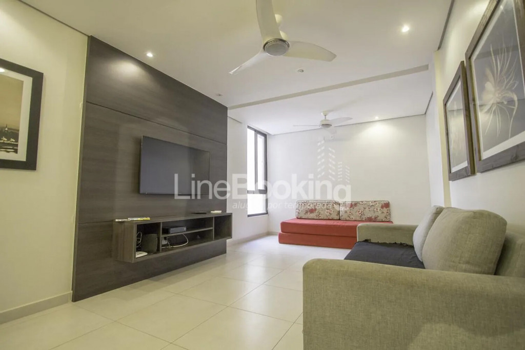 Sala - Sofá cama de casal, TV de tela plana com canais a cabo, wifi, painel, ventiladores de teto e obras decorativas, sendo integrada com a cozinha americana,