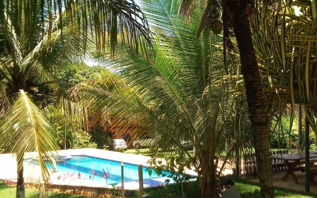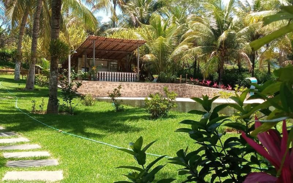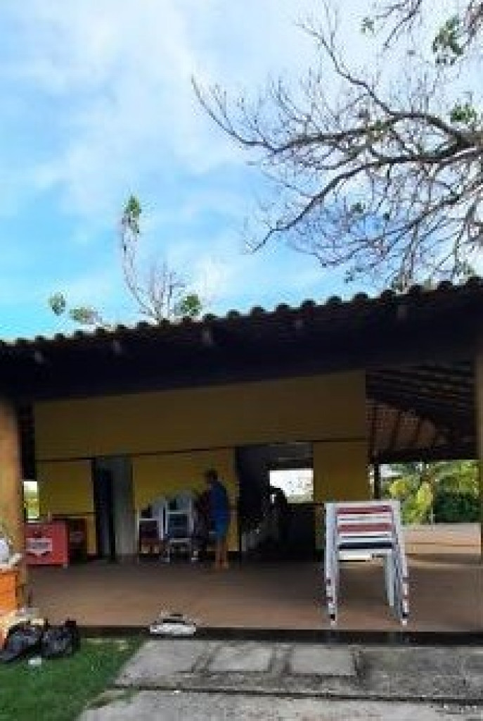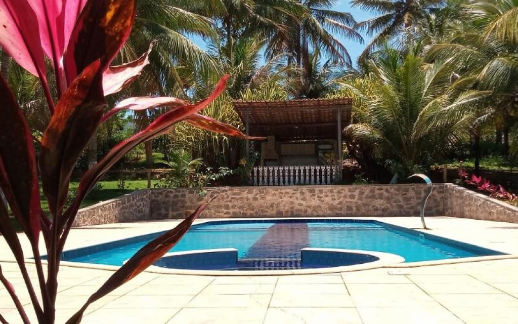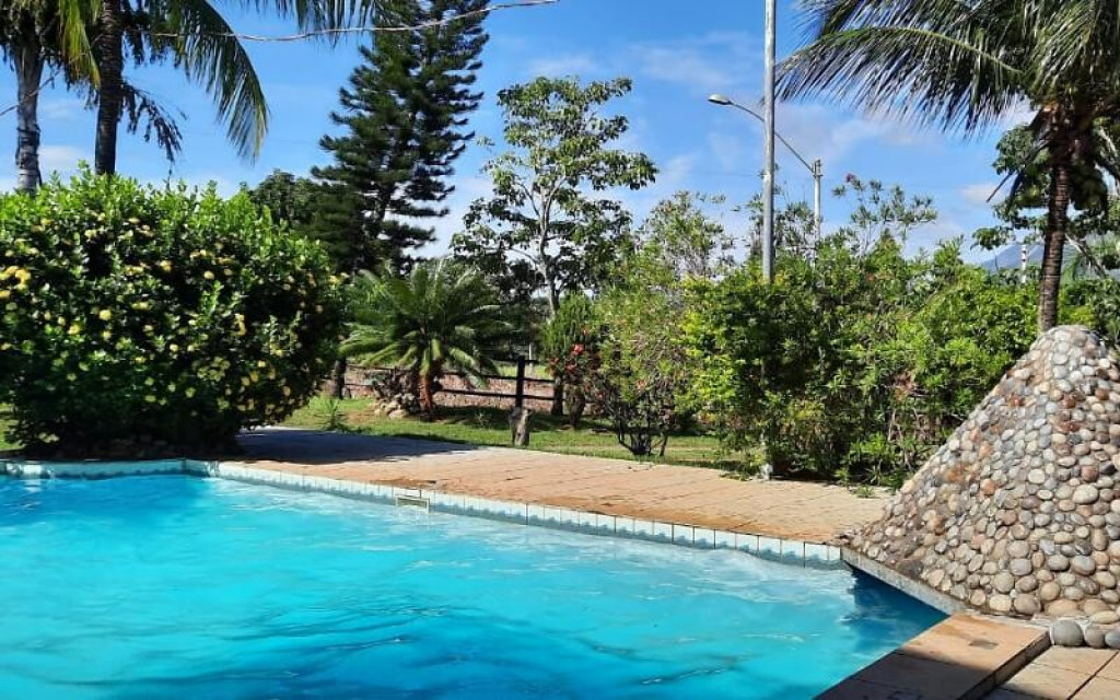 Sítio próximo ao trevo de Guarapari na Rod. Do Sol, com 9.000m2 com piscina e churrasqueira, área verde, casa com 4 quartos, sala, cozinha, varandão, alojamento para 50 pessoas, vários jardins.
