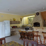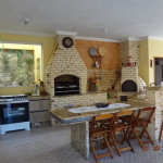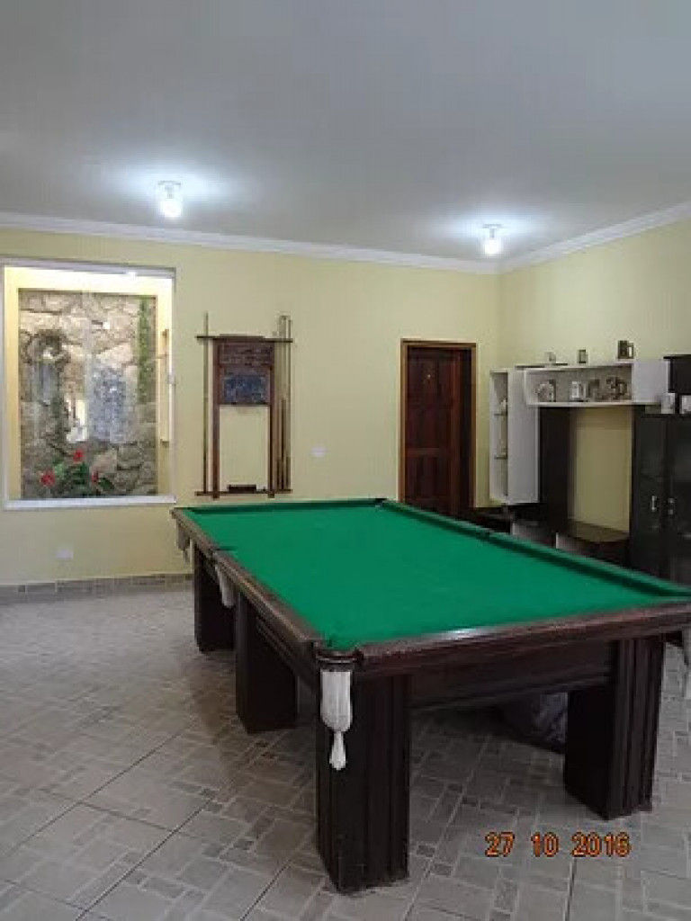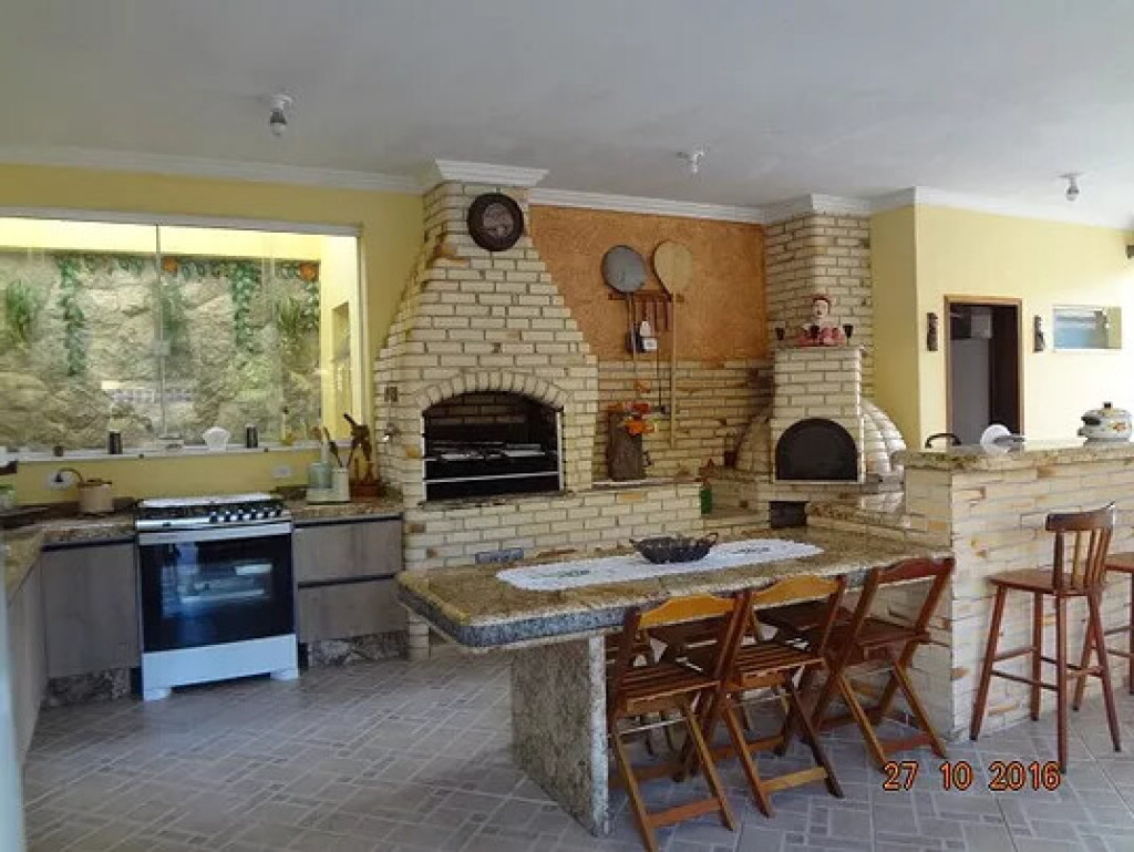 Área do churrasco, uma despensa, para mantimento, churrasqueira, forno a lenha, forno para Pizza, cozinha com moveis, salão de jogos, com banheiro. sob o salão de jogos e da churrasqueira.