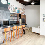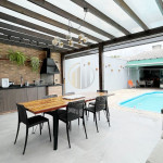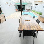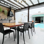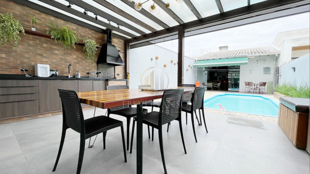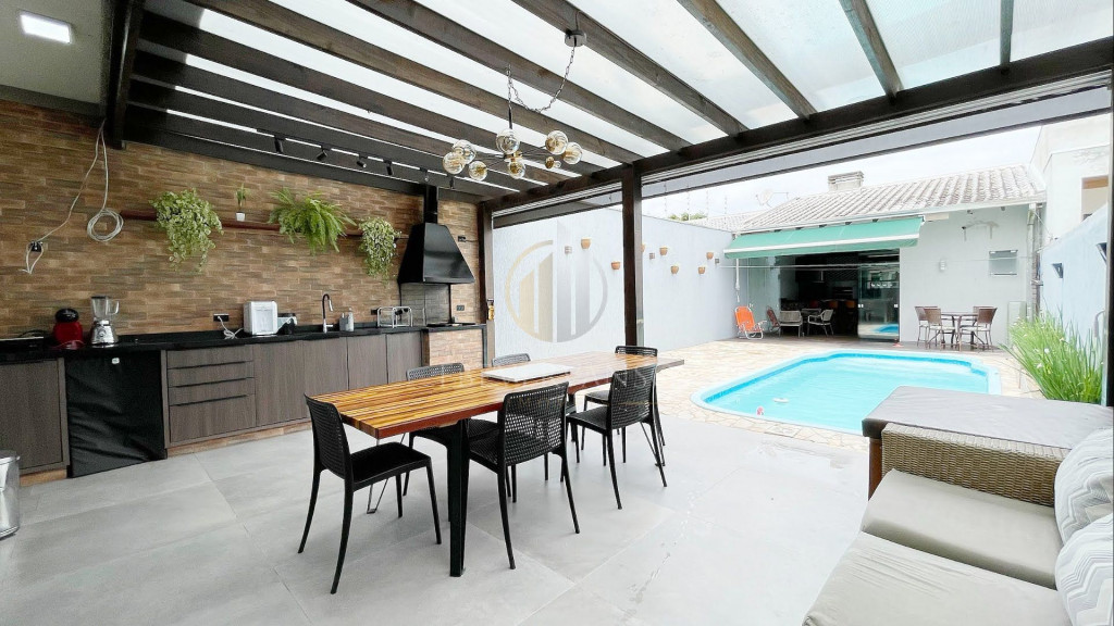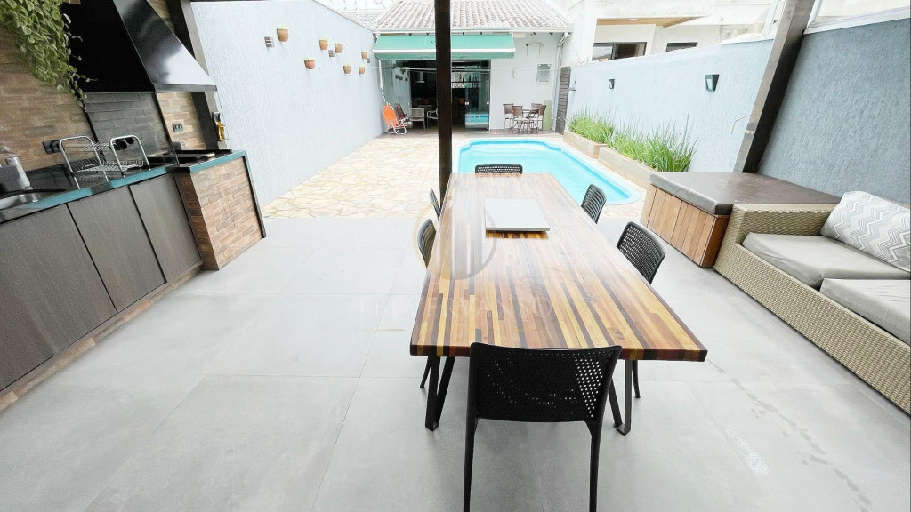 Aos fundos área de lazer contendo cozinha, churrasqueira e uma linda piscina
