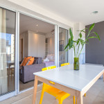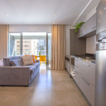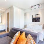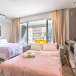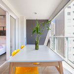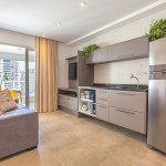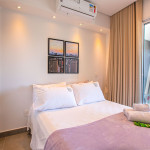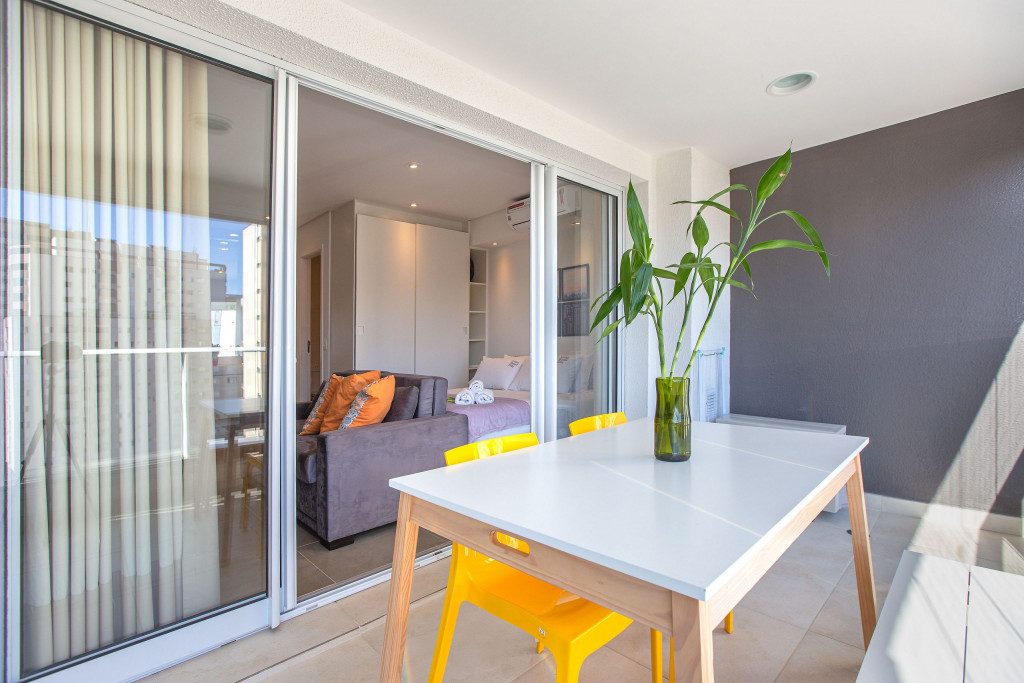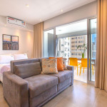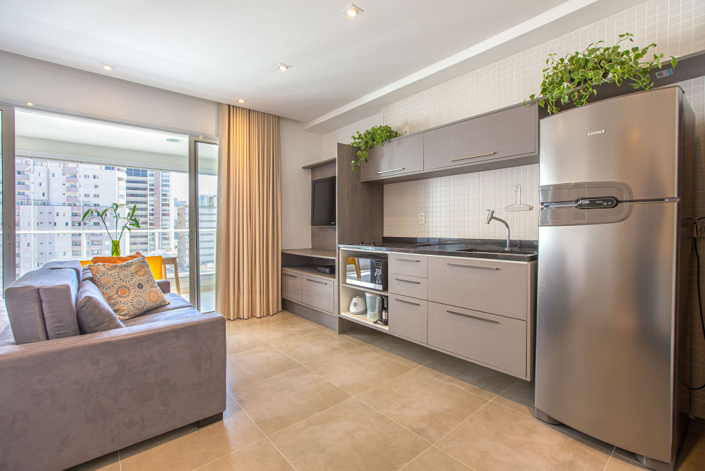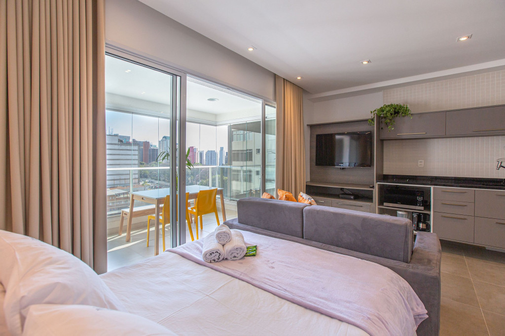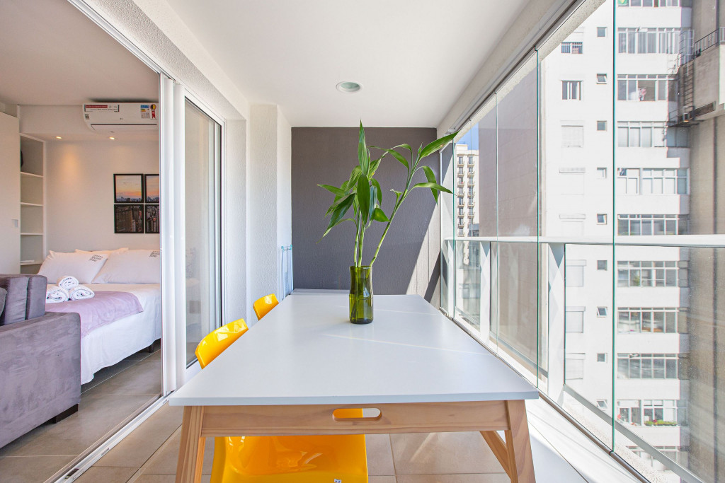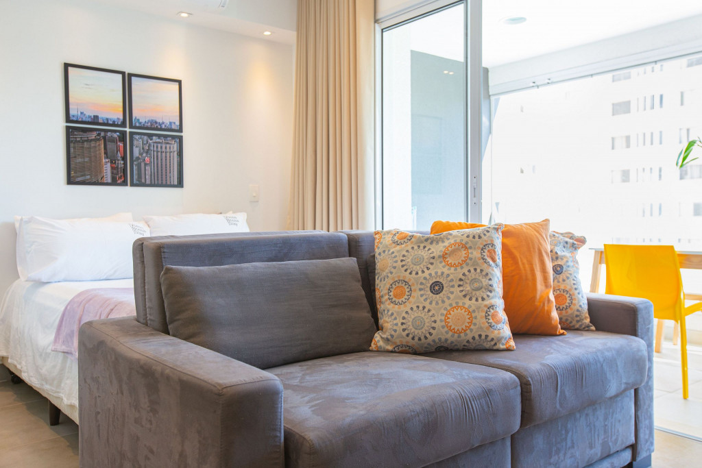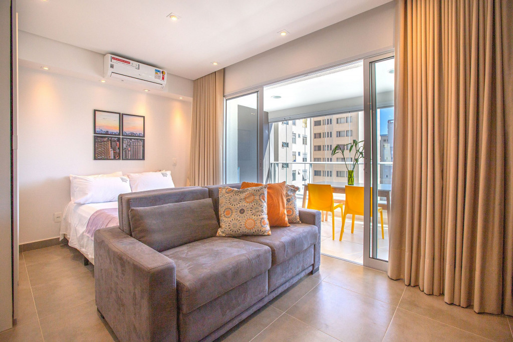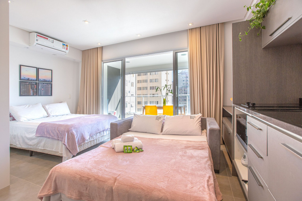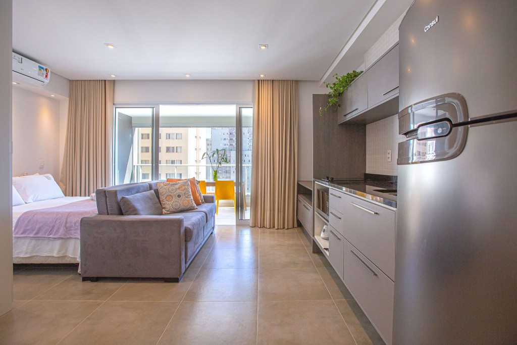 Apartamento estúdio espaçoso, decoração aconchegante e varanda. Cozinha aberta e bem equipada, cama confortável, boa mobília e ar condicionado.