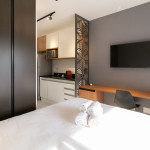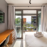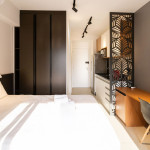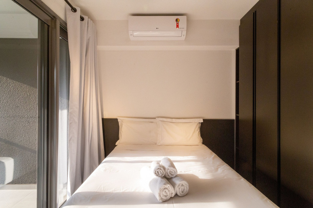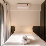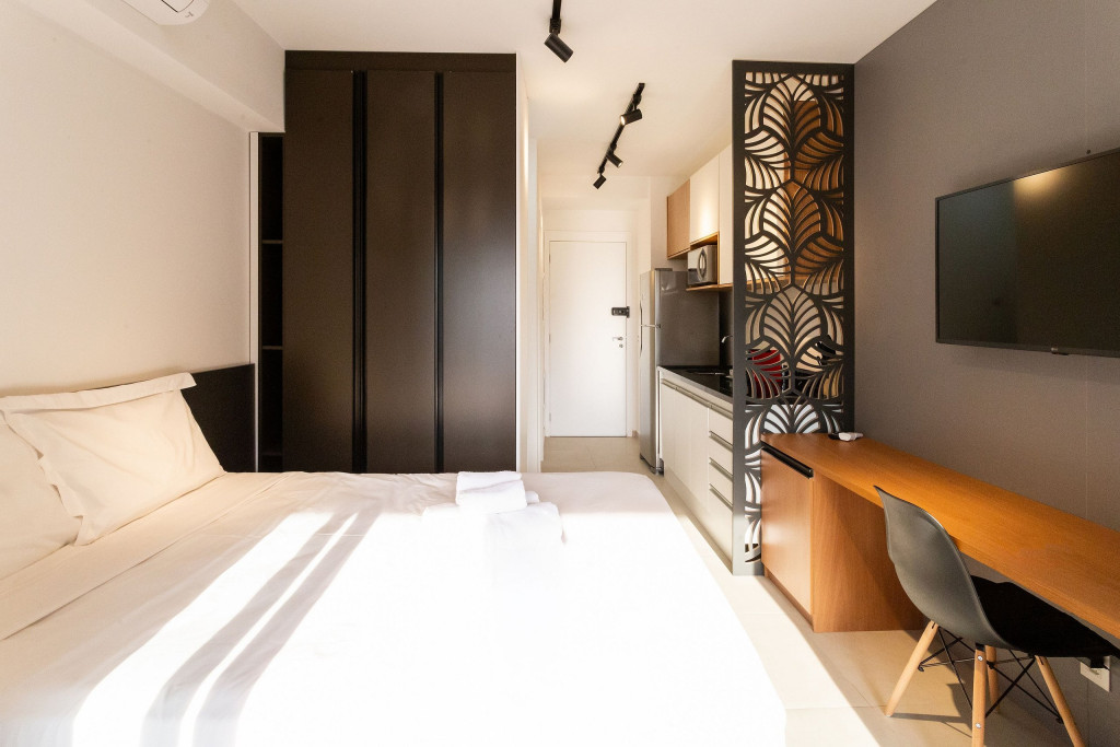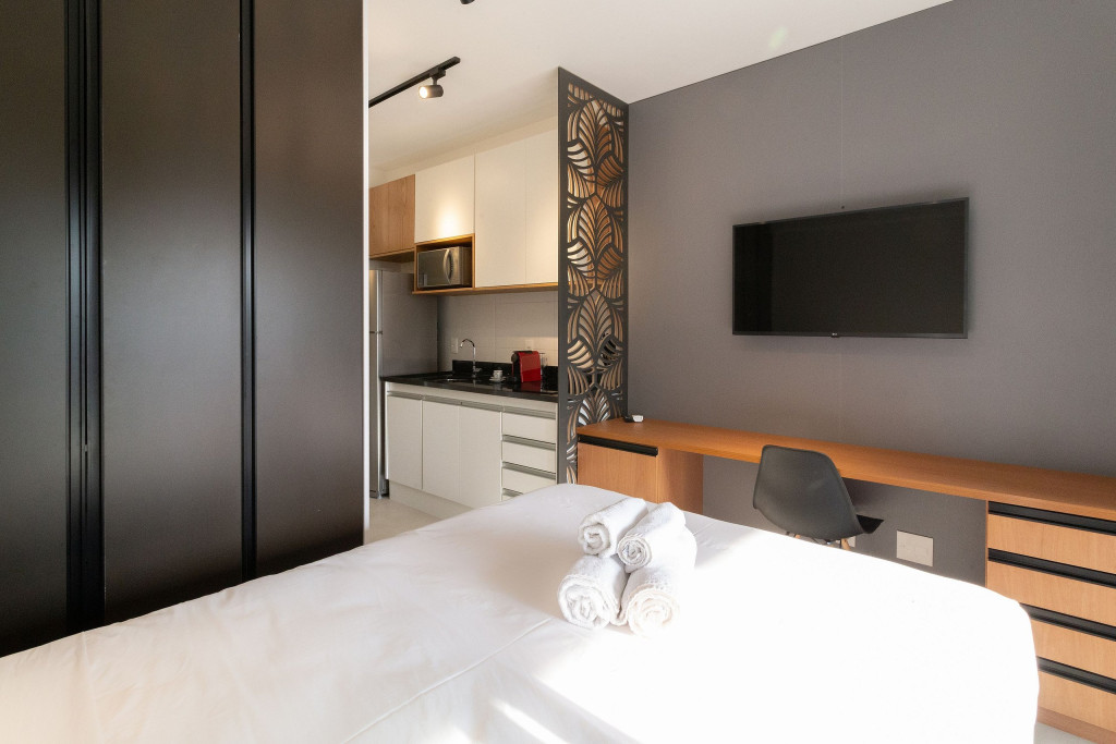 O ambiente do studio é em conceito aberto e acomoda até 2 pessoas em cama de casal.