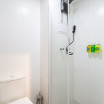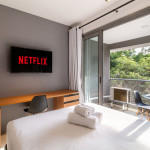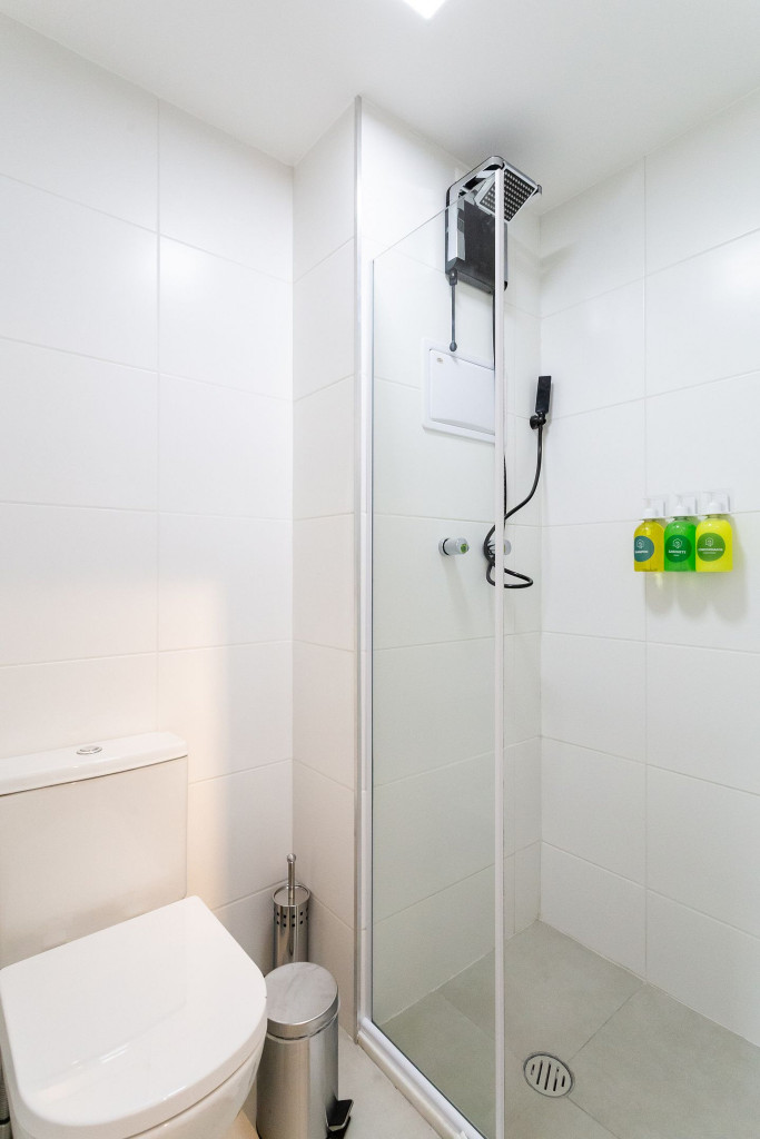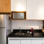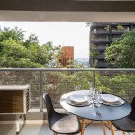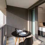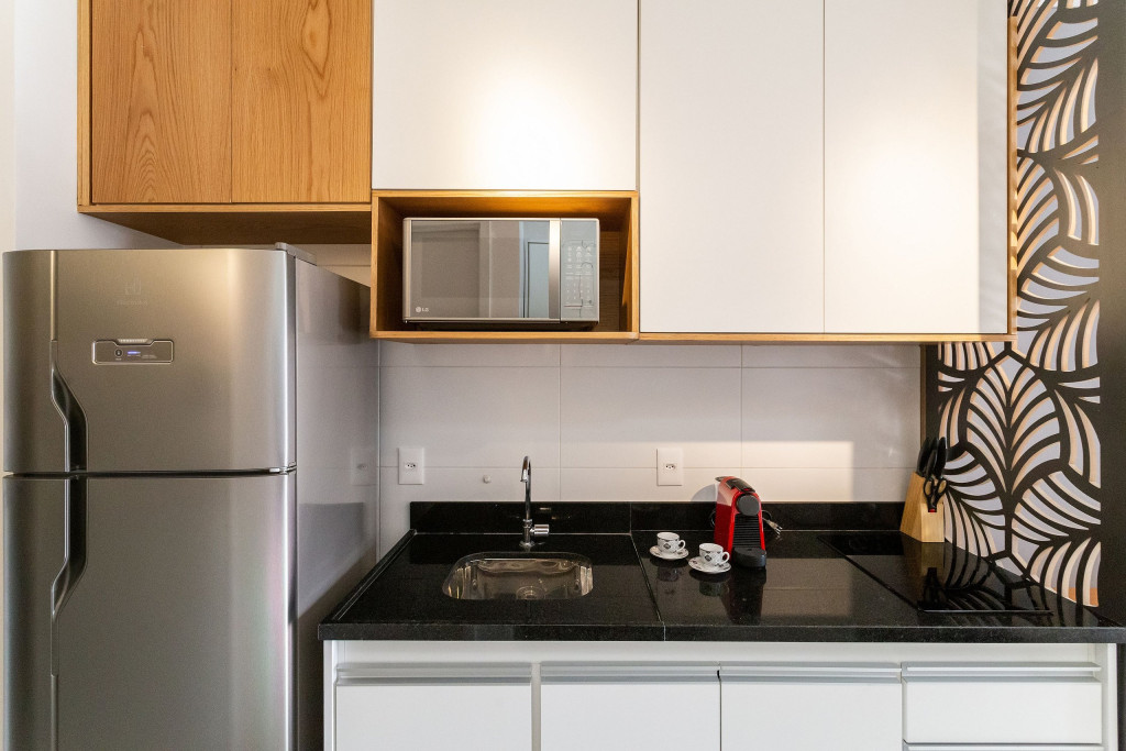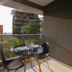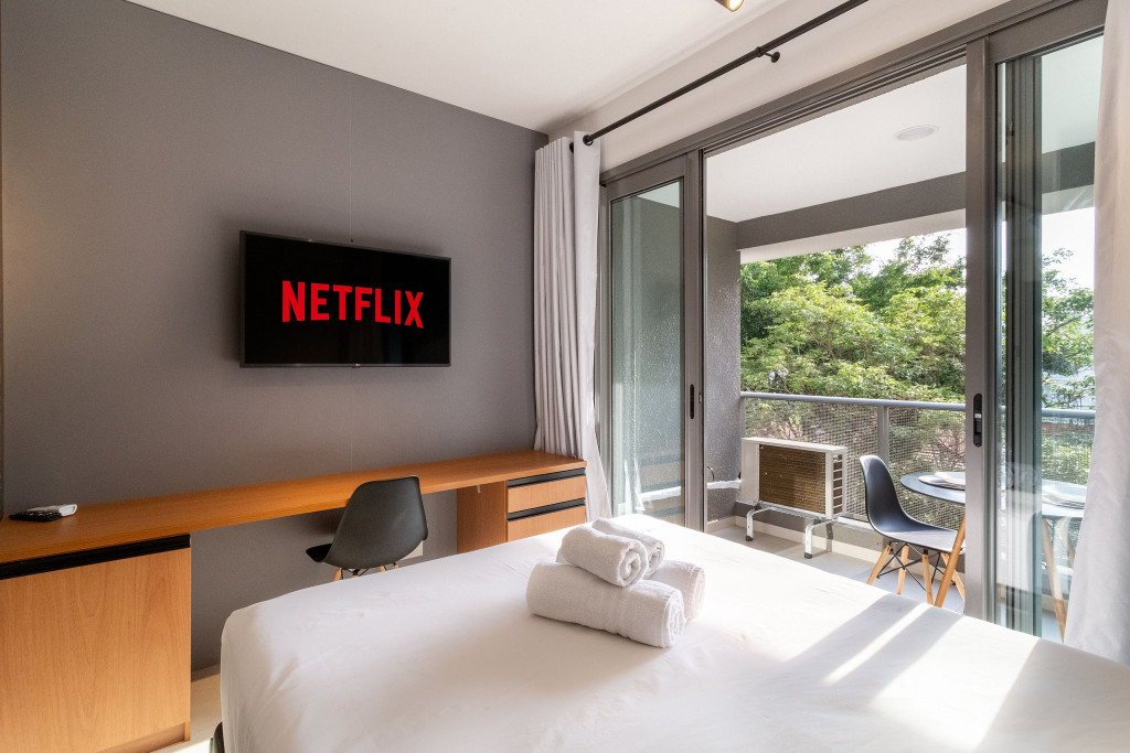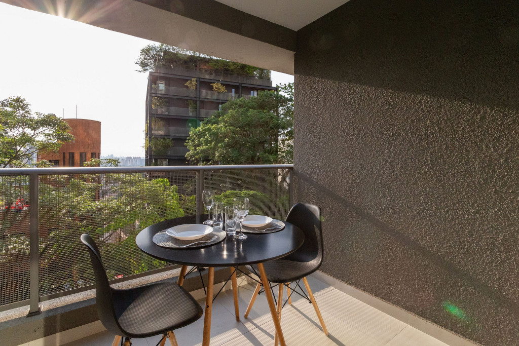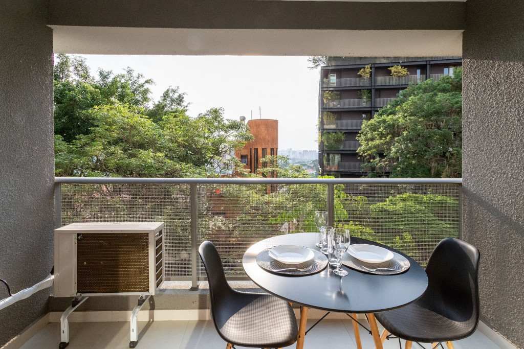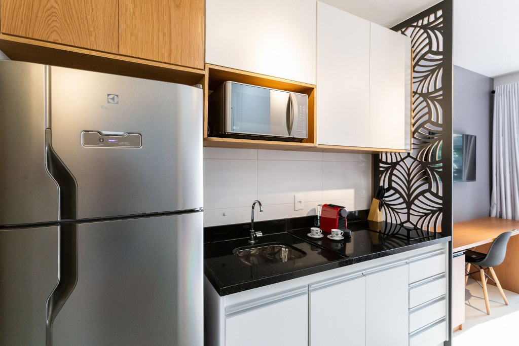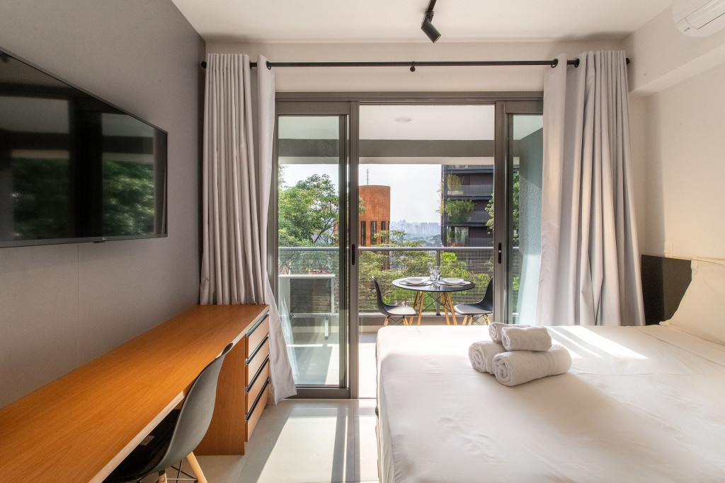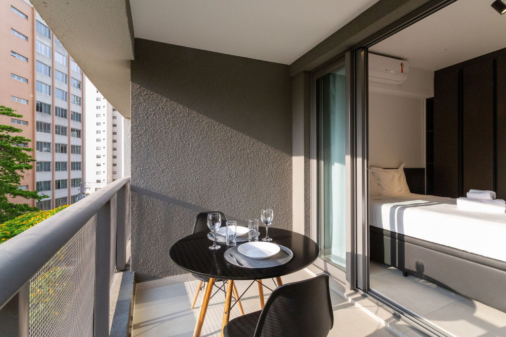 No mesmo ambiente dispomos de uma cozinha com utensílios necessários para uma estadia prática, banheiro, armário, escrivaninha para home office e TV Smart. Uma varanda com porta de vidro separa os espaços. No local, há uma mesa de refeição com duas cadeiras para usufruto do hóspede. Dispomos, também, de ar-condicionado quente e frio e WI-FI de alta velocidade.