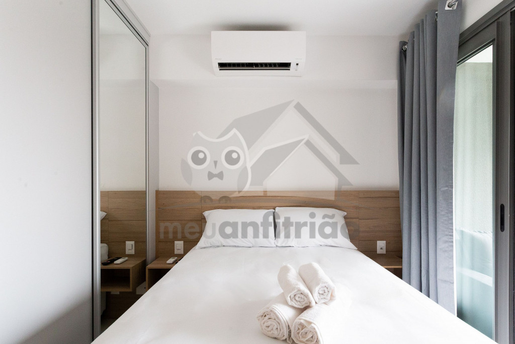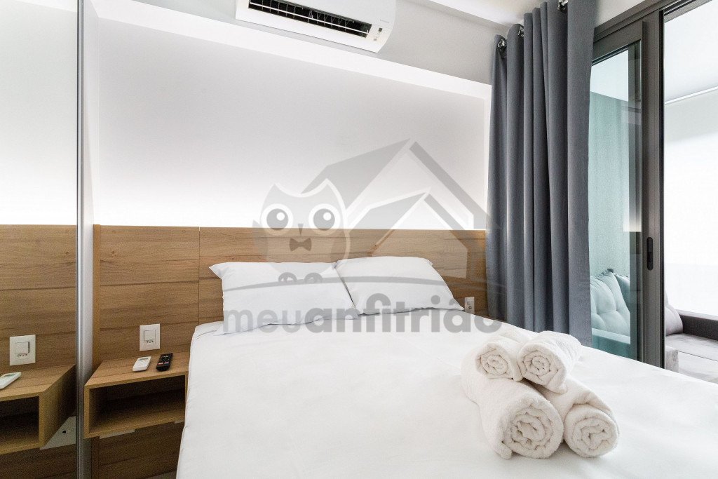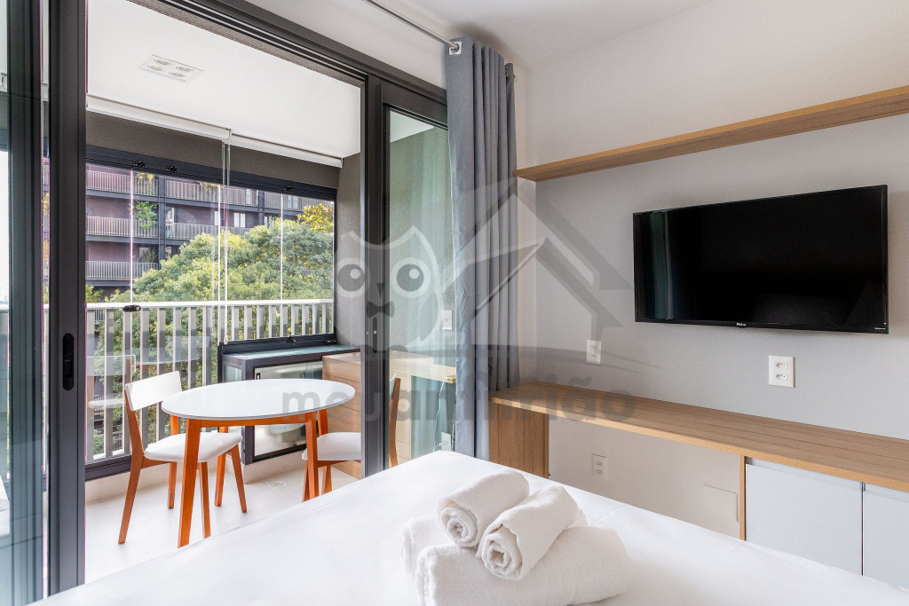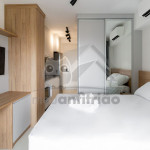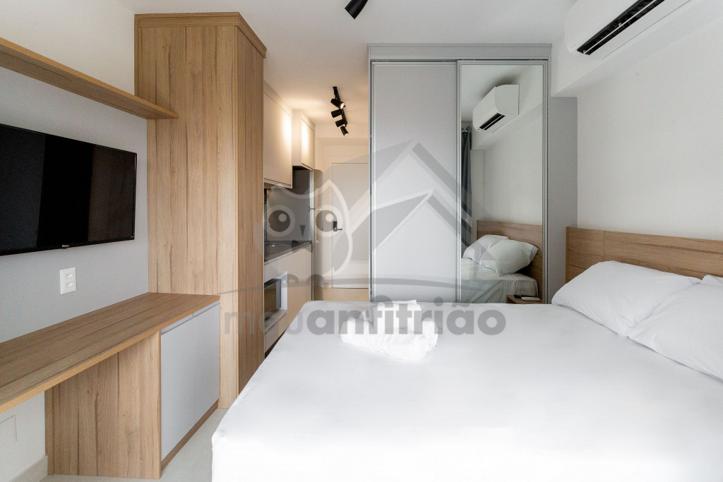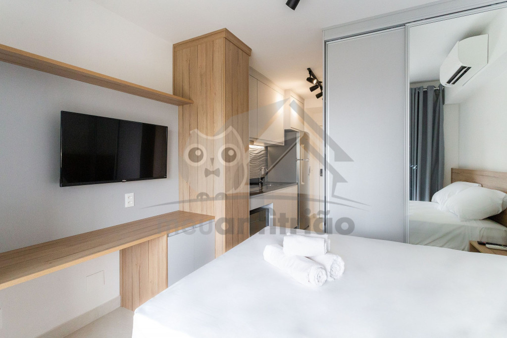 O studio é em conceito aberto e acomoda até 2 pessoas em queen. No mesmo ambiente dispomos de uma cozinha com utensílios necessários para uma estadia prática, banheiro, armário, escrivaninha para home office e TV Smart.